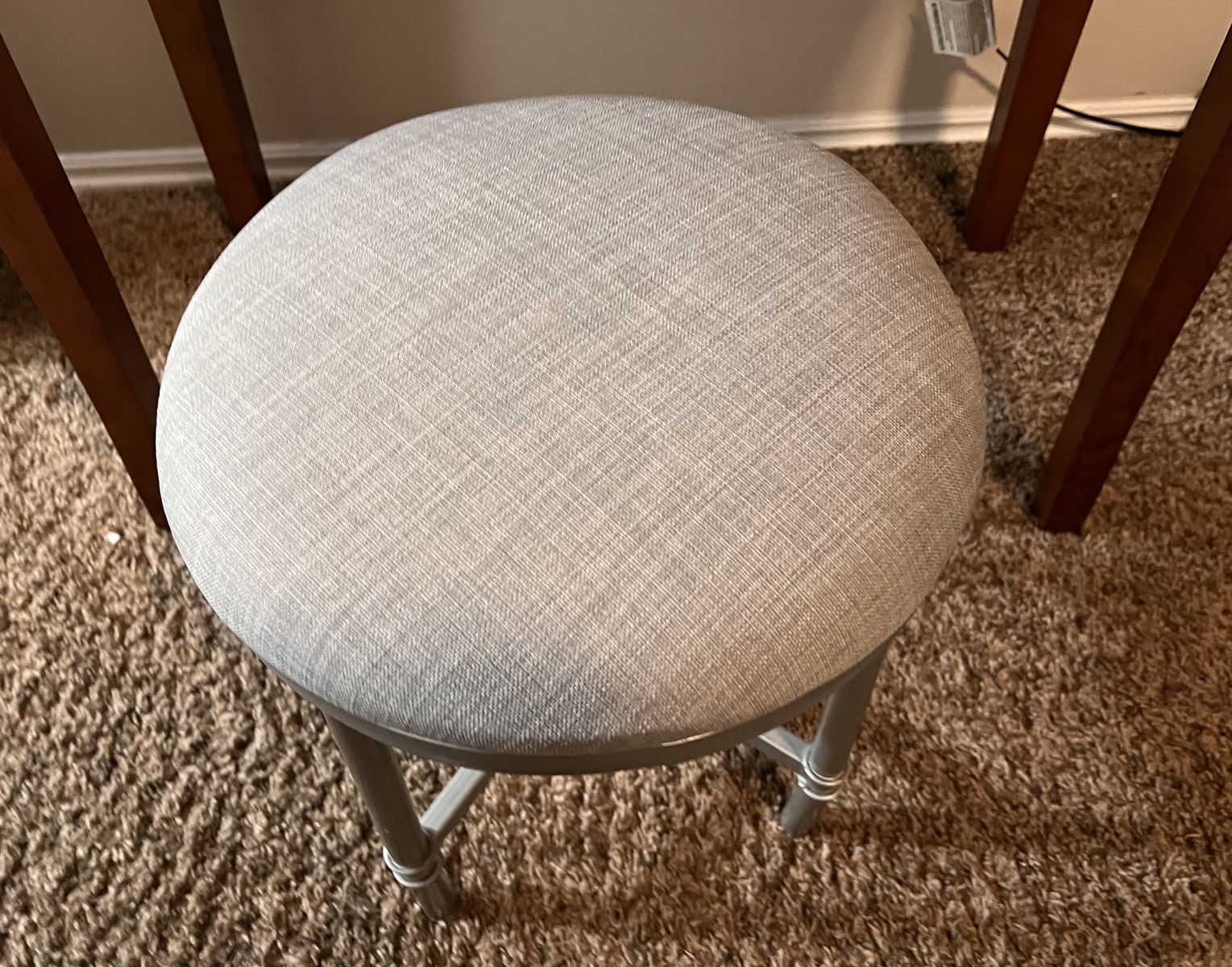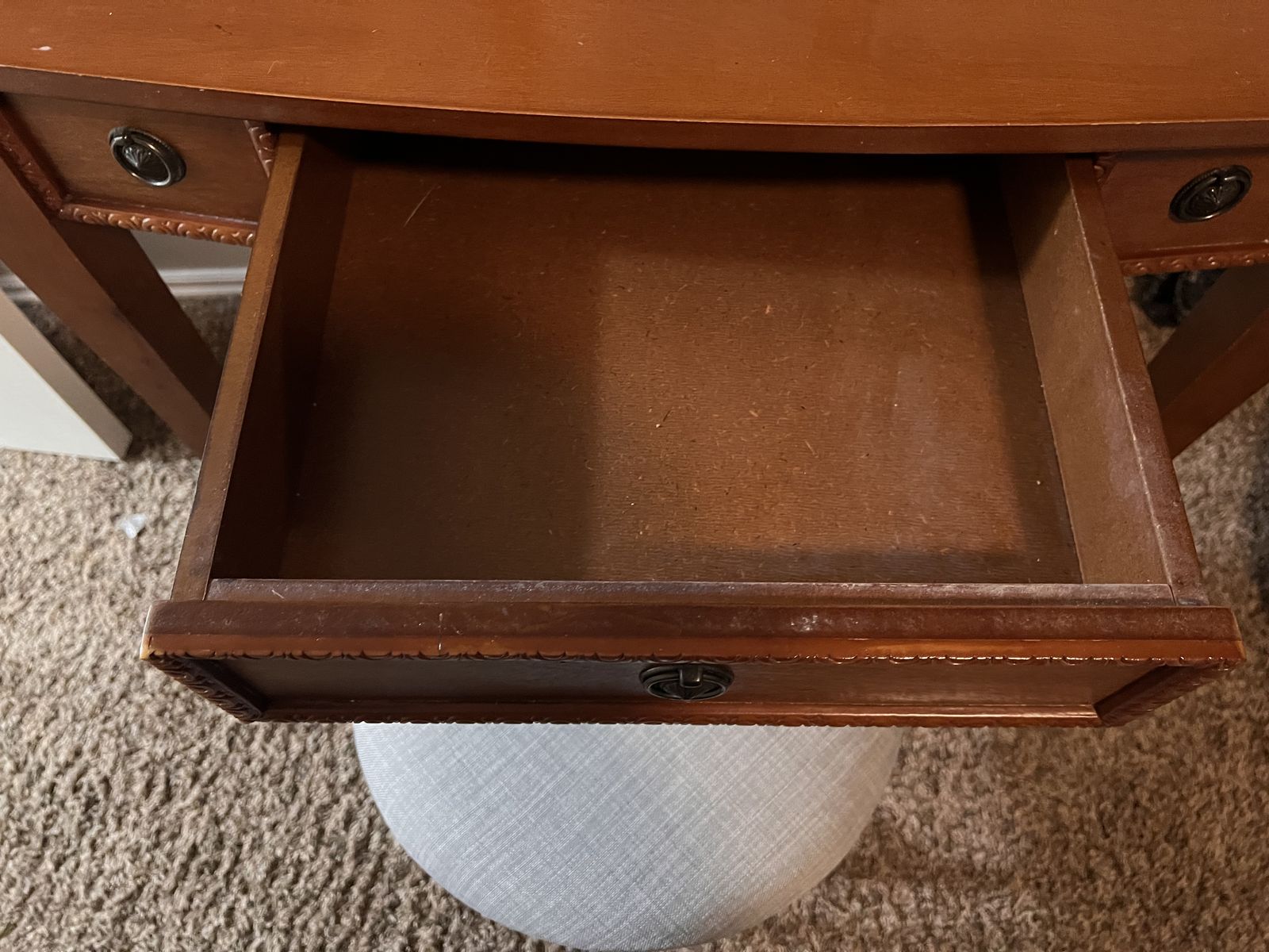 VenmoVanity dresser still in good condition. Needs a little TLC. Has one drawer. Comes with a gray, fabric turn-stool.