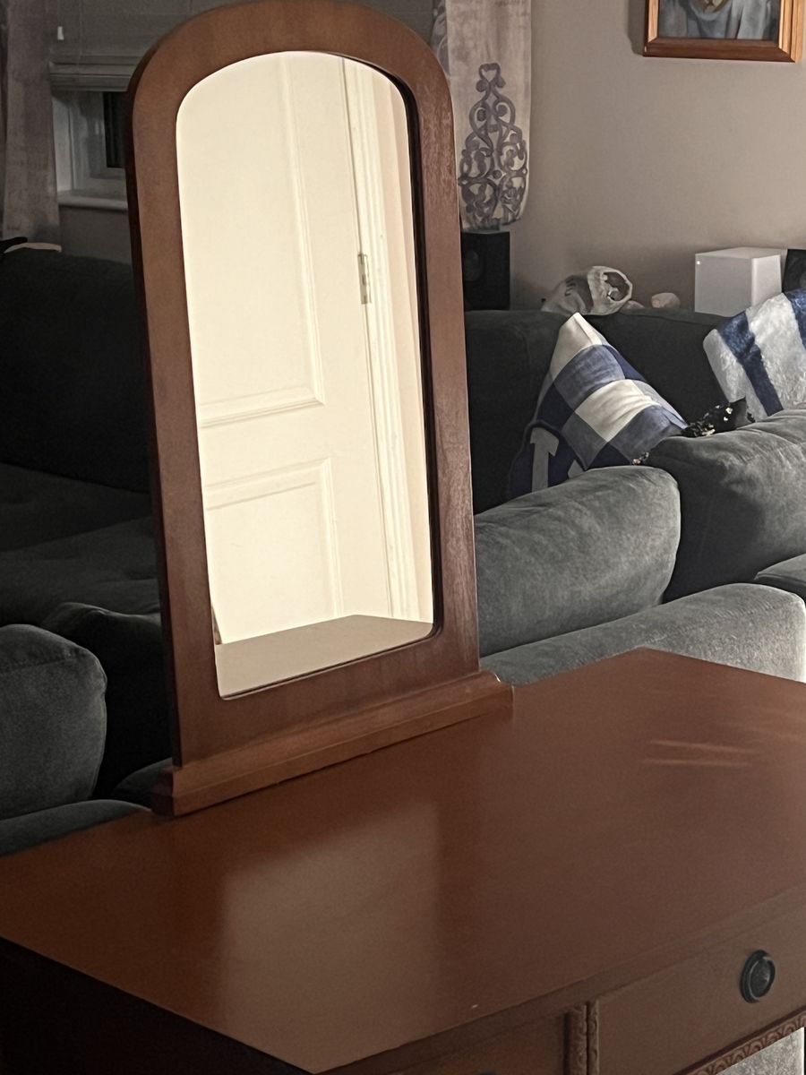 Tocador en buen estado. Necesita un poco de cariño. Cuenta con un cajón. Incluye un taburete giratorio de tela gris. Para recoger en West Jordan o Draper. 32” w x 30” h ( bottom of mirror) x 18” deep. Mirror adds 23”. Mirror is 15” w. Mirror can come off.