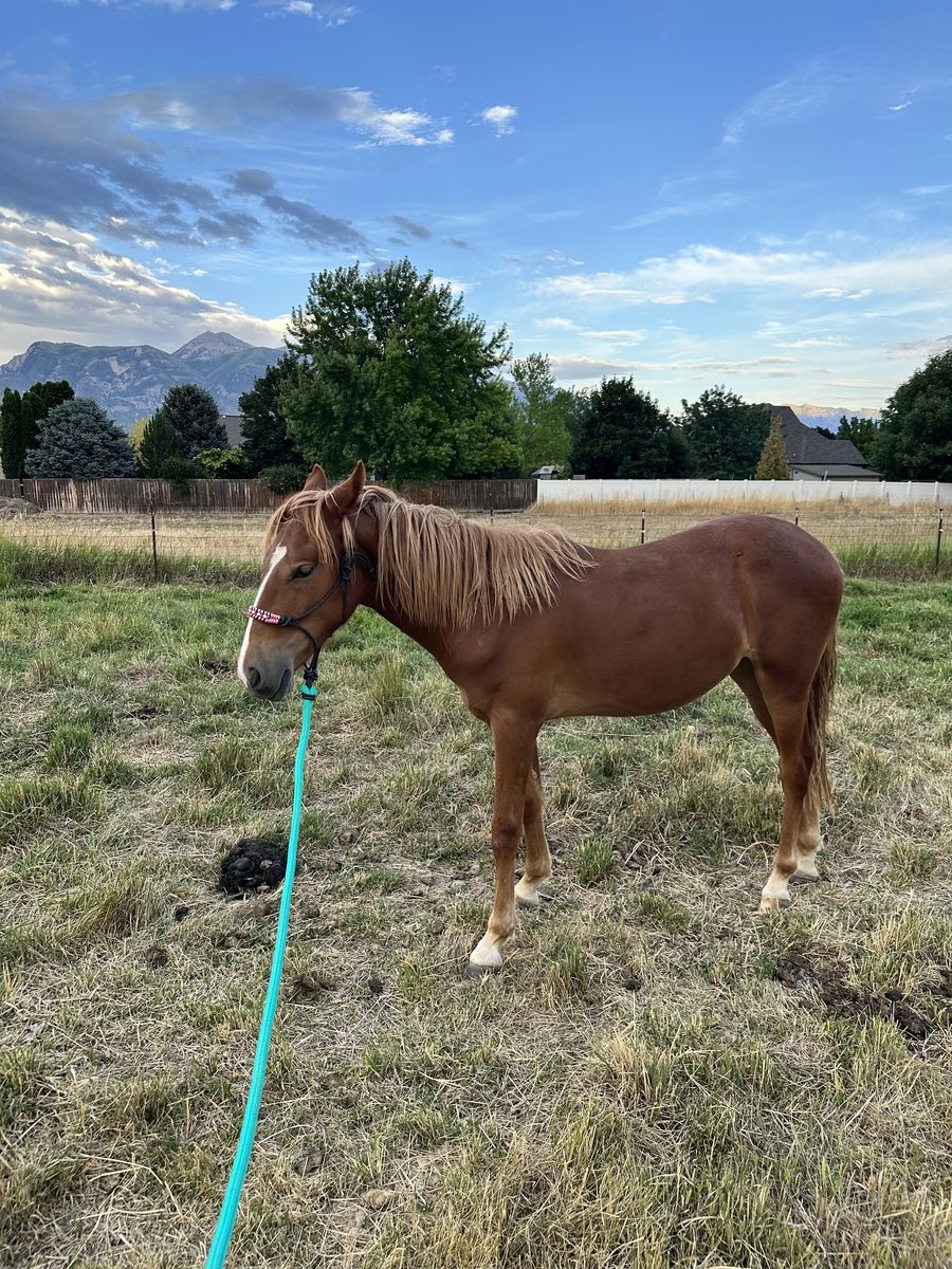 I adopted her when she was about 3 months old from someone who rescues abandoned foals. She is fun and happy. Halter broker, backs up well, great for the farrier. She is trailering pretty well too. I am selling her because I don't have the time and experience to start her.