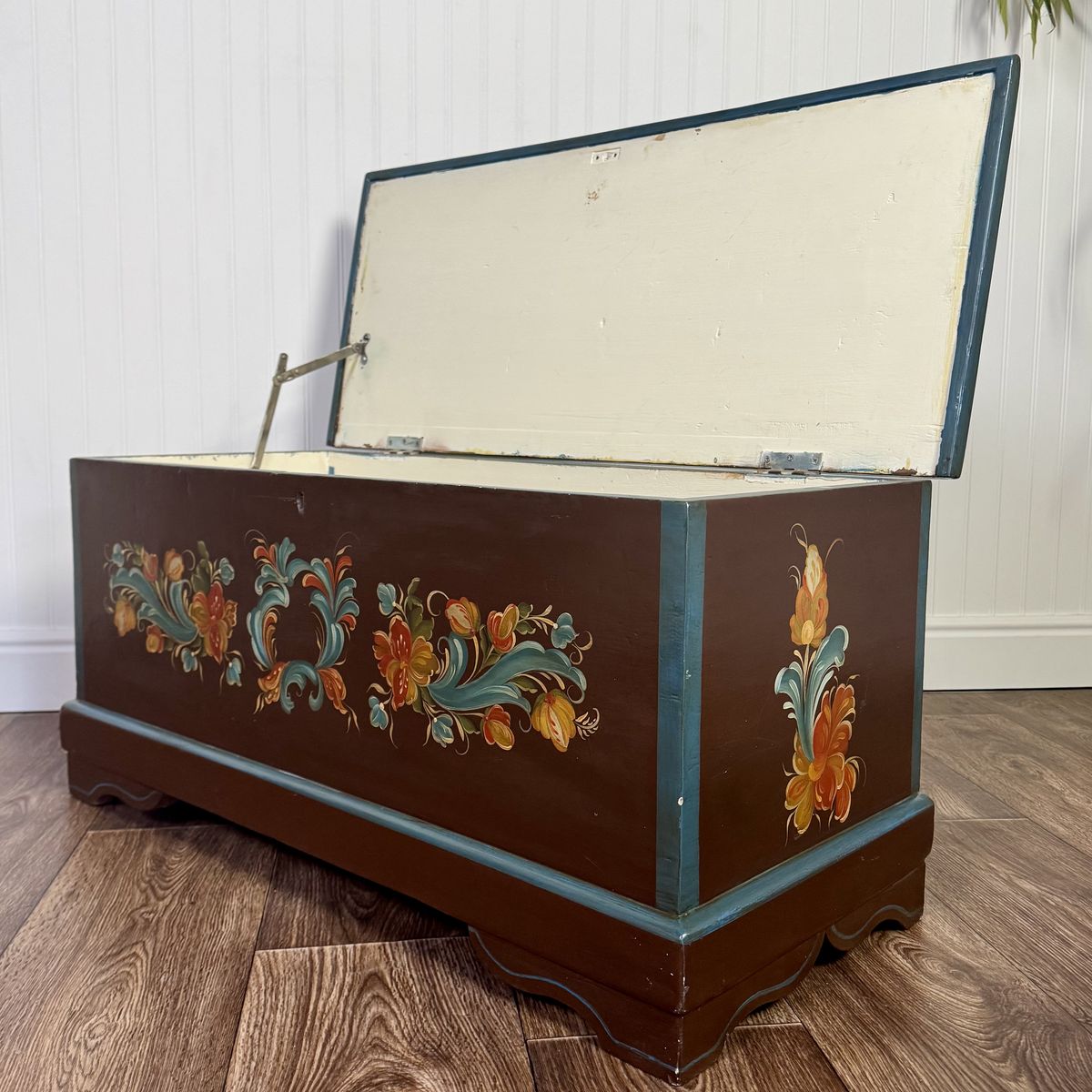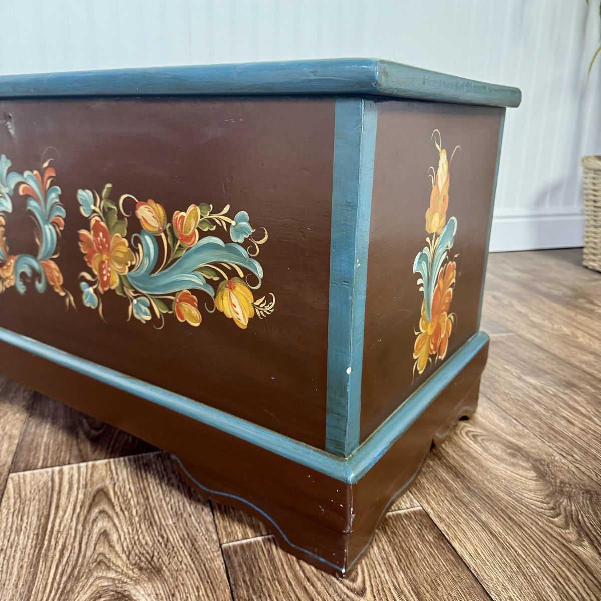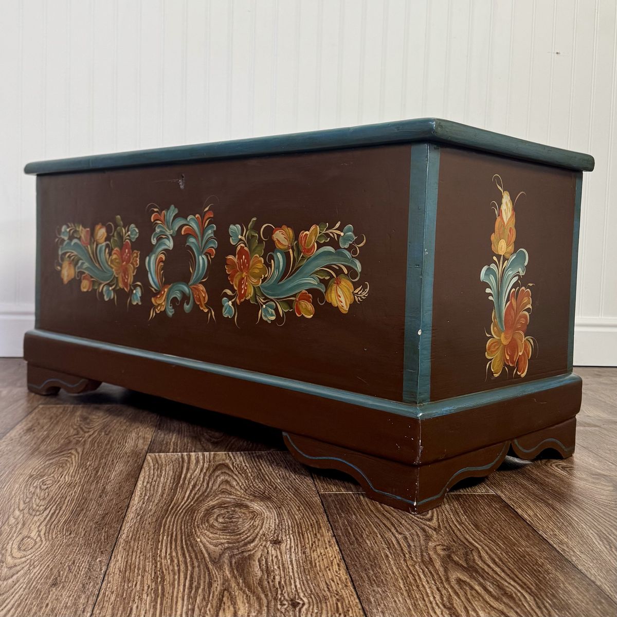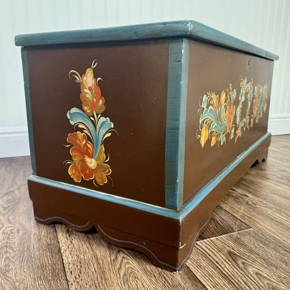 This trunk features a classic scalloped based with hand-painted teal trim. The floral motif appears on four sides of the trunk, and the artist’s signature appears on top.