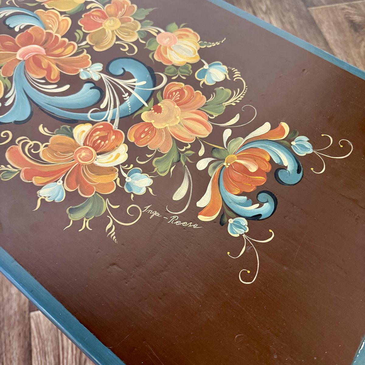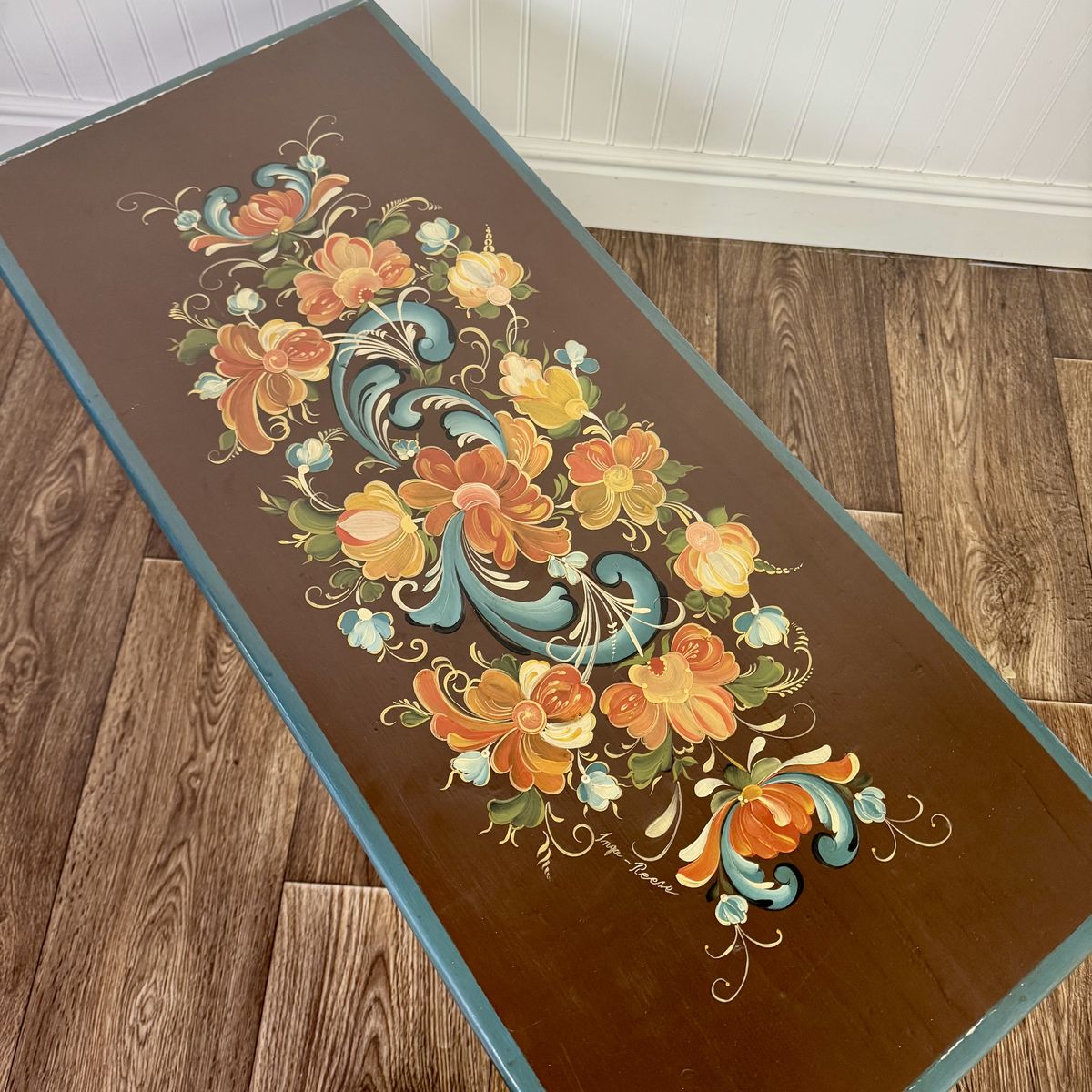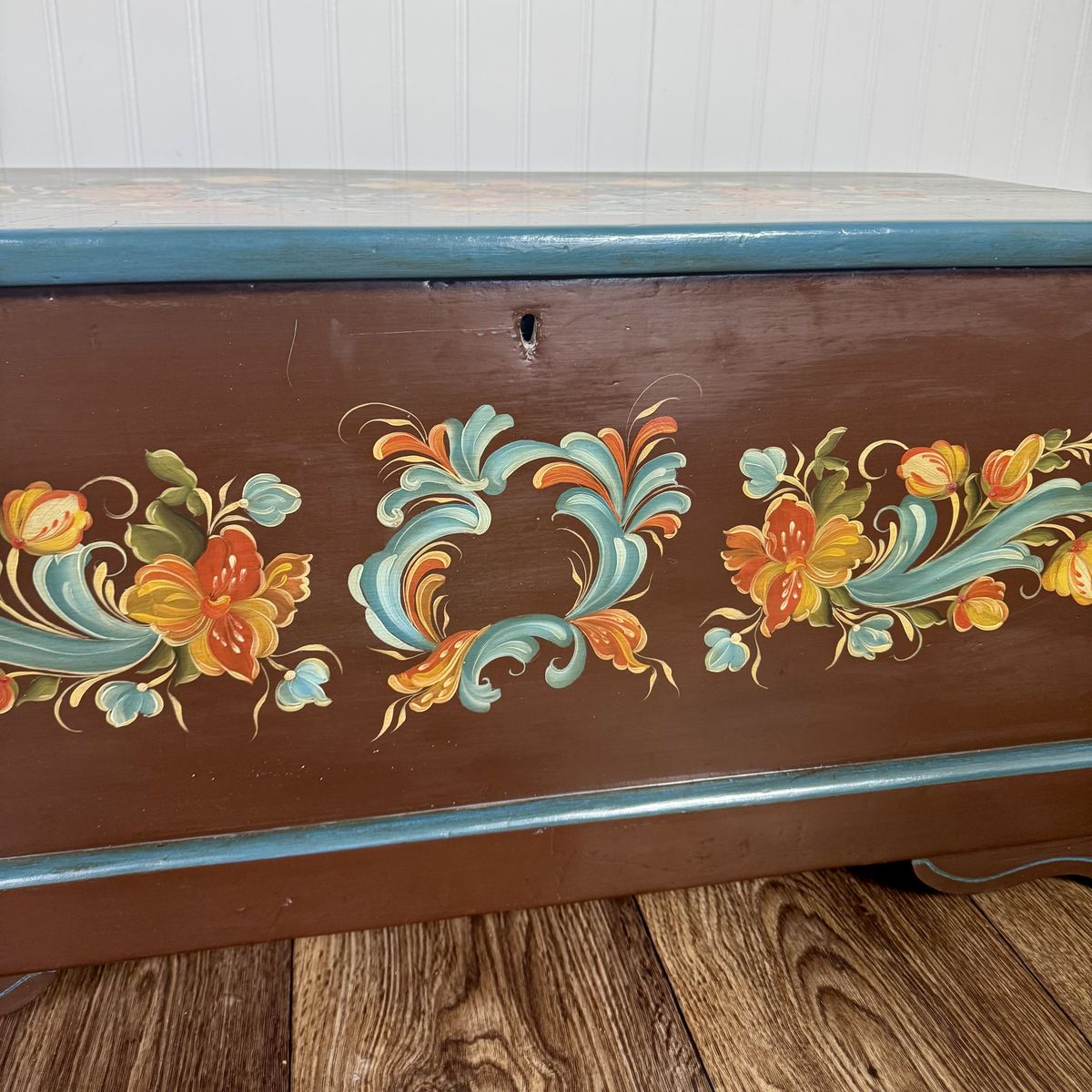 This trunk features a classic scalloped based with hand-painted teal trim. The floral motif appears on four sides of the trunk, and the artist’s signature appears on top.