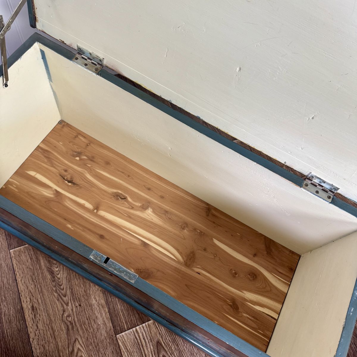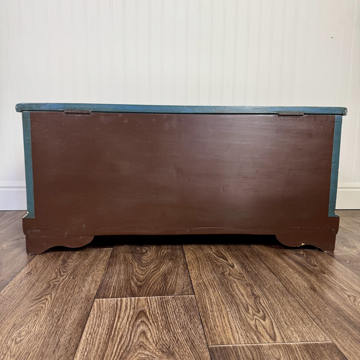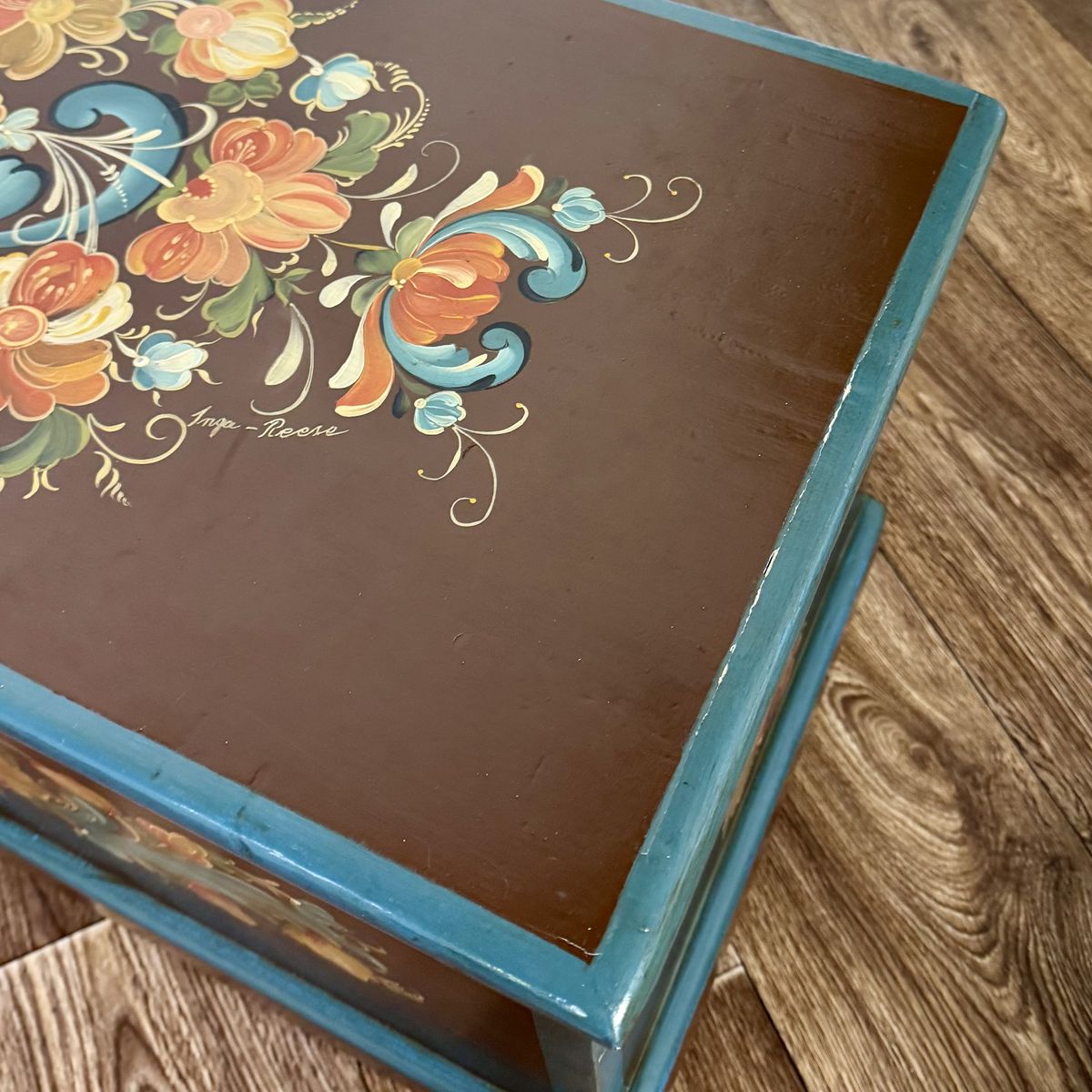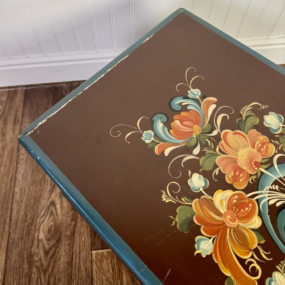 This trunk features a classic scalloped based with hand-painted teal trim. The floral motif appears on four sides of the trunk, and the artist’s signature appears on top.