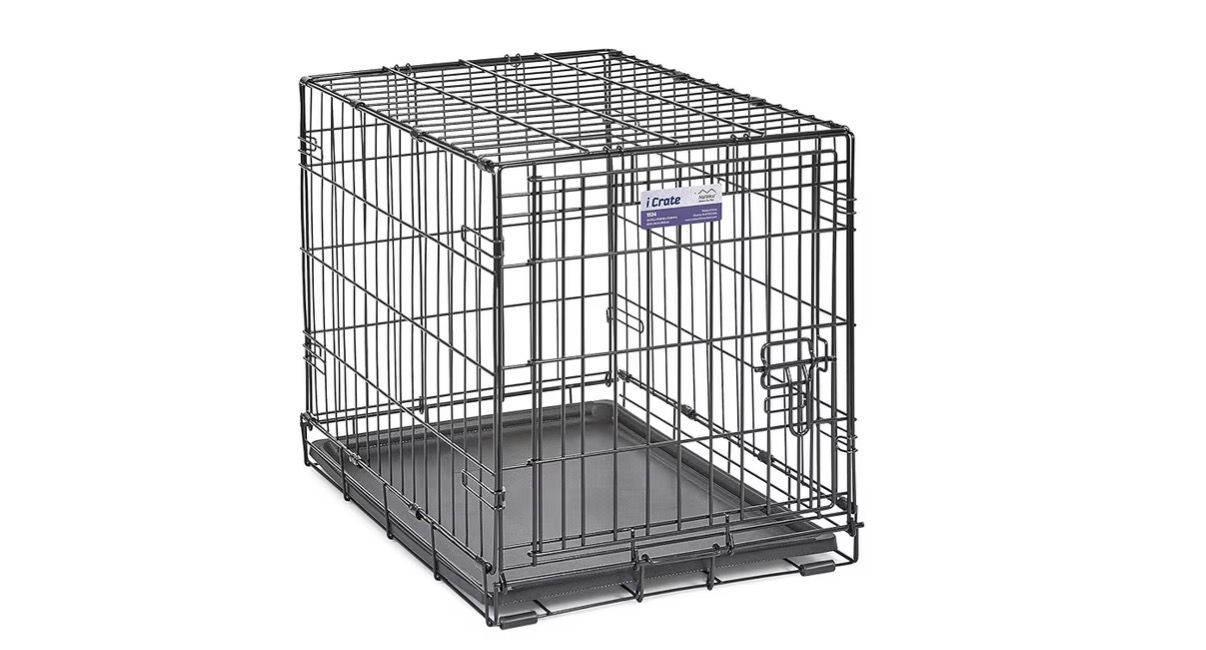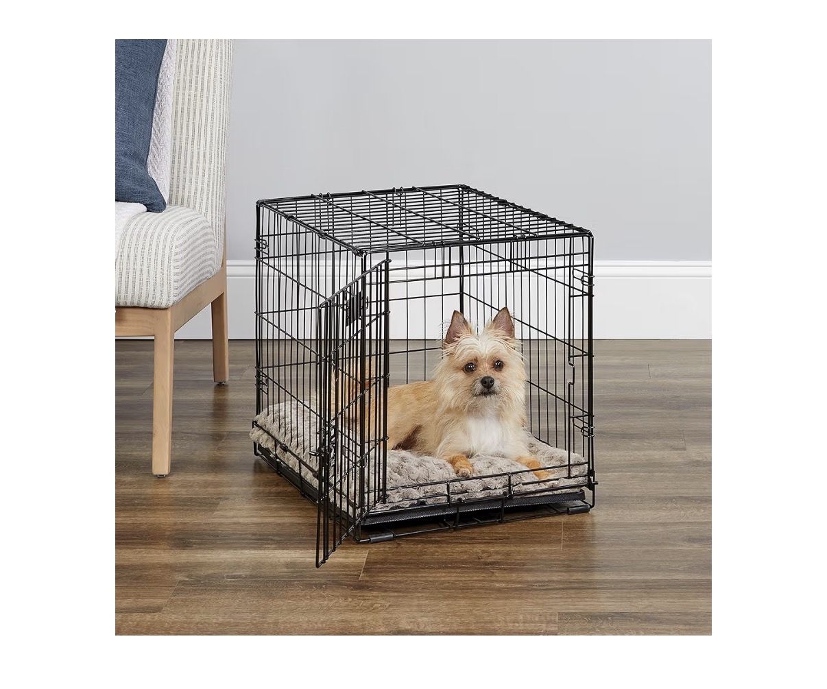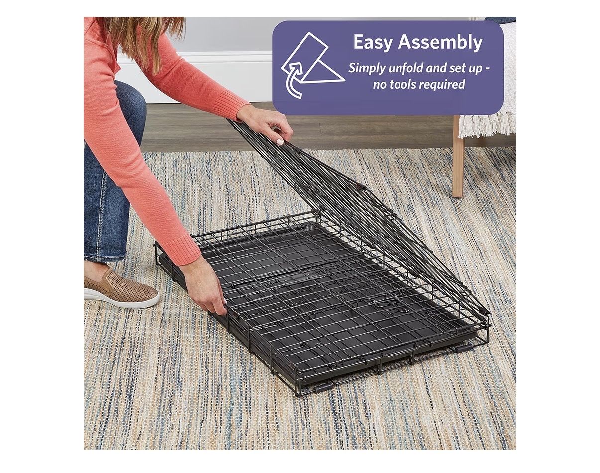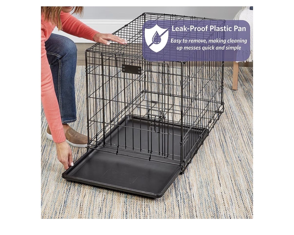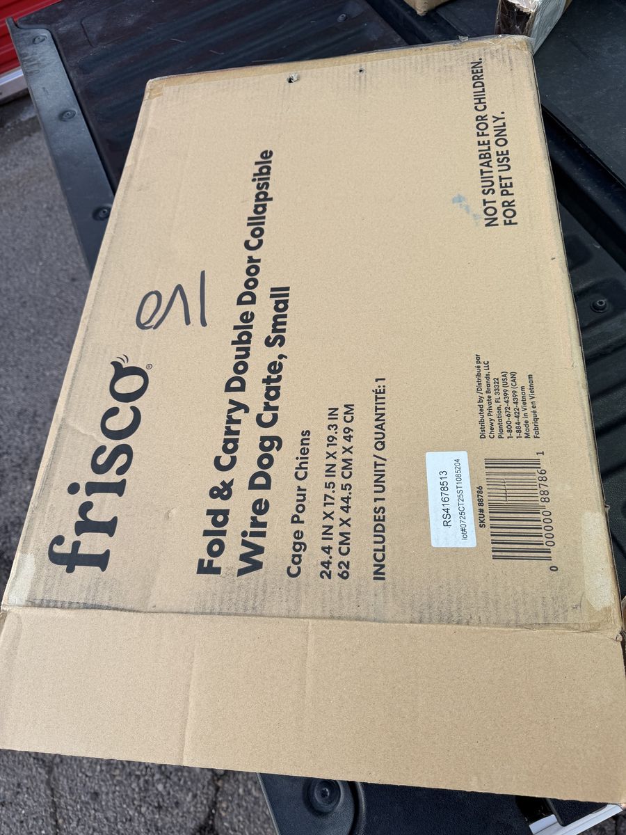 ZelleBrand new, never opened Frisco Double Door Dog Crate. This is the 24-inch Small model, perfect for puppies or small adult breeds. The double-door design gives you way more flexibility for where you place it in your home or car. Key Features: Dimensions: 24.4 L x 17.5 W x 19.3 H Double Doors: One front-facing and one side-facing door for easy access. Training Ready: Includes a divider panel that lets you adjust the living space as your puppy grows. Easy Cleanup: Comes with a durable, leak-proof removable plastic pan. Travel-Friendly: Folds completely flat in seconds—no tools required for assembly or breakdown. Safe & Durable: Strong steel construction with rounded corners and a protective black finish. YouTube YouTube +5 Best For: Ideal for dogs weighing 11–25 lbs, such as Boston Terriers, Jack Russell Terriers, or Dachshunds. Condition: New in Box (NIB)