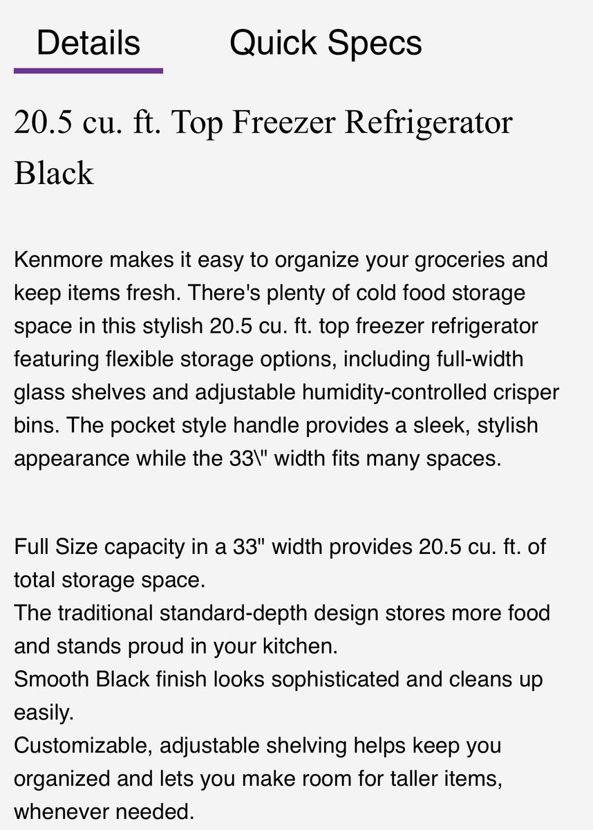 VenmoBRAND NEW IN BOX* Manufacturer- Kenmore Model Number- 61339 Description- 20.5 Cubic foot refrigerator/freezer in a black smooth finish. *ALTHOUGH THIS ITEM IS BRAND NEW THERE ARE A FEW MINOR SCUFFS AND ONE DING (ALMOST ENTIRELY ON THE SIDES) FROM SHIPPING. See photos for more product information and specifications. Regularly sells for $1099 (but currently ON SALE for $899.98) plus sales tax at appliancesuperstore.com. SAVE AN ADDITIONAL $300 OFF THEIR SALE PRICE HERE! As a business we are required to collect sales tax on all items sold. Text or call Brian at 801-512-0688 for assistance. How do we sell BRAND NEW PRODUCTS at such low prices? We have a contract with a product liquidation company and are able to purchase surplus, overstock and brand new products with distressed boxes/packaging by the truck load at a volume discount. We then inspect every product and pass the savings on to our customers. Our inventory turns fast with some products selling out quickly and new products coming in regularly. Our products range from every day items such as home furnishings, decorating, sporting goods, automotive, industrial, etc. to one of a kind and unique items. Click on the “More From Seller” link to see our complete current inventory. We offer an additional discount to customers who purchase multiple products at the same time. Delivery is available from Salt Lake City to Provo for an additional $50 fee regardless of the number of items you purchase. We accept cash and Venmo as payment. All items are first come first served but we are happy to hold an item for you with a full pre-payment via Venmo if you’d like to purchase an item but can’t pick it up until later in the day or week. Although we do inspect every item to the best of our abilities prior to listing it, we do HIGHLY suggest that you completely inspect your purchase prior to leaving as all products are sold as is and are NON-RETURNABLE.