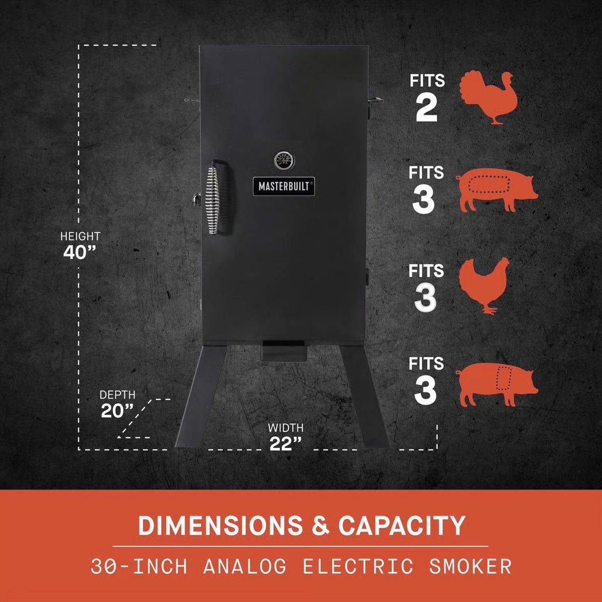 Remove the complication of achieving perfectly smoked bbq meats with the Masterbuilt 535 Analog Electric Smoker. With an electric power source and an easy-to-use analog dial, simply plug in your smoker and set your temperature up to 275F to begin smoking your favorite foods. The vertical body design allows heat and smoke to circulate evenly, leaving you with tender meats and flavorful veggies. With a removable ash tray and a water bowl to catch food drippings, cleanup is a breeze. From holiday smoked meats to summertime dips, master the art of outdoor smoking with Masterbuilt.