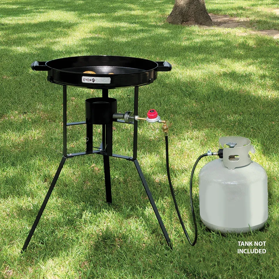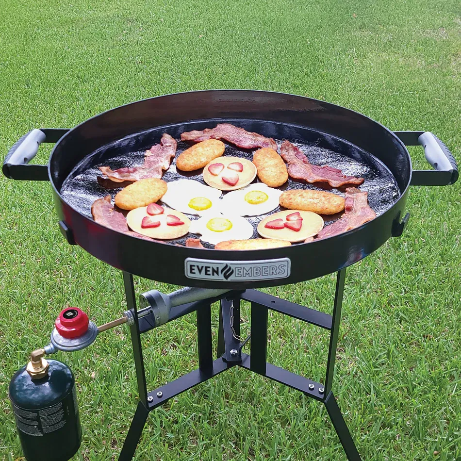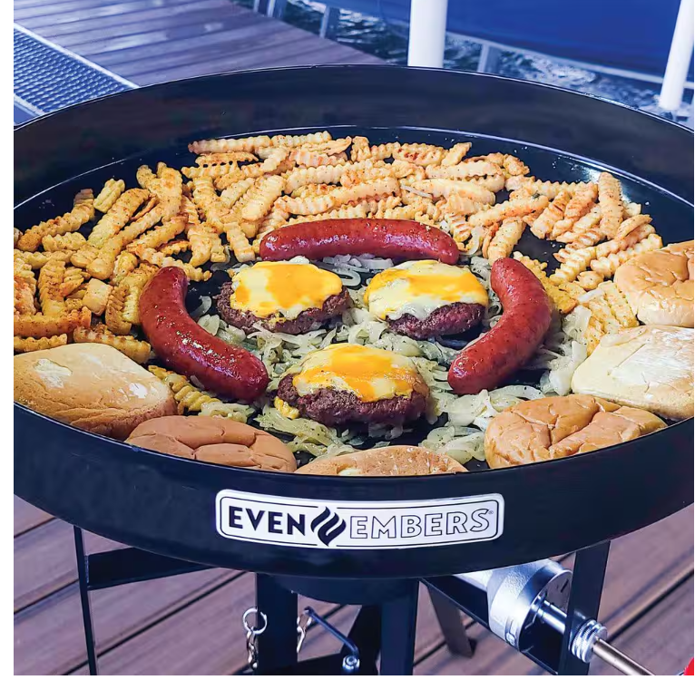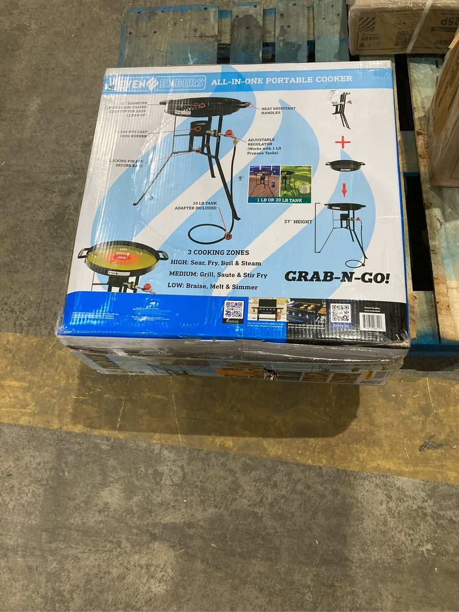 Cook like a pro wherever you go with the Even Embers Portable Grab-N-Go Grill, the ultimate companion for outdoor cooking enthusiasts. With a generous 22 in. Dia cooking surface (380 sq. in. of cooking space), this versatile cooker allows you to fry, grill, stir fry, simmer, saute, sear, melt, boil, steam, and braise, all in one compact unit. Designed with convenience in mind, the stand collapses and folds flat for easy storage, making it perfect for tailgating, camping, RV-ing, hunting, fishing, picnics, BBQs, and more. Featuring three distinct cooking zones (high, medium, and low) powered by a single 14,000 BTU burner, you'll have the control and flexibility to cook any meal to perfection.. Accessories Included: No Additional Items Included. Assembly Required: No. Color: Black. Fits No. of Burgers: 24. Front/Side Shelf: None. Grill Color Family: Black. Grill Grate/Surface Material: Steel. Grill Material: Steel. Grill Wheels: None. Grill/Smoker Category: Freestanding/Cart Style. Grill/Smoker Features: Foldable Legs. Grill/Smoker Fuel Type: Propane. Ignition Type: Manual. Number Of Main Burners: 1 Burner. Number of Burners: 1. Outdoor Living Product Type: Portable Grill. Primary Cooking Space (sq. in.): 380 sq in. Product Weight (lb.): 29.80 lb. Returnable: 90-Day. Certifications and Listings: ETL Listed. Assembled Depth (in.): 28.35 in. Assembled Height (in.): 37.80 in. Assembled Width (in.): 27.76 in. Fits No. of Burgers: 24. Grill/Smoker Category: Freestanding/Cart Style. Assembled Width (in.): 27.76 in. Grill/Smoker Fuel Type: Propane. Grill/Smoker Features: Foldable Legs. Assembly Required: No. No of Burners: 1. Outdoor Living Product Type: Portable Grill