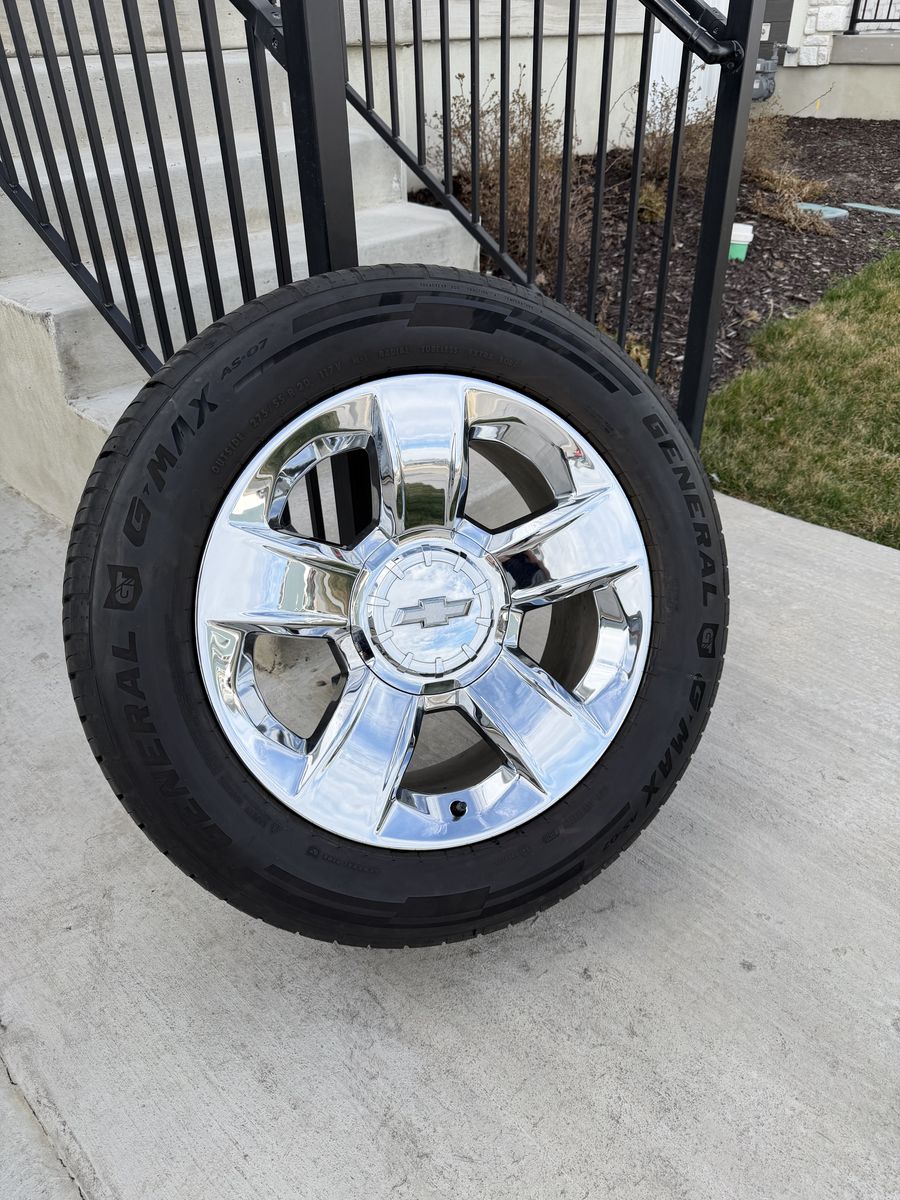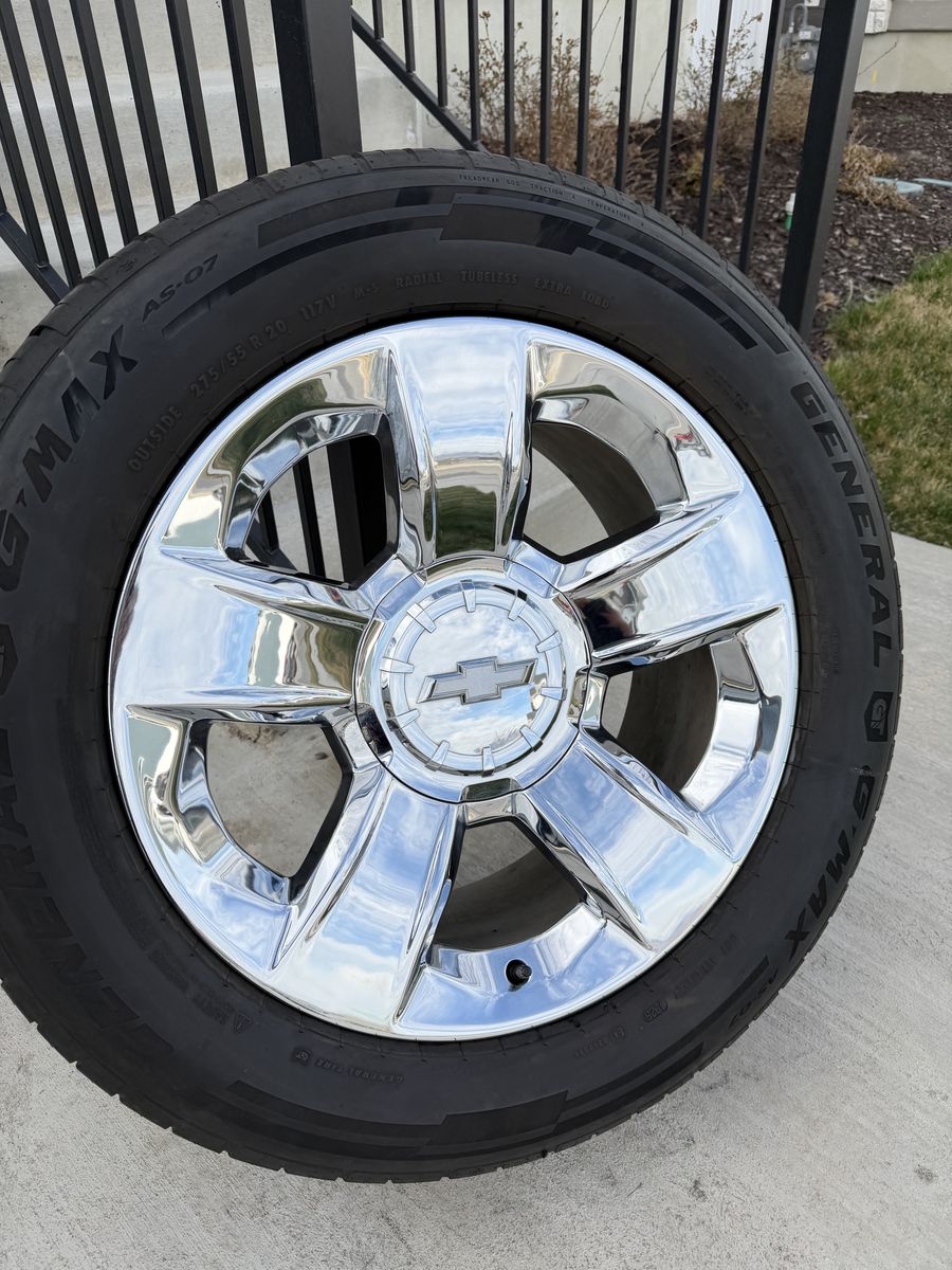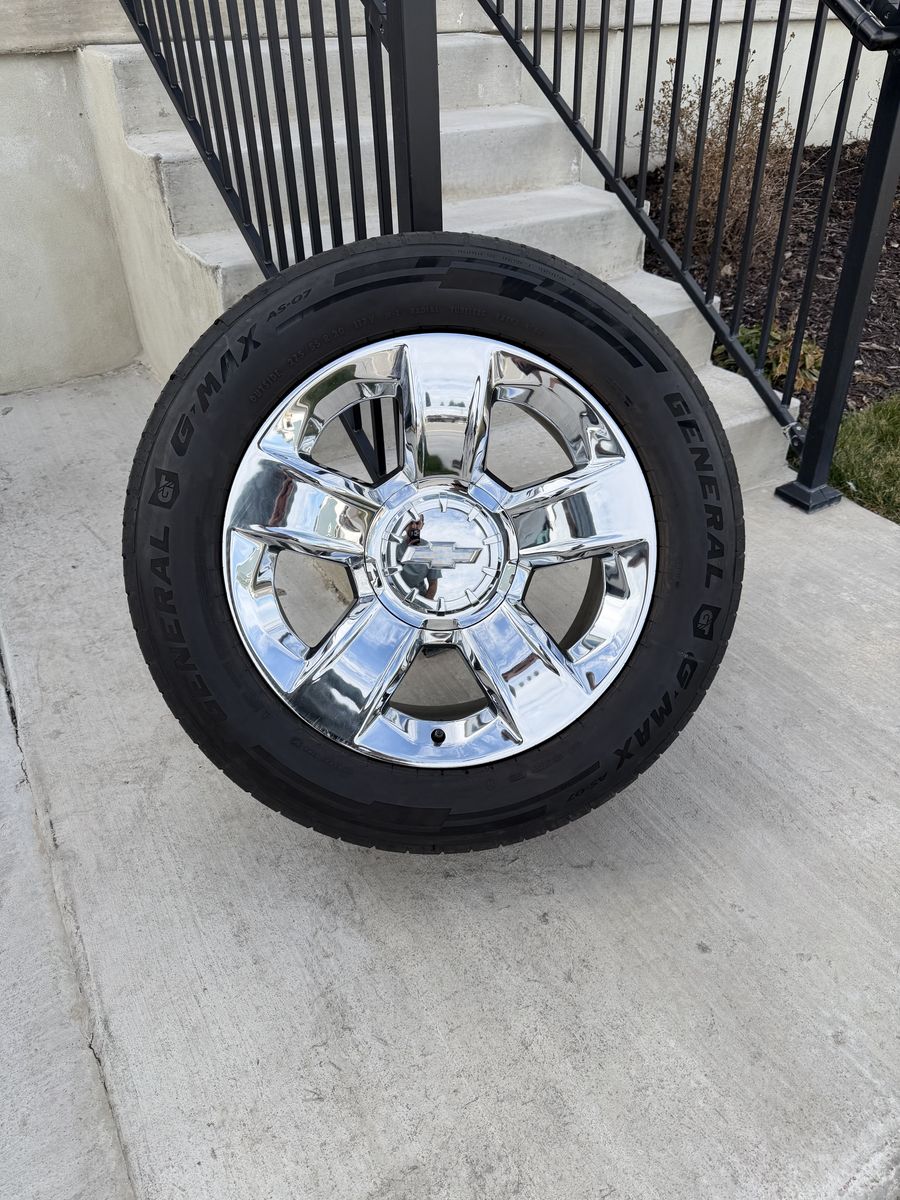 ApplePaySet of 4-Chevy Silverado 1500 Suburban Rims and Tires 275/55R20 General G-Max like new in excellent asking $1300 obo Tires are like new Rims are almost new no curb rash Comes with lug nuts or sensors I can sell the rims or tires separately Bolt pattern 6-5.5 or 6-139.7 They will fit Chevy Silverado Tahoe suburban avalanche GMC sierra Yukon Text anytime 385-402-2292
