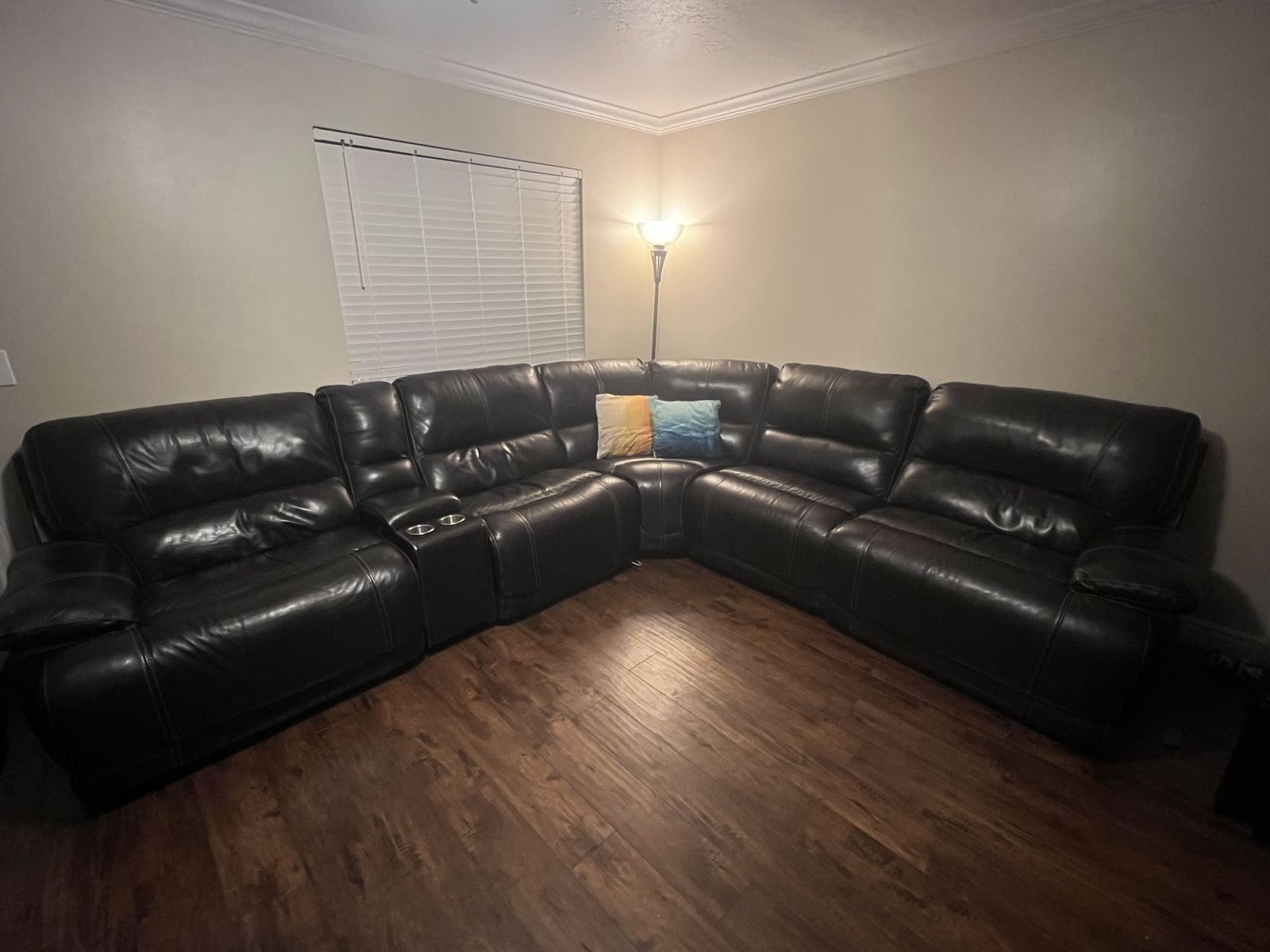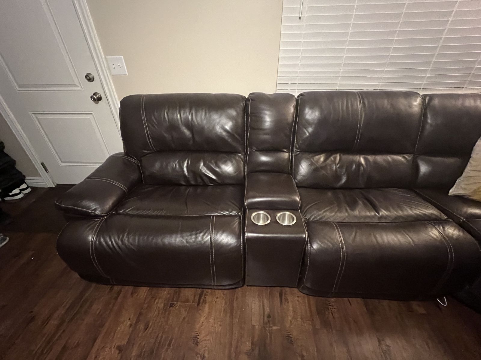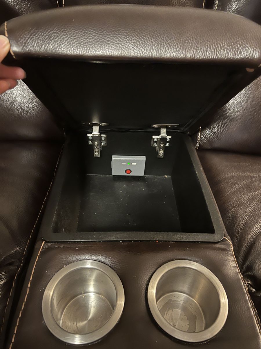 VenmoThis nice leather brown reclining sectional with power headrests has a total of 3 recliners! Sectional includes one right-arm facing power recliner, one console, one armless power recliner, one corner wedge, one armless chair, and one left-arm facing power recliner. This couch can be configured any way you would like to fit your living space! The leather has been well taken care of and is in excellent condition! The console includes 2 cup holders on the outside and inside a charging station where you can charge your electronic devices! Also, each end recliner has a charging port too!