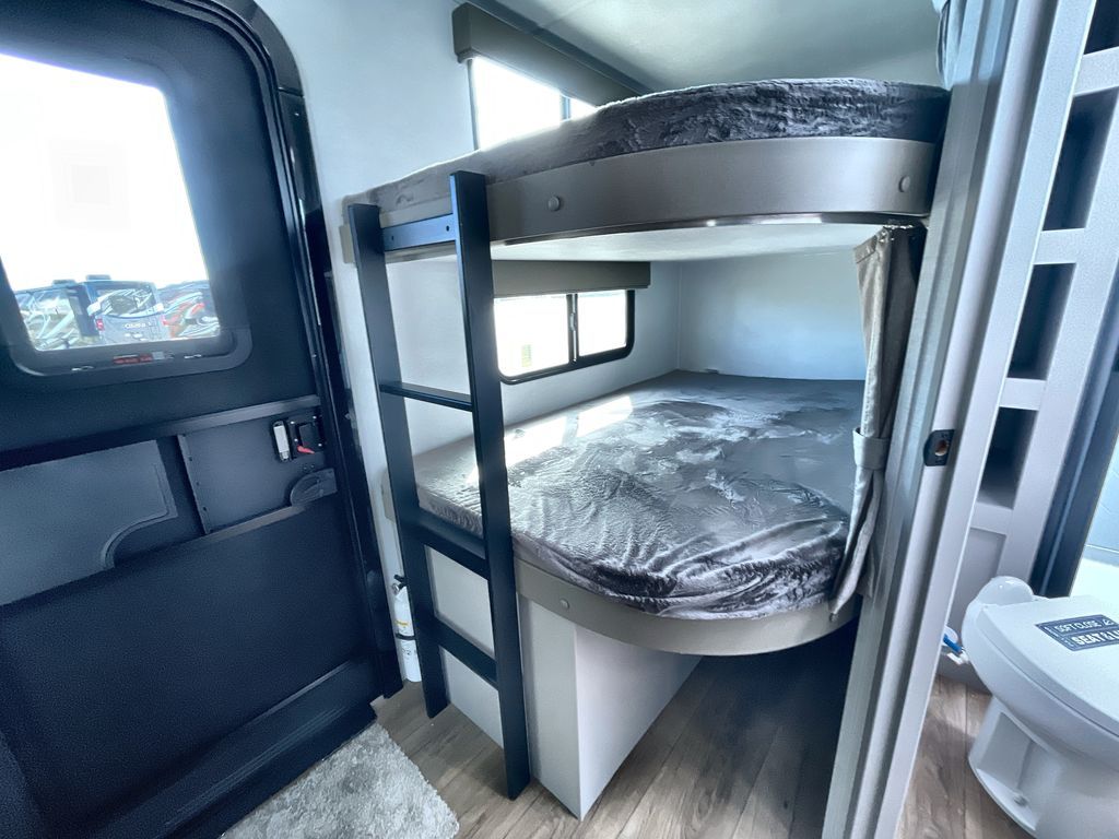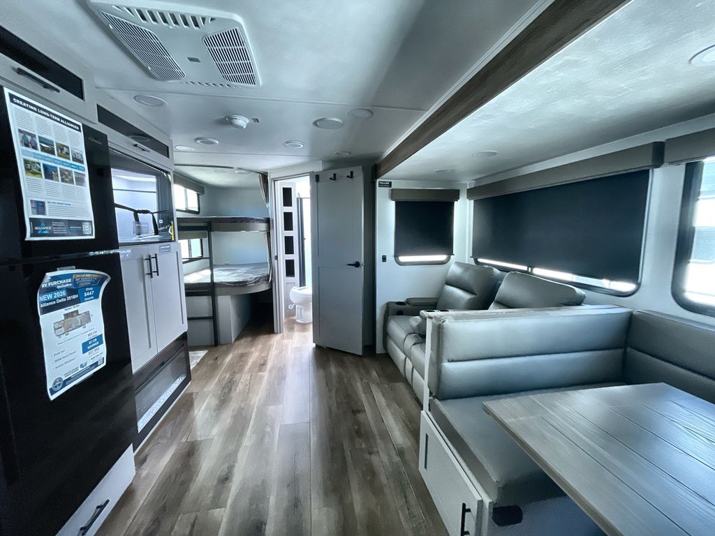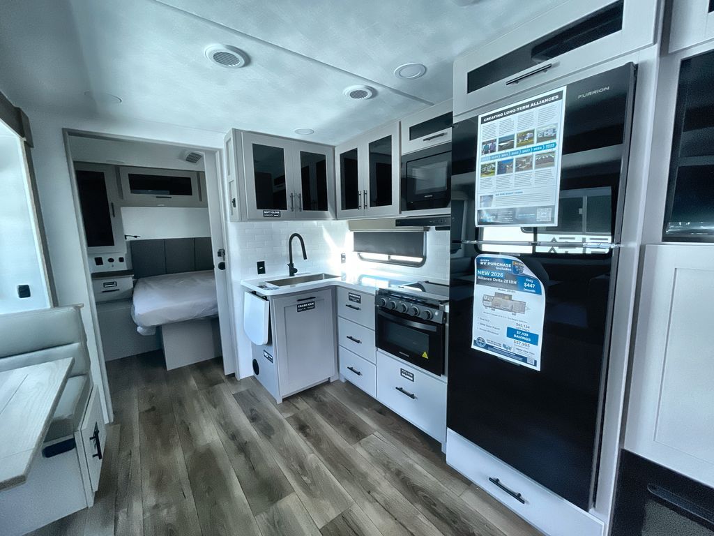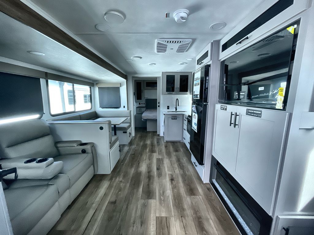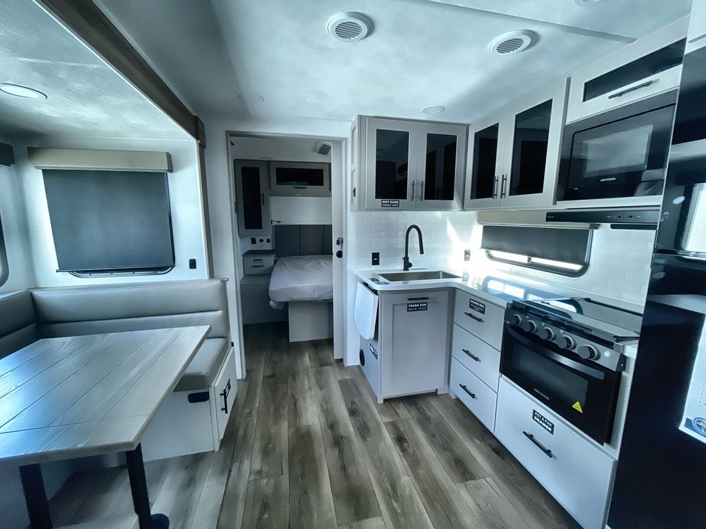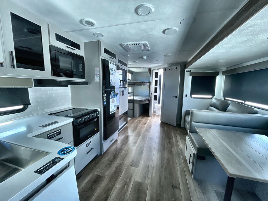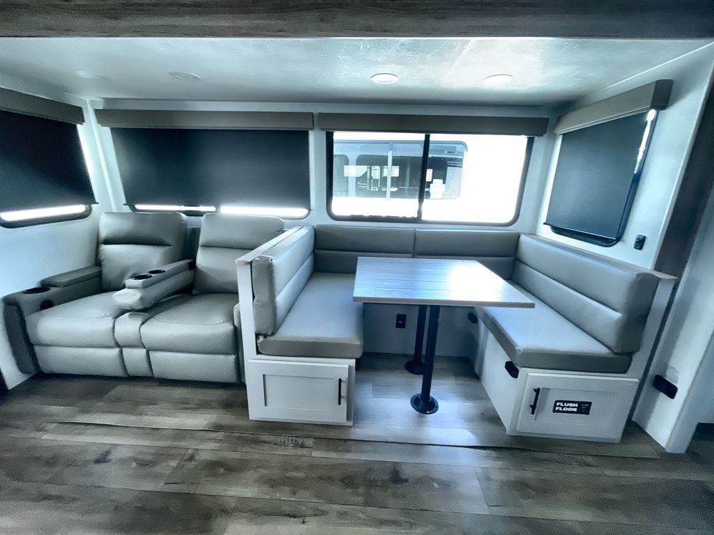 The perfect travel trailer for a larger family or one that enjoys traveling with friends! One large slide opens up the interior living space nice and features a U-shaped dinette and theater seating to provide plenty of seating for everyone. Enjoy the 40" HDTV opposite the seating for a movie indoors, and game night will be easy with everyone at the dinette which can also be converted for added sleeping if needed. The double entry doors will make loading and unloading simple and allows you to easily slip in and out of the private bedroom for a morning walk. You can easily prepare all of your favorite meals and snacks with the kitchen amenities provided inside. A three-burner range allows you to easily cook indoors, or you can enjoy cooking outside using the outdoor griddle/grill if you like. There is a 10-cu. ft. 12V refrigerator to keep all of your perishables and drinks nice and cold, plus a large sink for dishes and cleaning up, and there is also a flip-up counter extension for more prep space. You will also appreciate the rear corner bath featuring a 30" x 36" shower, vanity with sink, soft close porcelain toilet with foot flush, and linen cabinet for your towels.