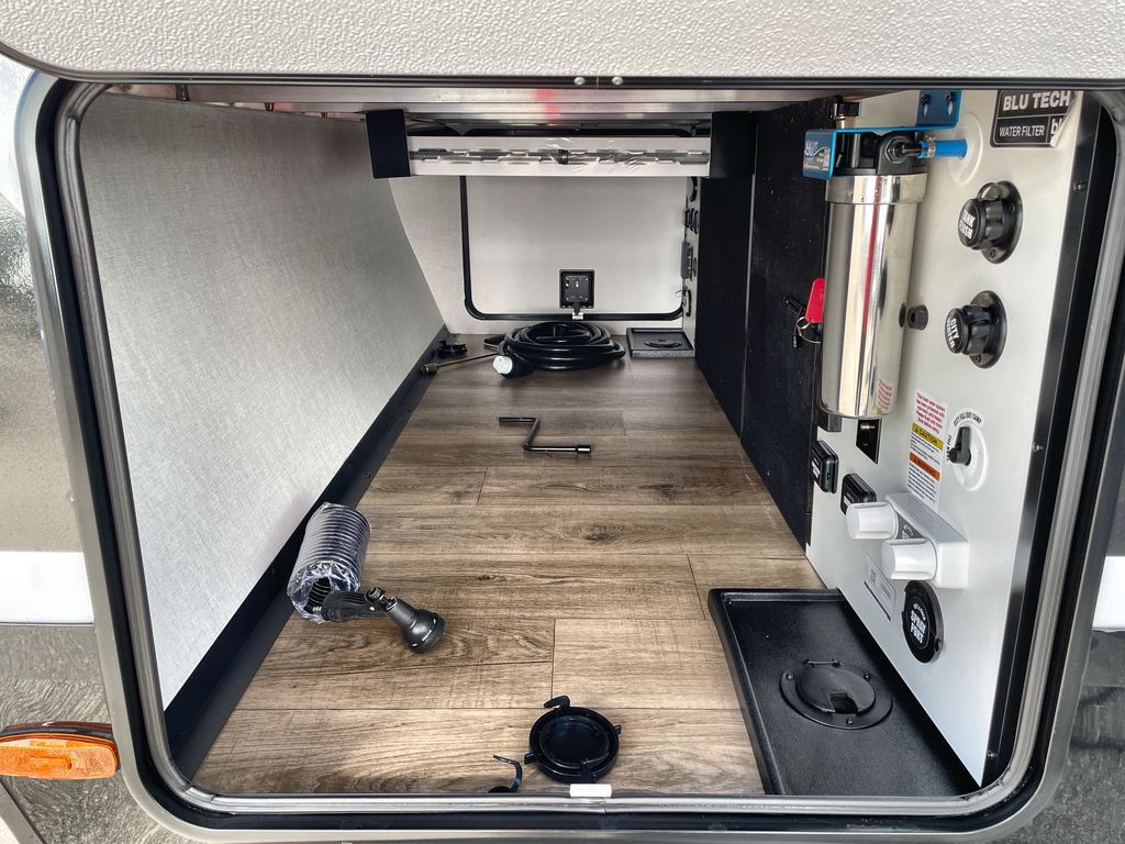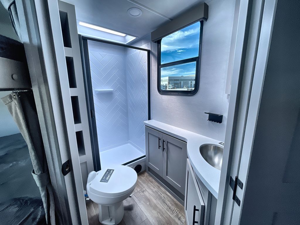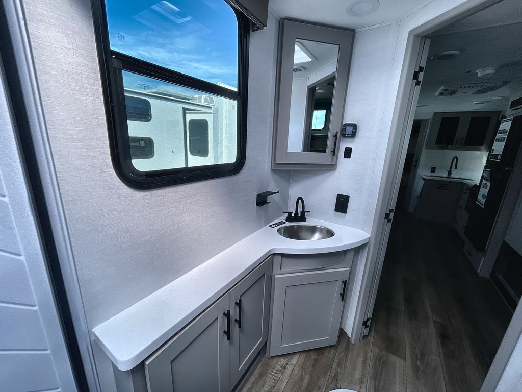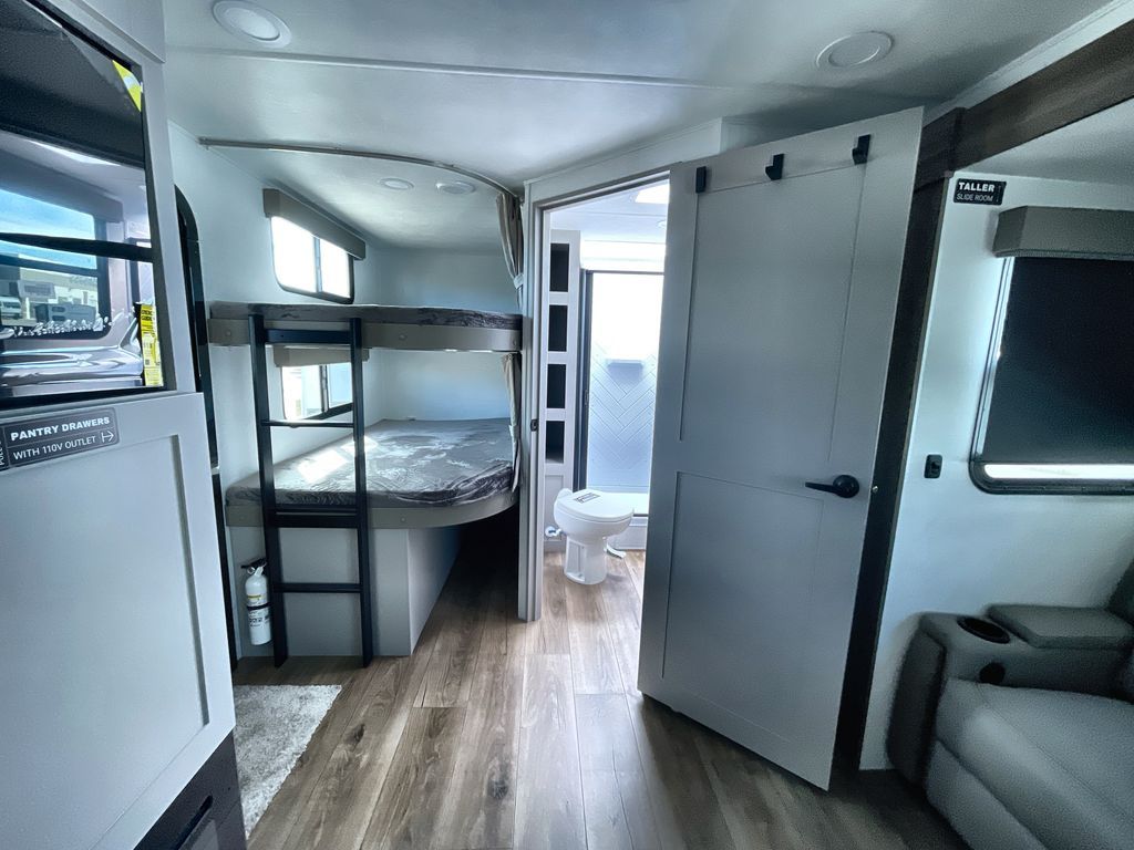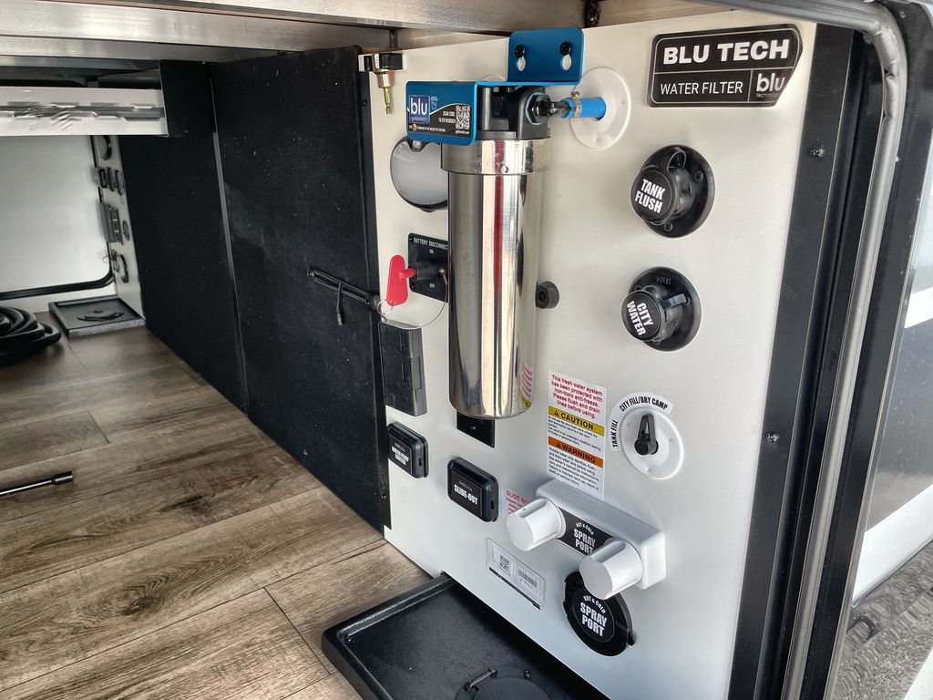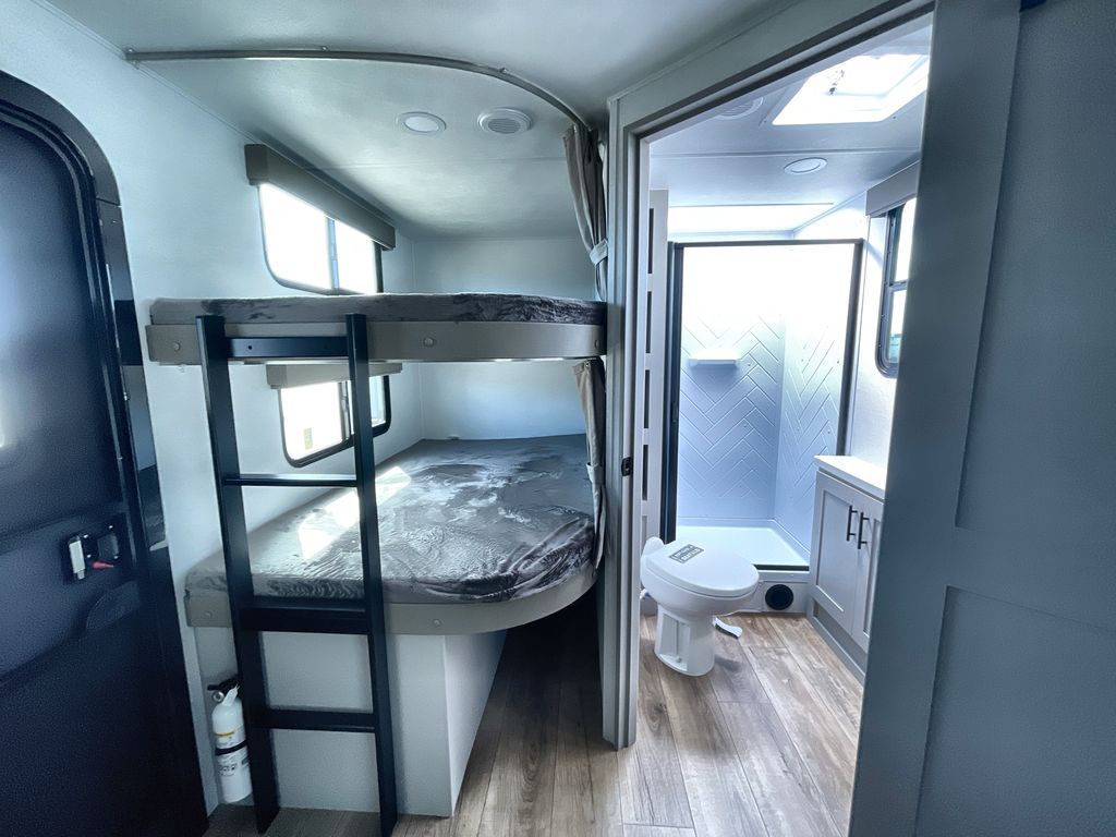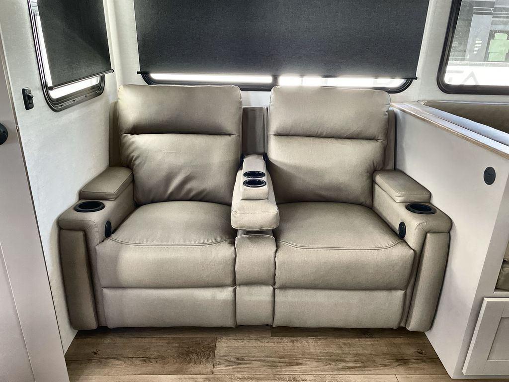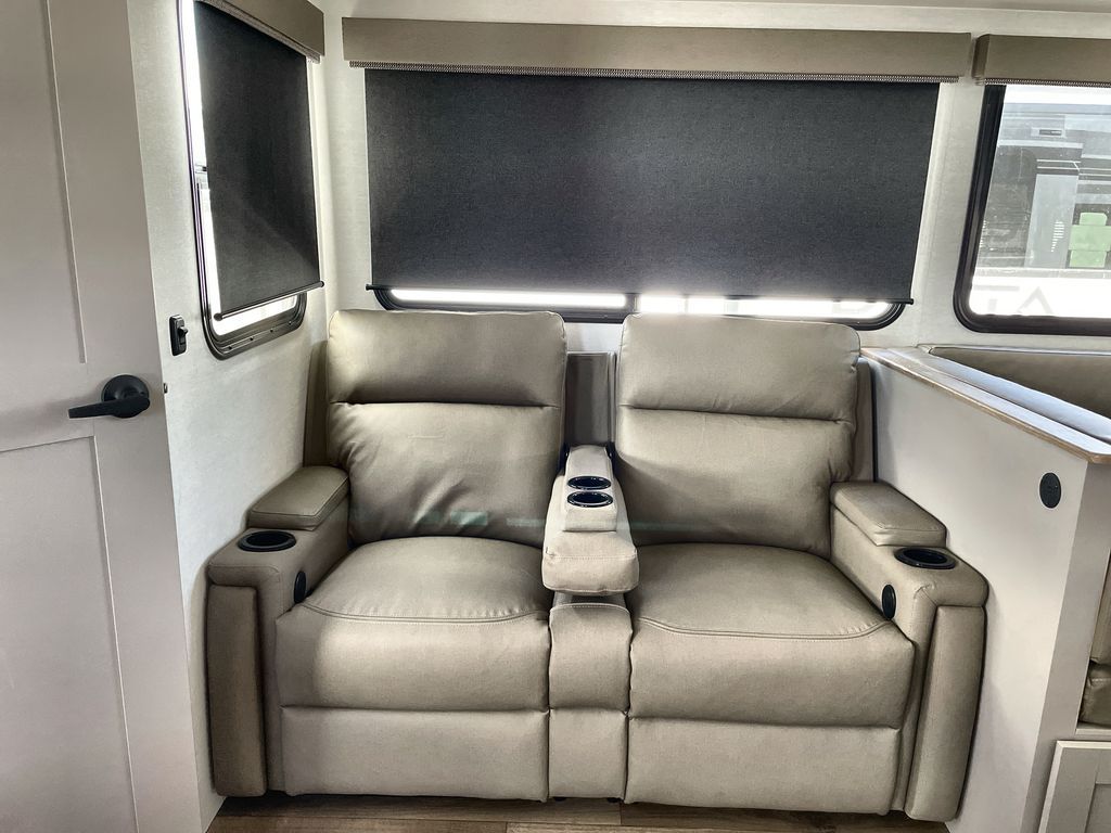 The perfect travel trailer for a larger family or one that enjoys traveling with friends! One large slide opens up the interior living space nice and features a U-shaped dinette and theater seating to provide plenty of seating for everyone. Enjoy the 40" HDTV opposite the seating for a movie indoors, and game night will be easy with everyone at the dinette which can also be converted for added sleeping if needed. The double entry doors will make loading and unloading simple and allows you to easily slip in and out of the private bedroom for a morning walk. You can easily prepare all of your favorite meals and snacks with the kitchen amenities provided inside. A three-burner range allows you to easily cook indoors, or you can enjoy cooking outside using the outdoor griddle/grill if you like. There is a 10-cu. ft. 12V refrigerator to keep all of your perishables and drinks nice and cold, plus a large sink for dishes and cleaning up, and there is also a flip-up counter extension for more prep space. You will also appreciate the rear corner bath featuring a 30" x 36" shower, vanity with sink, soft close porcelain toilet with foot flush, and linen cabinet for your towels.