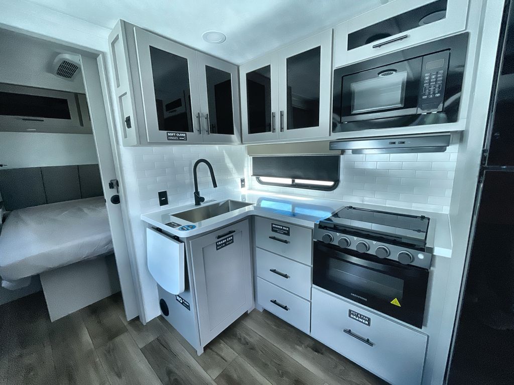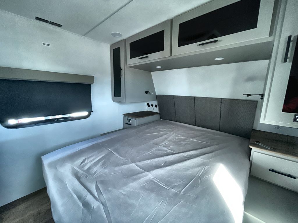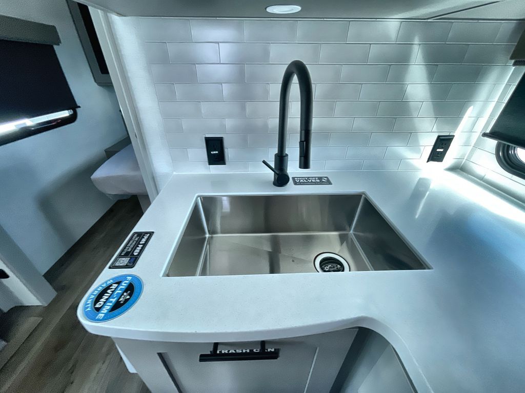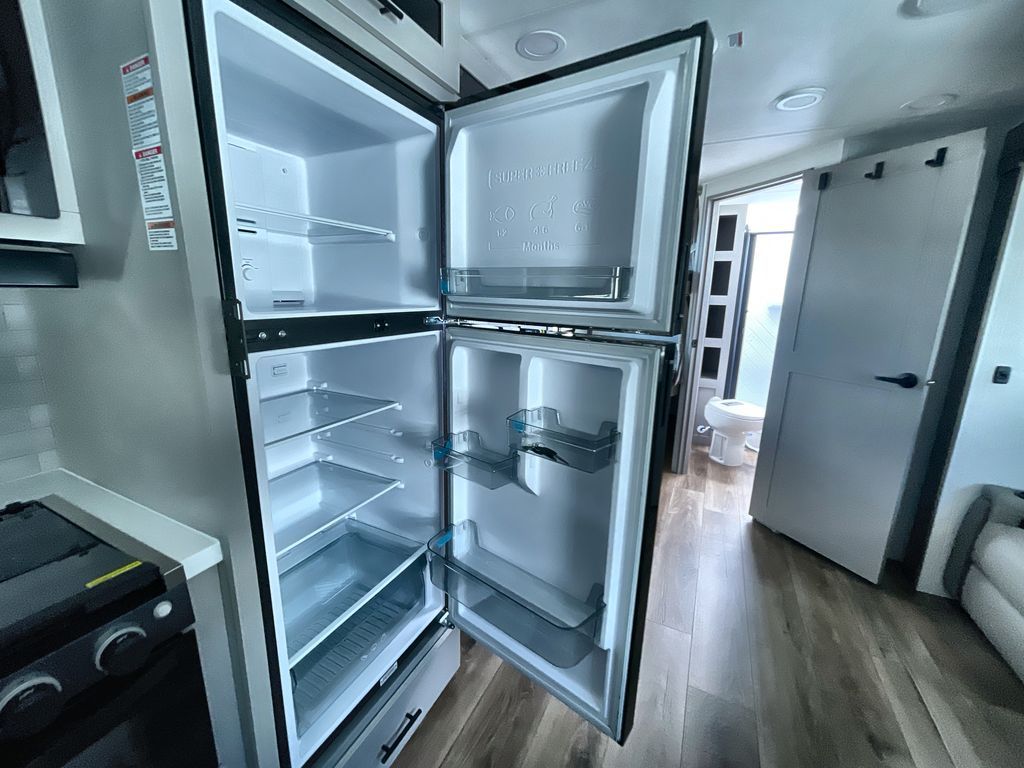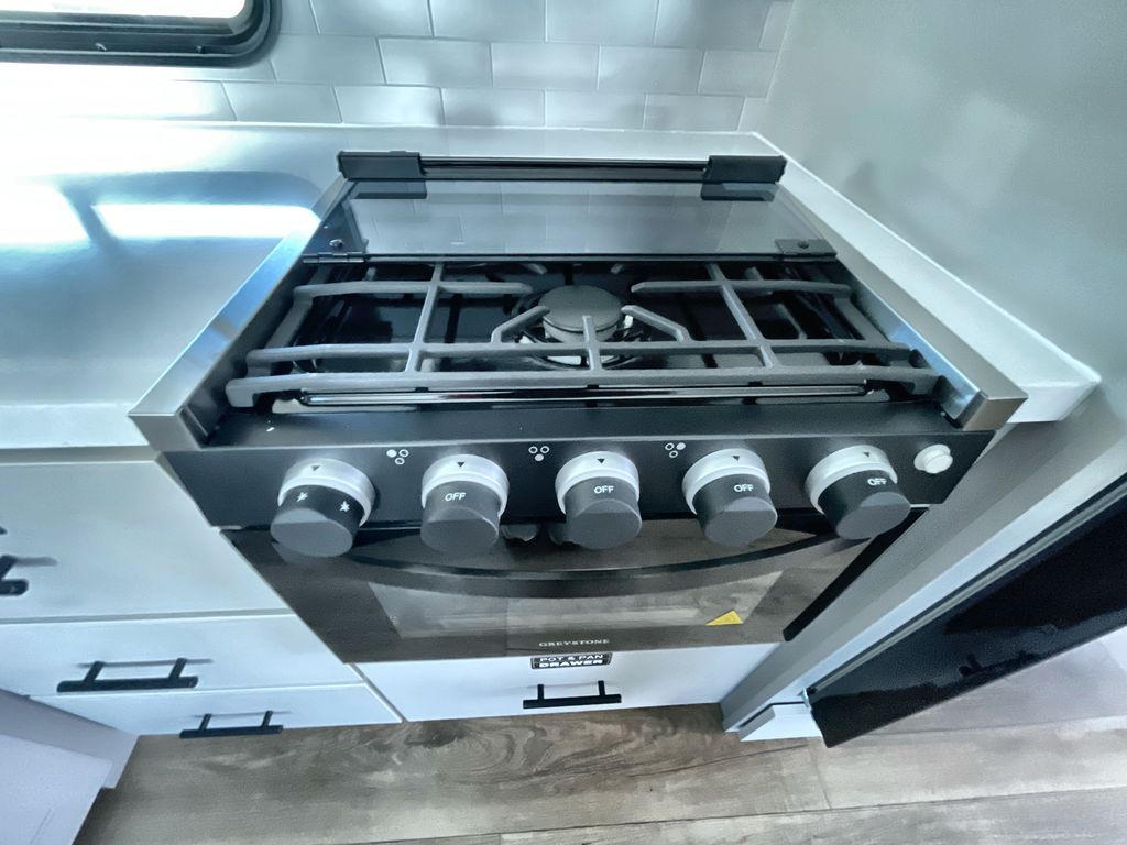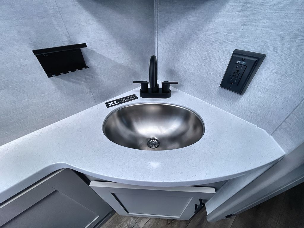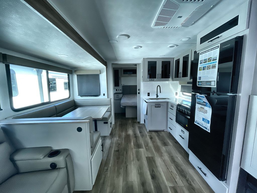 The perfect travel trailer for a larger family or one that enjoys traveling with friends! One large slide opens up the interior living space nice and features a U-shaped dinette and theater seating to provide plenty of seating for everyone. Enjoy the 40" HDTV opposite the seating for a movie indoors, and game night will be easy with everyone at the dinette which can also be converted for added sleeping if needed. The double entry doors will make loading and unloading simple and allows you to easily slip in and out of the private bedroom for a morning walk. You can easily prepare all of your favorite meals and snacks with the kitchen amenities provided inside. A three-burner range allows you to easily cook indoors, or you can enjoy cooking outside using the outdoor griddle/grill if you like. There is a 10-cu. ft. 12V refrigerator to keep all of your perishables and drinks nice and cold, plus a large sink for dishes and cleaning up, and there is also a flip-up counter extension for more prep space. You will also appreciate the rear corner bath featuring a 30" x 36" shower, vanity with sink, soft close porcelain toilet with foot flush, and linen cabinet for your towels.
