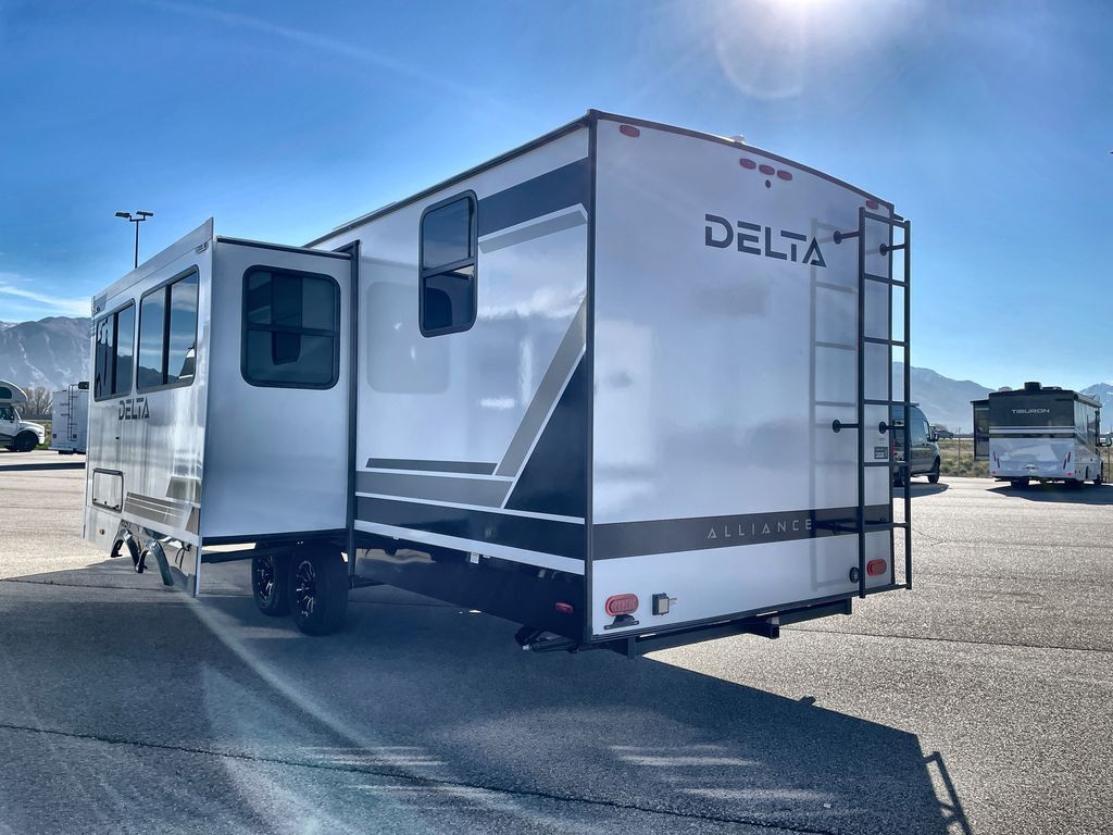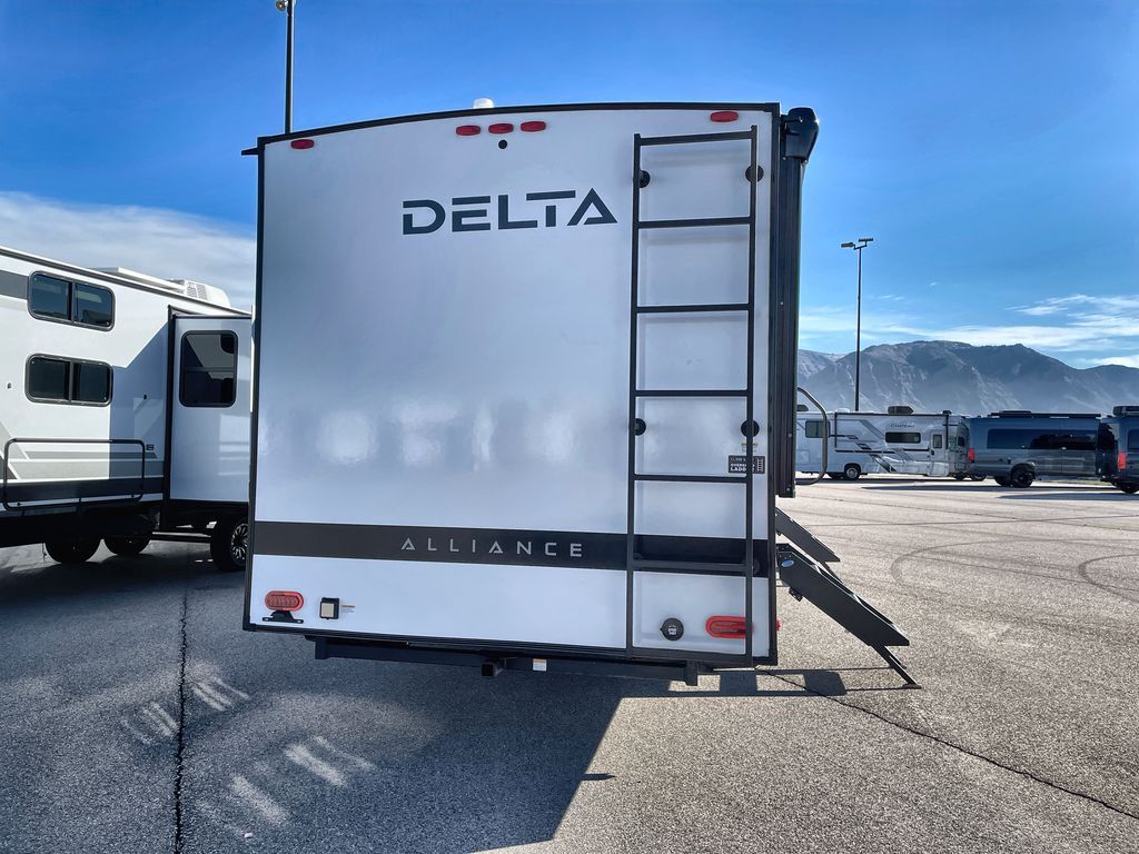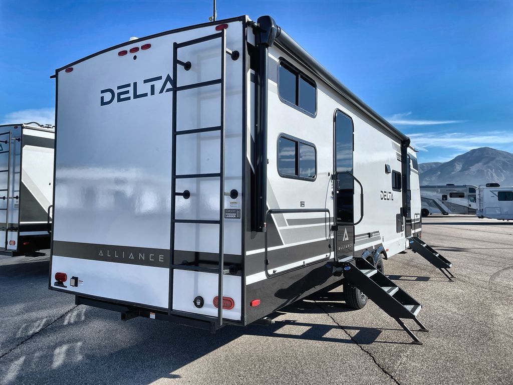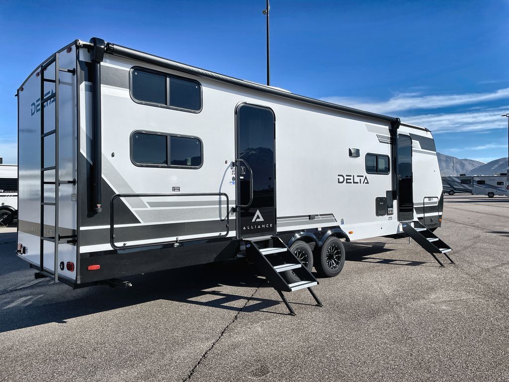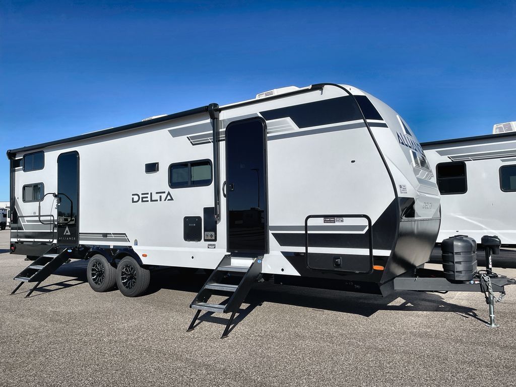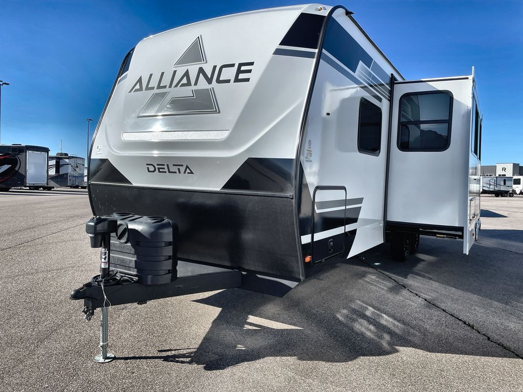 Form and function work together with every one of these Alliance RV Delta travel trailers! They are built with a walk-on roof with a seamless PVC roof covering, Mylar reinforced exterior seals, and a heated and enclosed underbelly to protect your unit. The commercial grade vinyl flooring will be easy to clean, and the oversized atrium windows throughout let in plenty of natural sunlight. With 62 cu. ft. of drop frame pass-through storage, you can bring along all of your essential camping gear plus it has USB charging for more convenience. There are many at home interior conveniences including a Bluetooth speaker, USB charging throughout, and even a pull-out kitchen trash can. Come find your favorite model today!