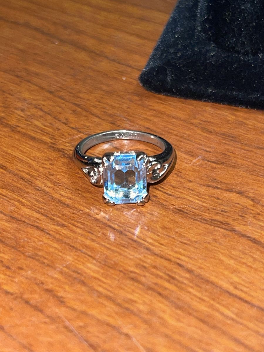 Avon vintage ring from the 80’s, no tarnish, no dents, only needs a good cleaning. Color of stone is Aquamarine Has the Marking Avon engraved