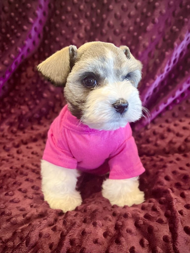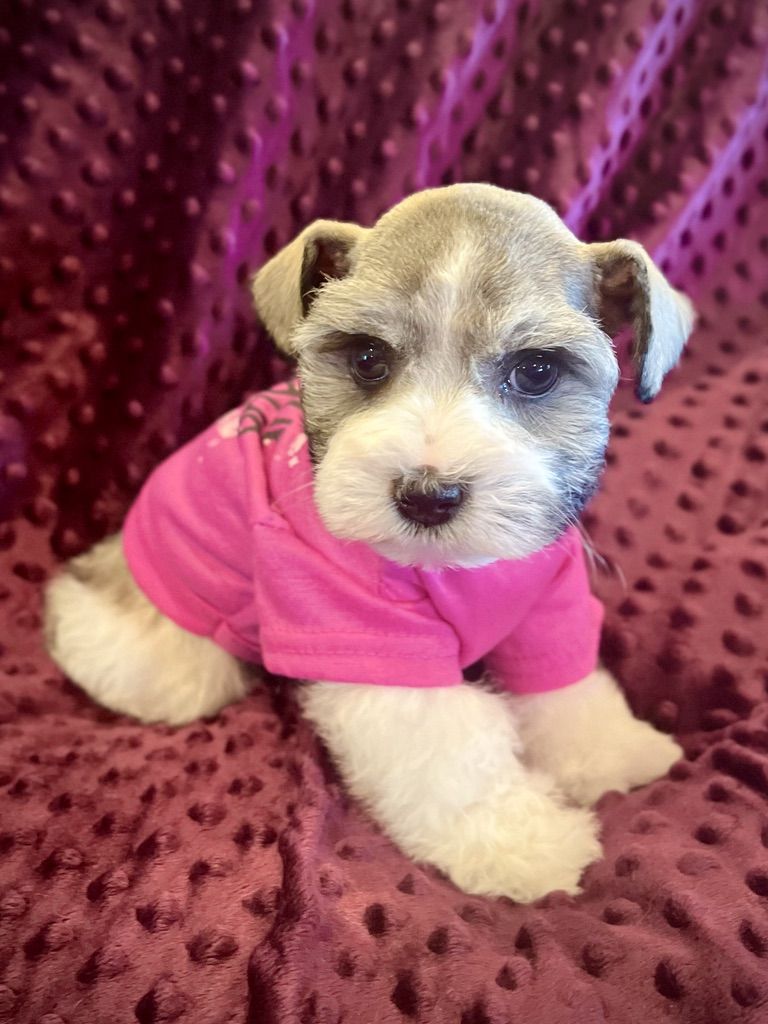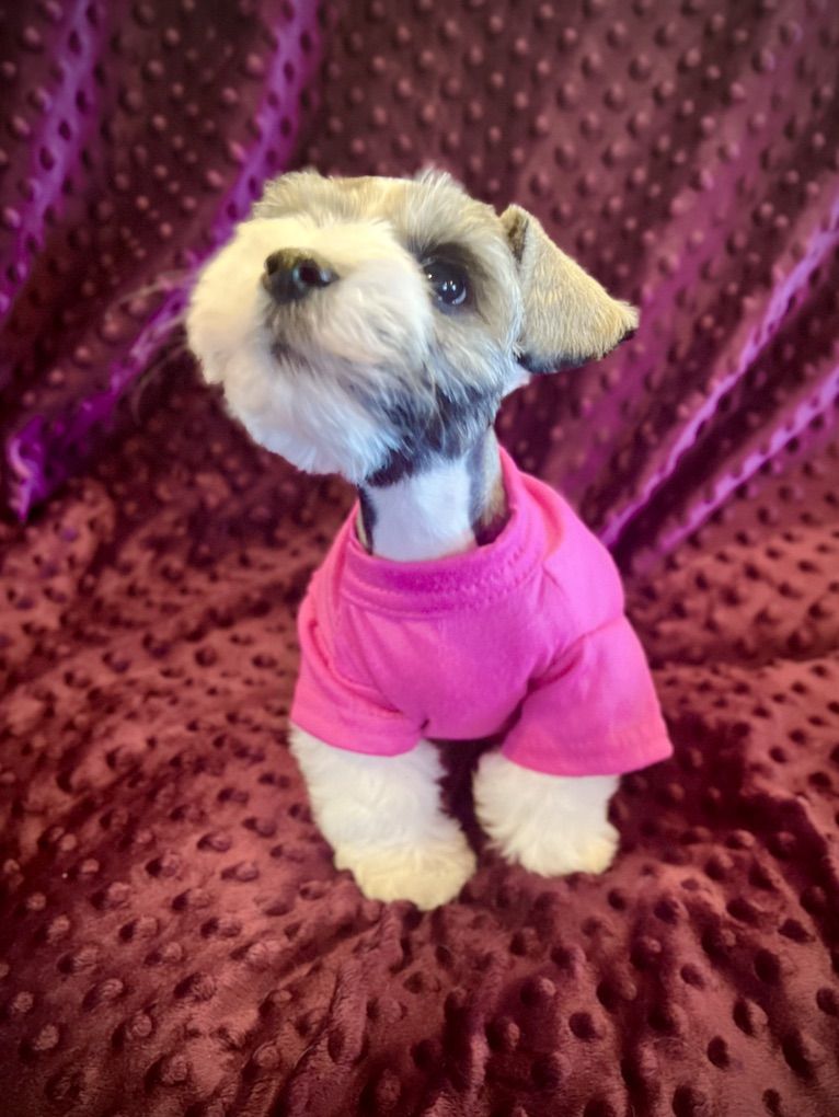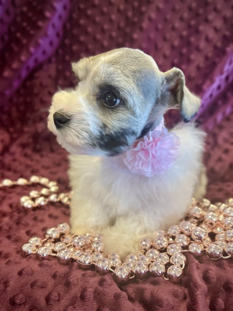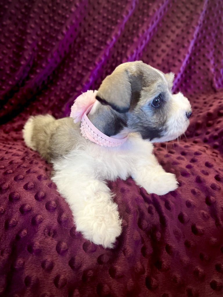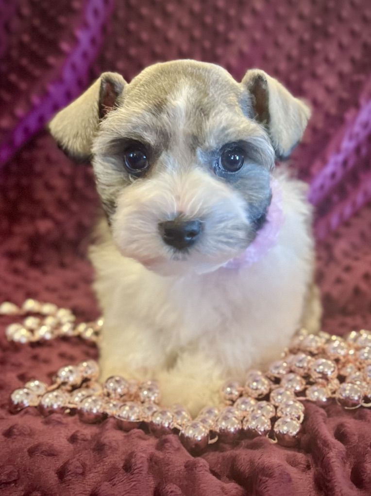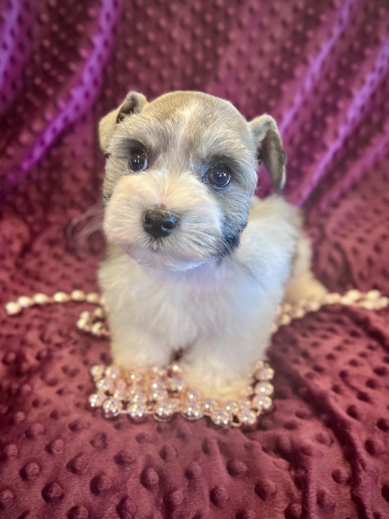 AKC Miniature Schnauzer Salt and Pepper Parti. Meet Ava! She has beautiful mega-coat, small size and great personality. Ava is a fantastic Parti pup with wonderful white markings and a deep rich shine to her coat. Hypoallergenic and dander free! She will be about 8lbs when full grown, and has soft, thick, rich mild curly hair. Ava was born Jan. 31st and is doing so good! She has had her dew claws removed, tail docked, first shots and is eating hard food really well. Her mother is 7lbs and Dad is about 8lbs. She is AKC registered. She is a super small bundle of bouncing joy and loves her toys and playing around. Ava will make an excellent service dog, companion, and family member.