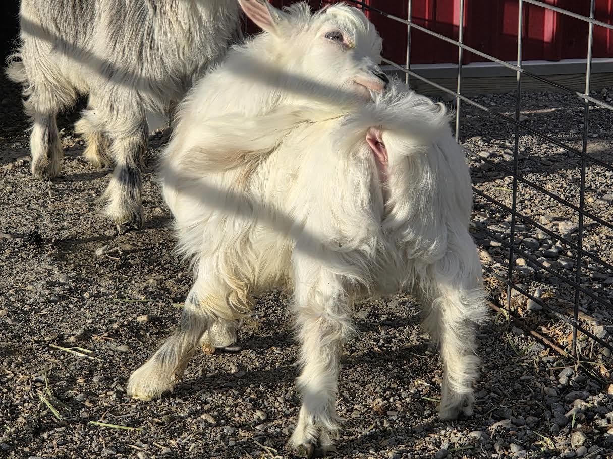 PayPalThis beautiful white boy has a red eye patch. He's one of triplet brothers born to registered silky fainting parents and is very friendly. As you can see, his bangs are aready coming in. He's been wethered, dehorned and vaccinated. If you have any questions or would like to come and see him, text Sharon.