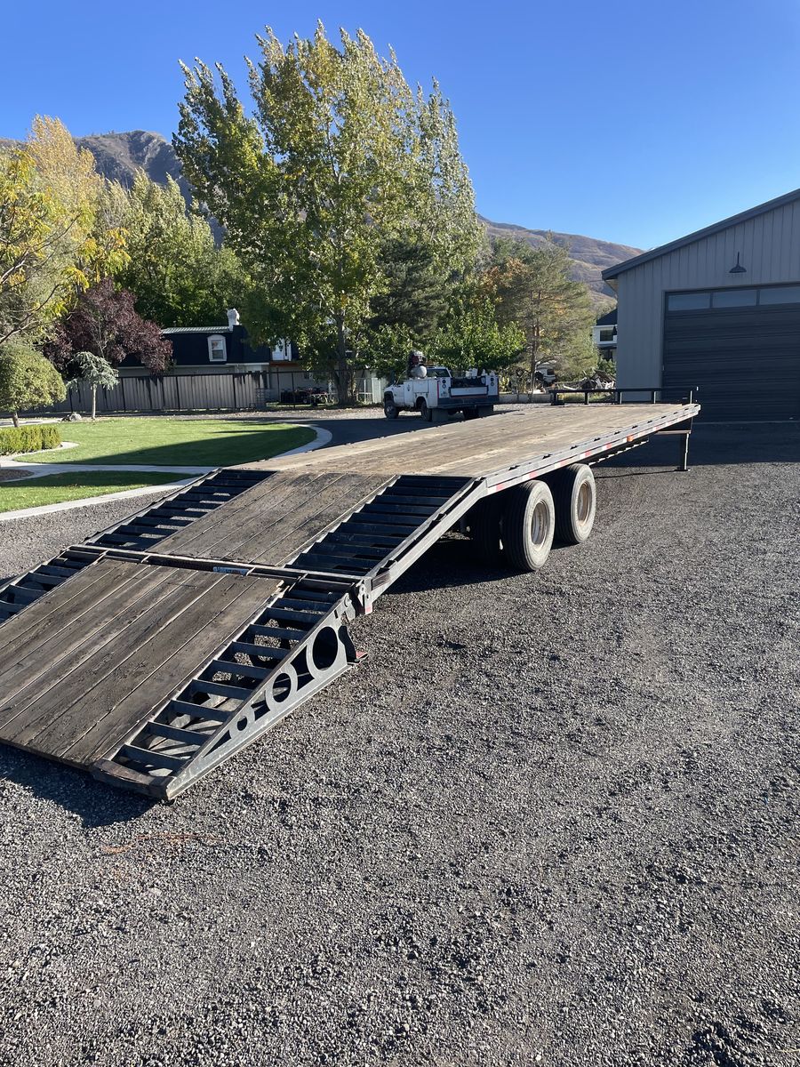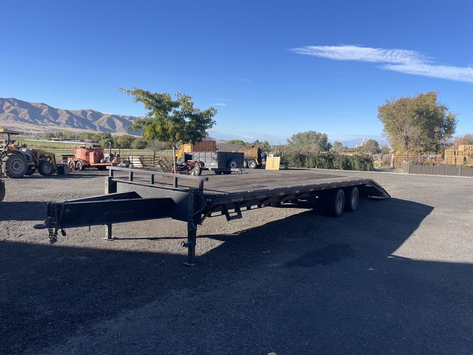 2011 mirage flatbed trailer, it is a 26’ deck with 6’ dovetail. It is tandem dually axles, it has a pintle hitch but could be changed to a normal ball. Great for pulling behind a pickup or a bigger truck like a dump truck. I had pulled it with a one ton pick up. Also has dual jacks and storage for chains, etc in tongue. See Less
