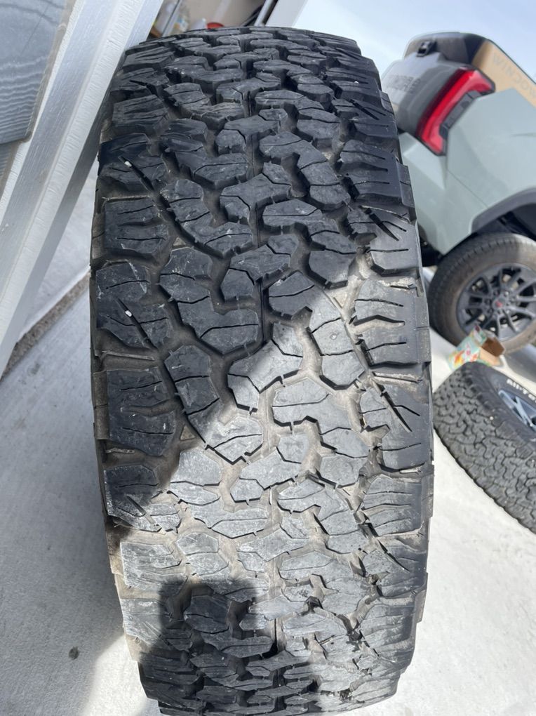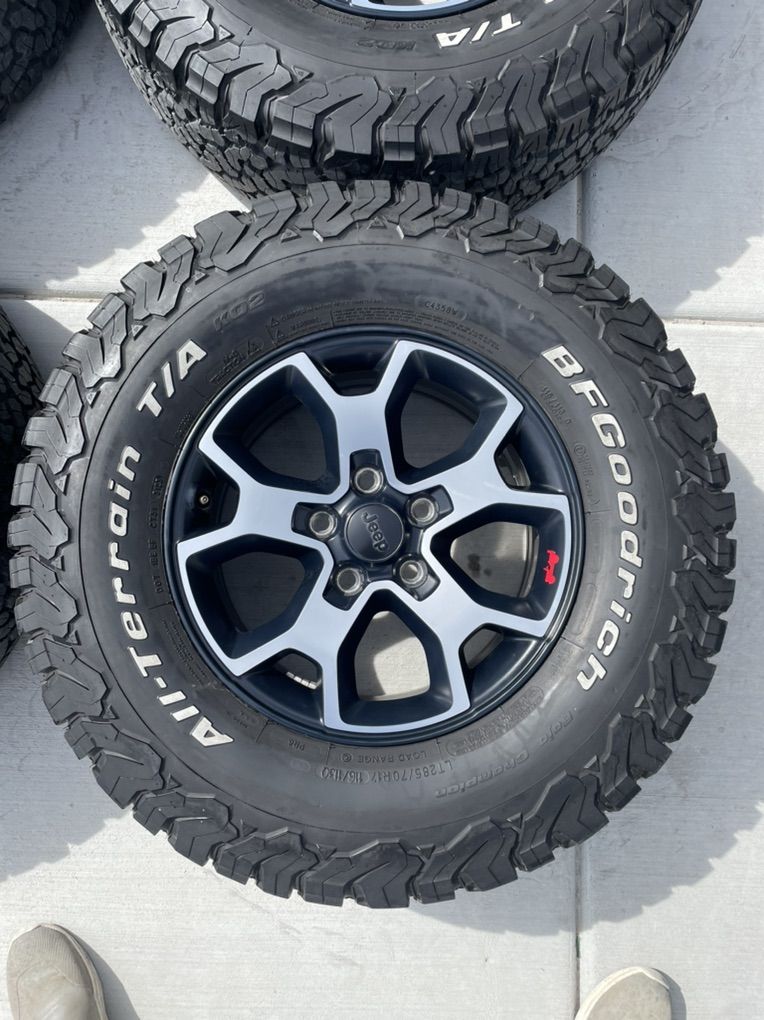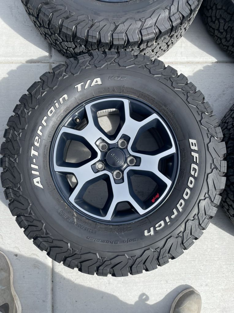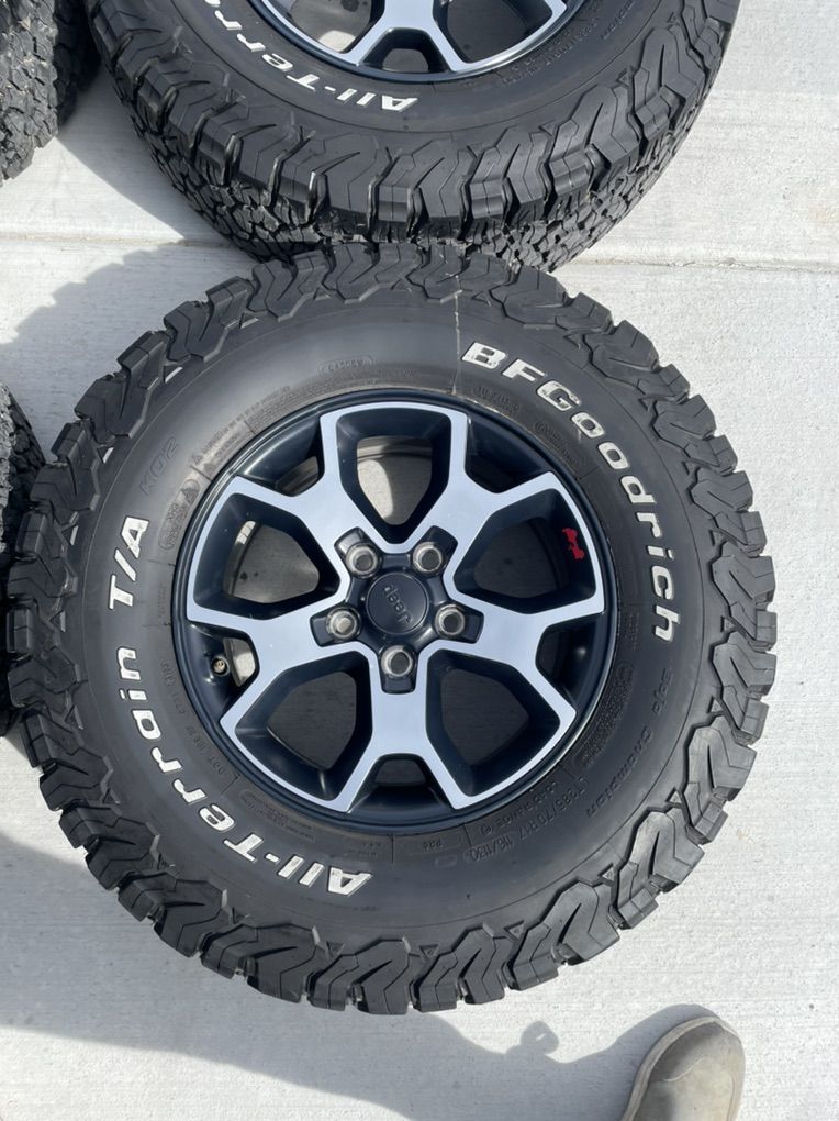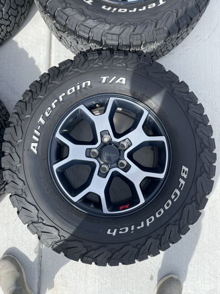 ZelleThese are take offs off a Jeep wrangler. They are 285/70r17 and the tread is at 12/32s. Used them for about a year and then took them off. Wheels and tires are in great condition. No plugs or issues. Balanced. No tpms. Lug nuts included.