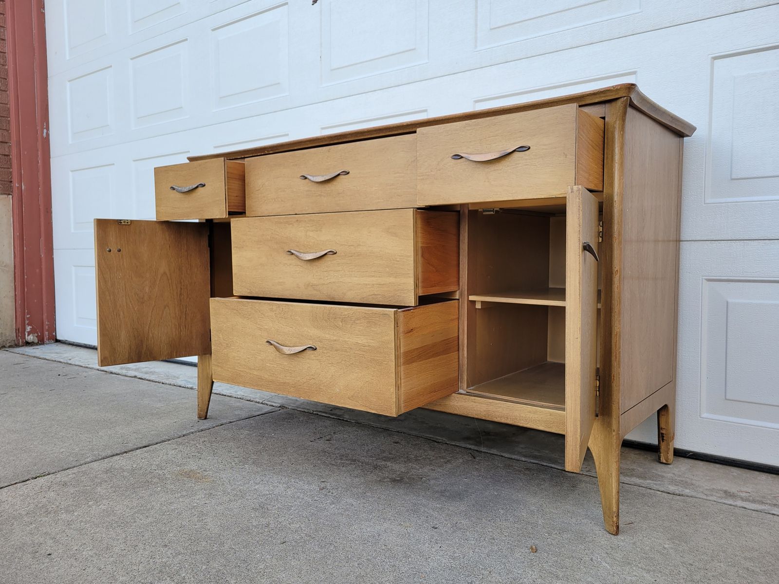 This is a beautiful buffet/sideboard. Solid wood. Made in America by Drexel Furniture. Great condition with some wear on top. All of the drawers glide well and are dovetail construction. Neat and clean. The cabinet doors swing on strong hinges and open, close and latch as they should. 2 shelves on each side. Solid and heavy. Wonderful addition to any mid century collection.