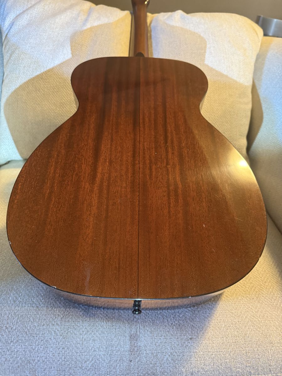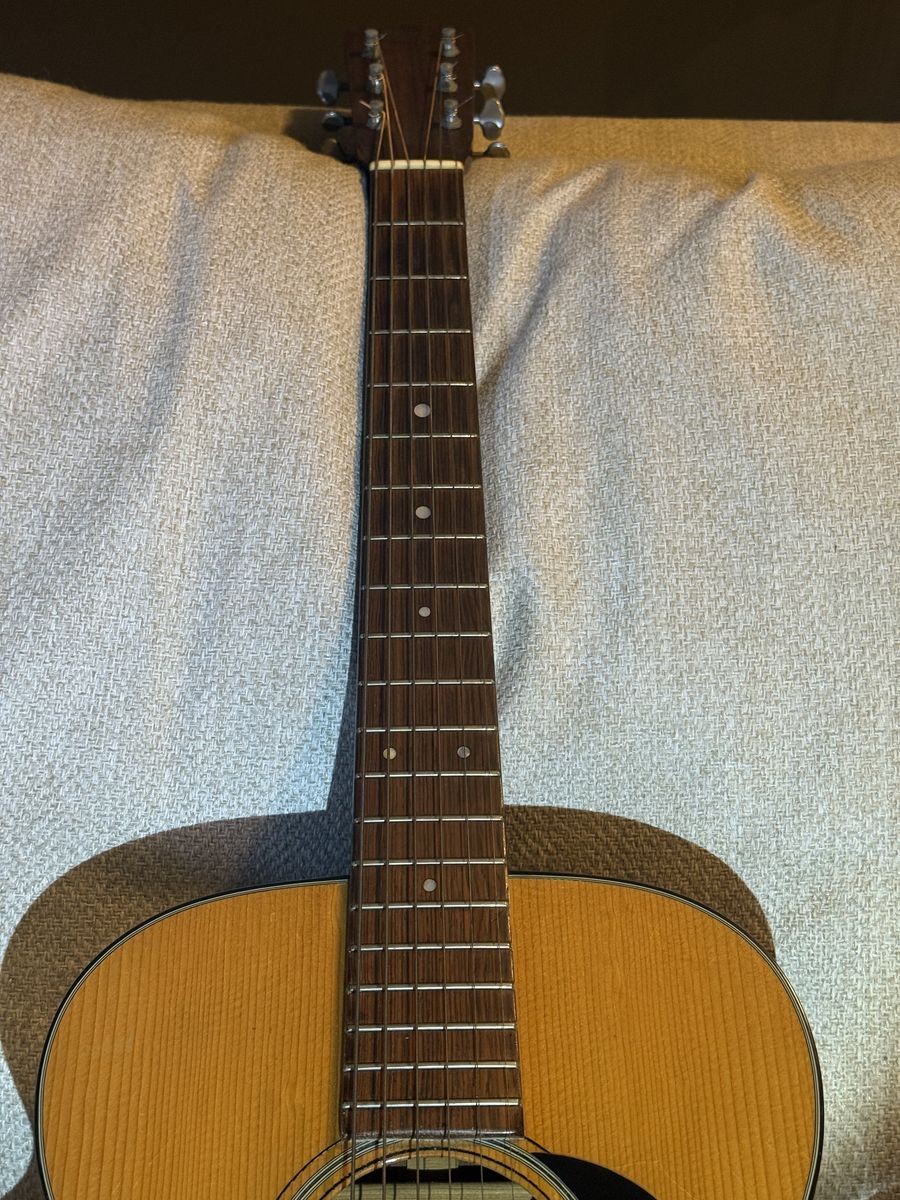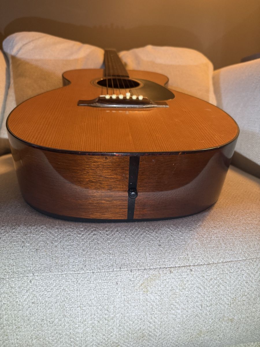 This acoustic guitar was previously owned and shows signs of light to normal use. It is in excellent condition and has been tested and works. I do not know exactly what woods are used on this guitar but in my opinion it looks like spruce and mahogany, all surfaces are in tact and not dinged and or has the looks of being repaired, there is tortoise beading around the guitar as a finish with ivory and ebony colored accents.