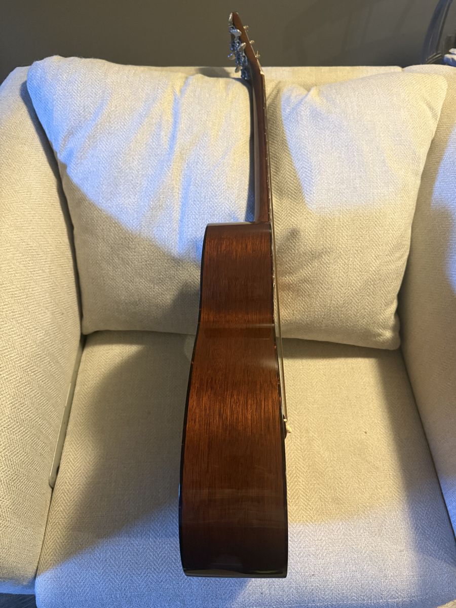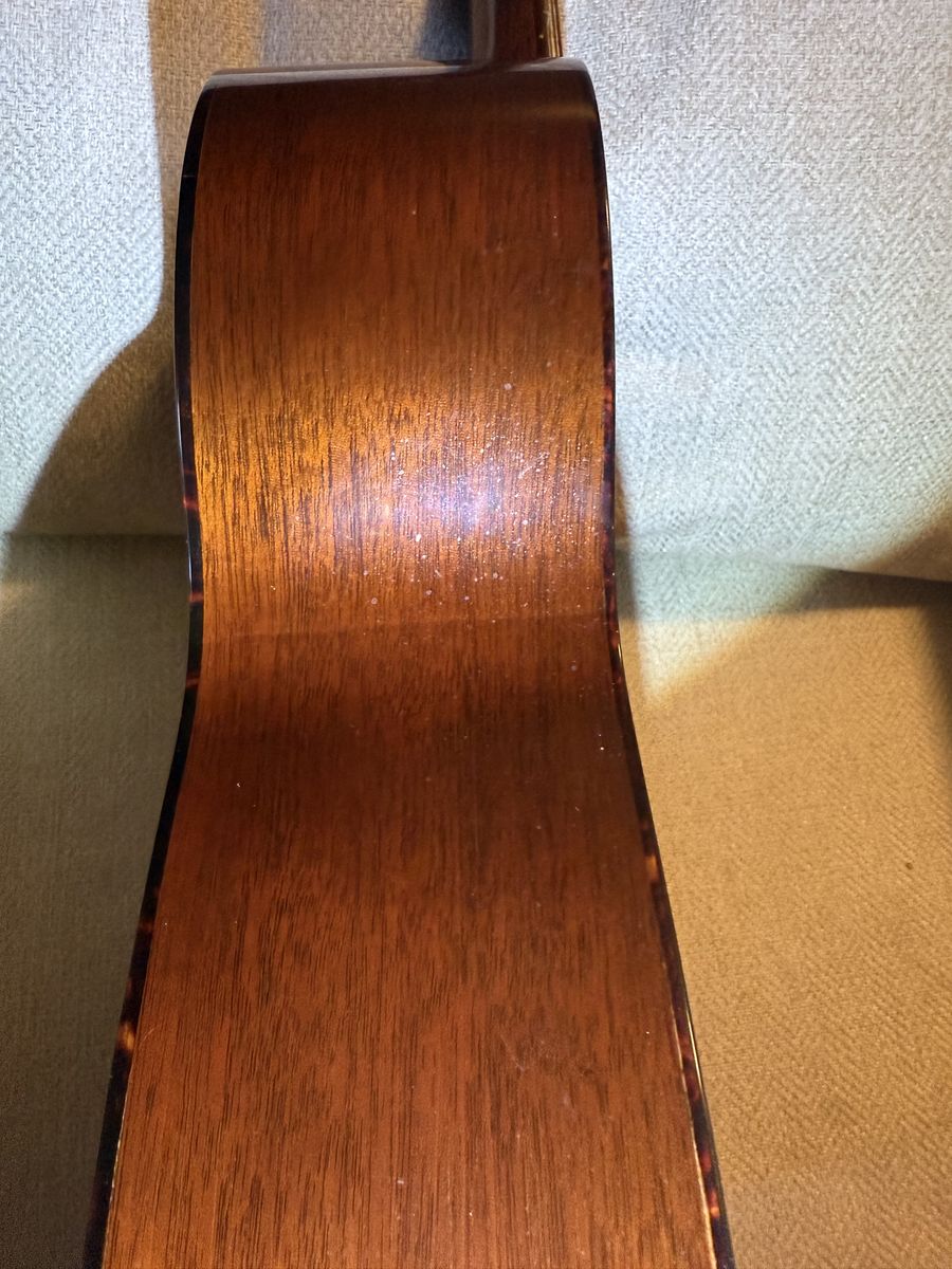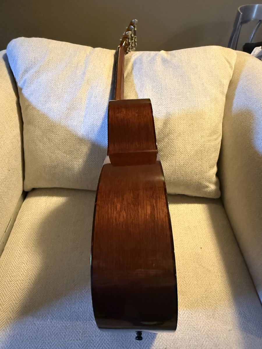 This acoustic guitar was previously owned and shows signs of light to normal use. It is in excellent condition and has been tested and works. I do not know exactly what woods are used on this guitar but in my opinion it looks like spruce and mahogany, all surfaces are in tact and not dinged and or has the looks of being repaired, there is tortoise beading around the guitar as a finish with ivory and ebony colored accents.