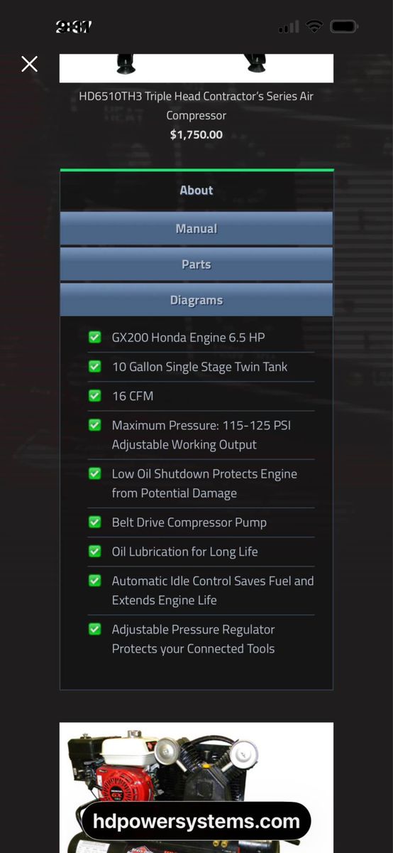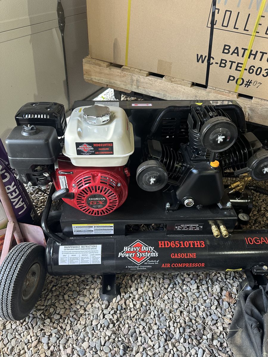 VenmoGX200 Honda Engine 6.5 HP 10 gallon single stage twin tank 16 CFM 115-125 PSI Adjustable working output