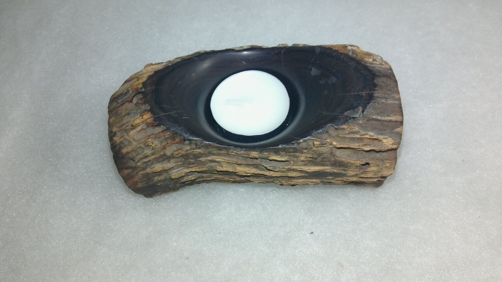 The natural textures of the fossilized wood create a cozy atmosphere when the candle is lit — perfect for relaxing evenings or special gatherings.