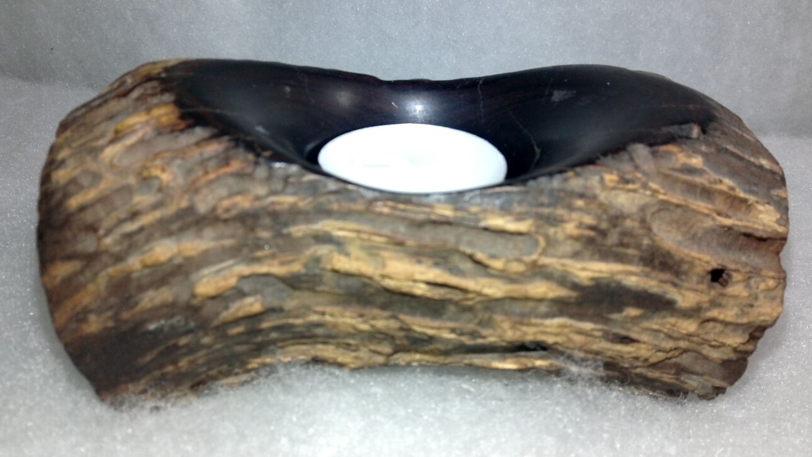 This piece is carved from fossilized wood, formed over millions of years, making this holder truly one-of-a-kind with unique colors and patterns.