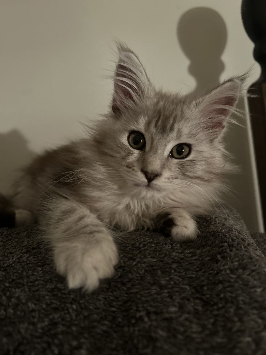 Stunning black silver Maine Coon female looking for her perfect forever home! She has a gorgeous high-contrast coat, sweet personality, and is very well-socialized.
