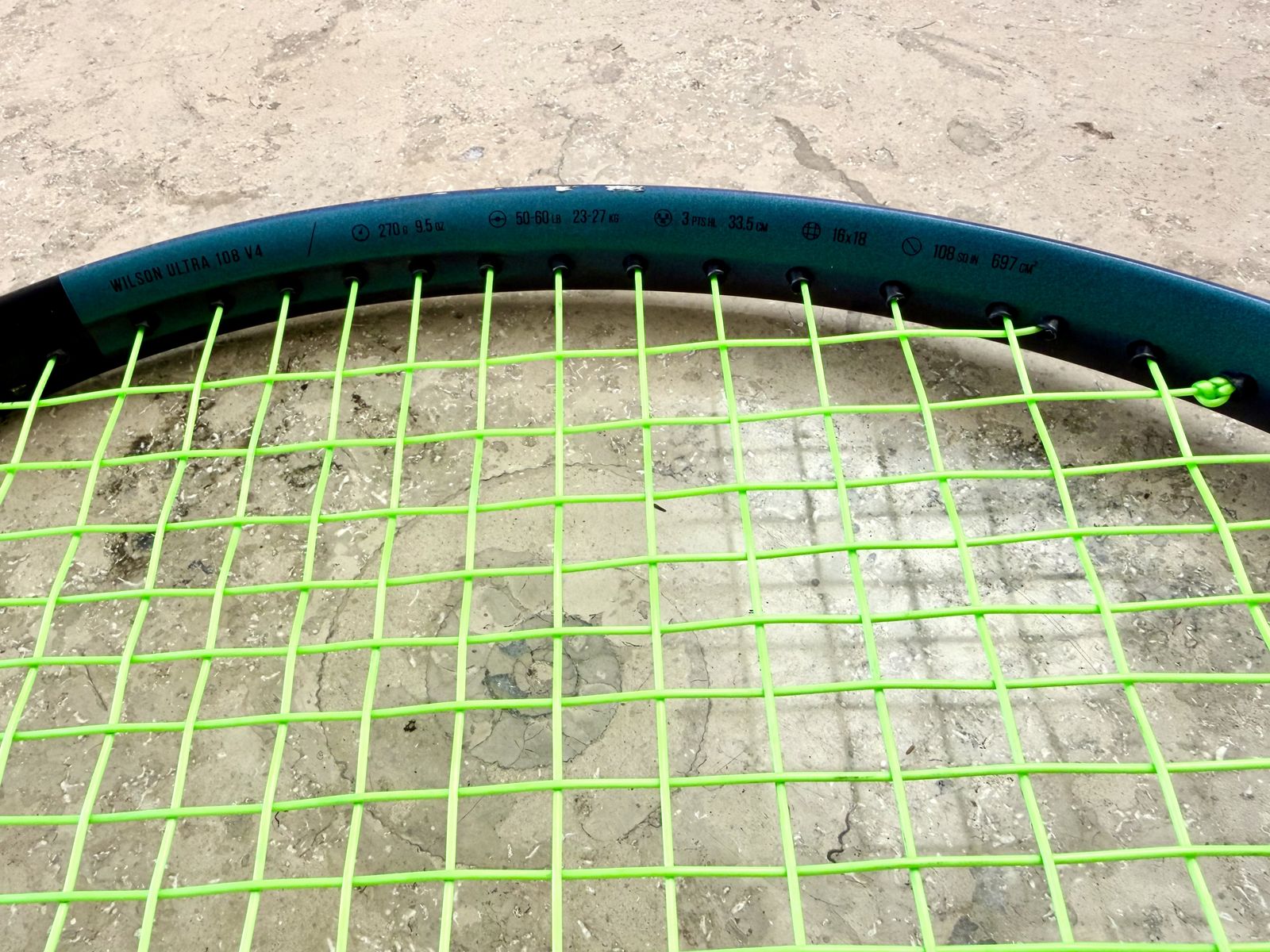 ApplePayHead Size: 108 sq in / 697 cm² • String Pattern: 16x18 • Unstrung Weight: 270 g / 9.5 oz • Balance: 3 Pts HL (33.5 cm) • Tension Range: 50-60 lbs / 23-27 kg