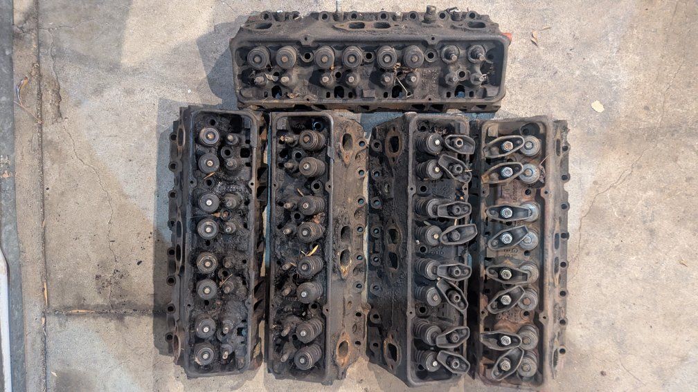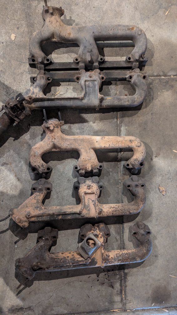Cylinder heads $ 20 each. Qty 2 of part # 1402260. Qty 2 of 3998991. Qty 1 of 333882. Four intake manifolds. $20 each Part numbers 346248 346250 14057055 3927184 Exhaust manifolds $10 each 1 set of big block Chevy headers $30 for the set. I also have a lot of small block accessory brackets and pulleys, too many to list. make offers. Call or text for info