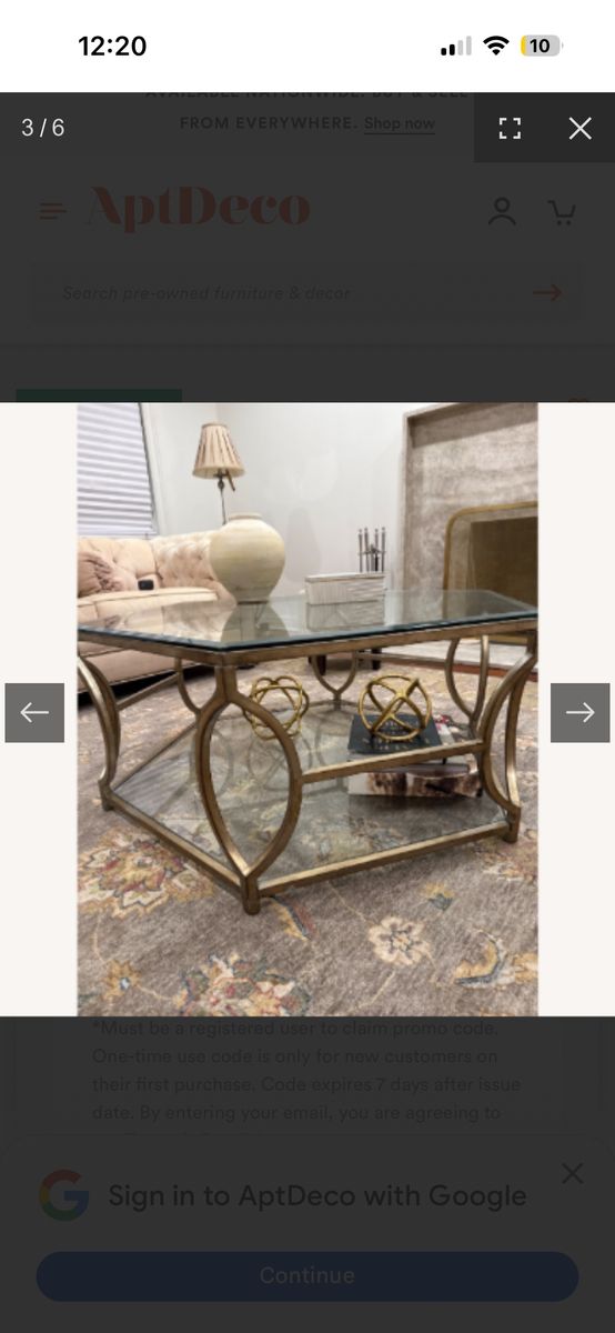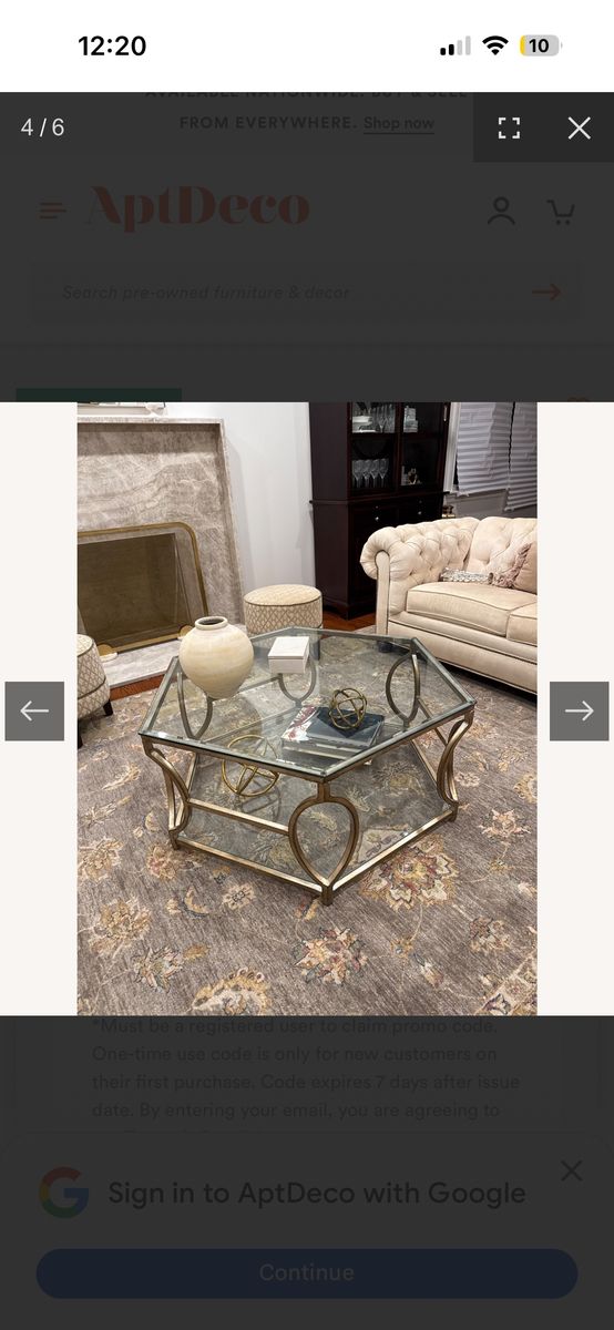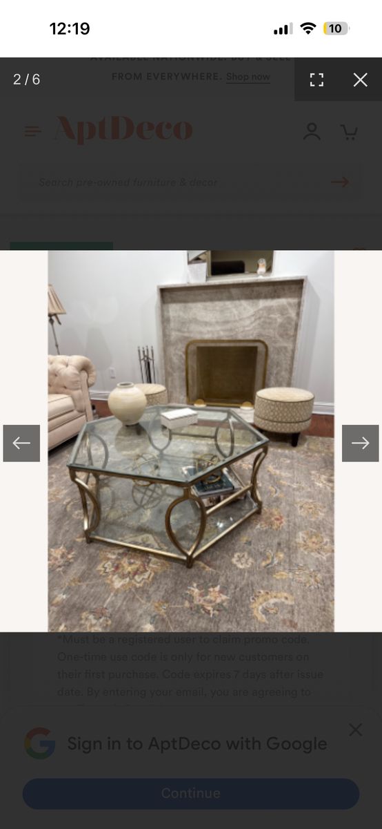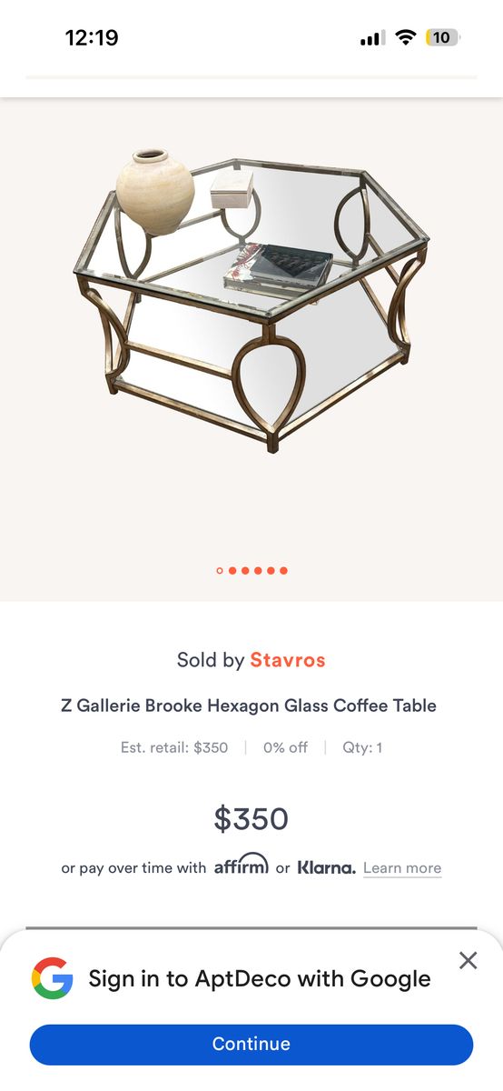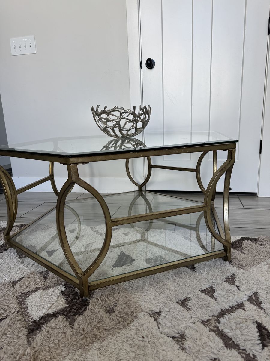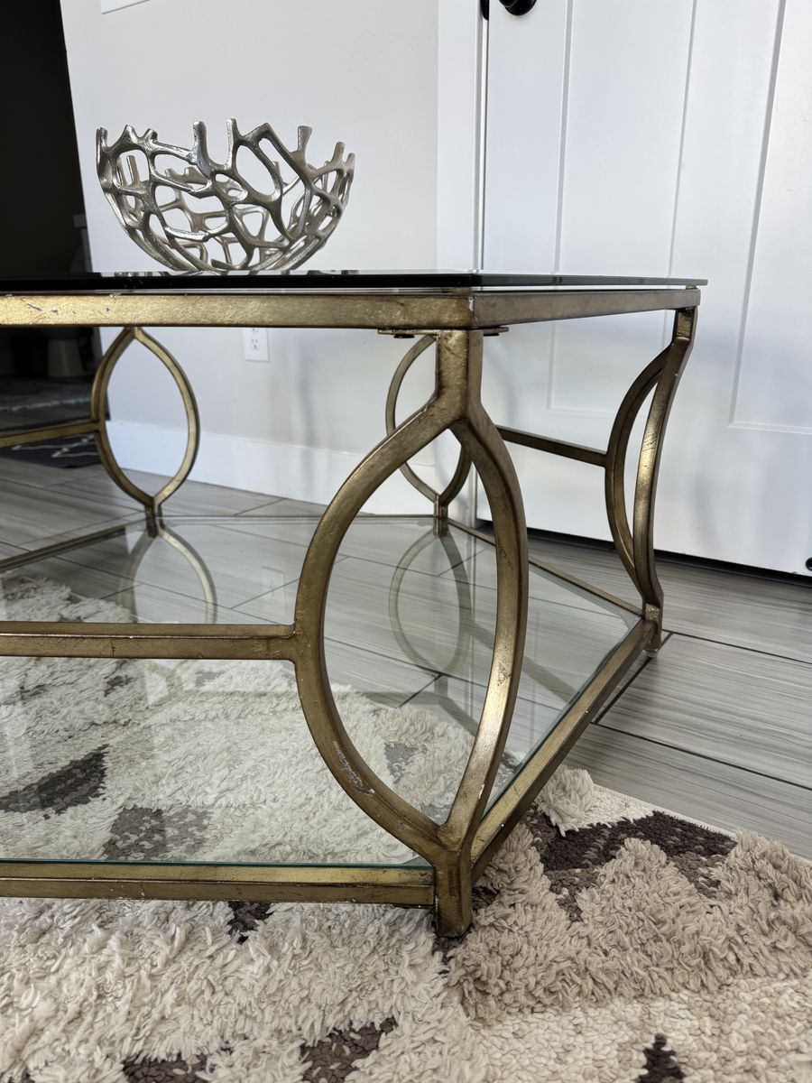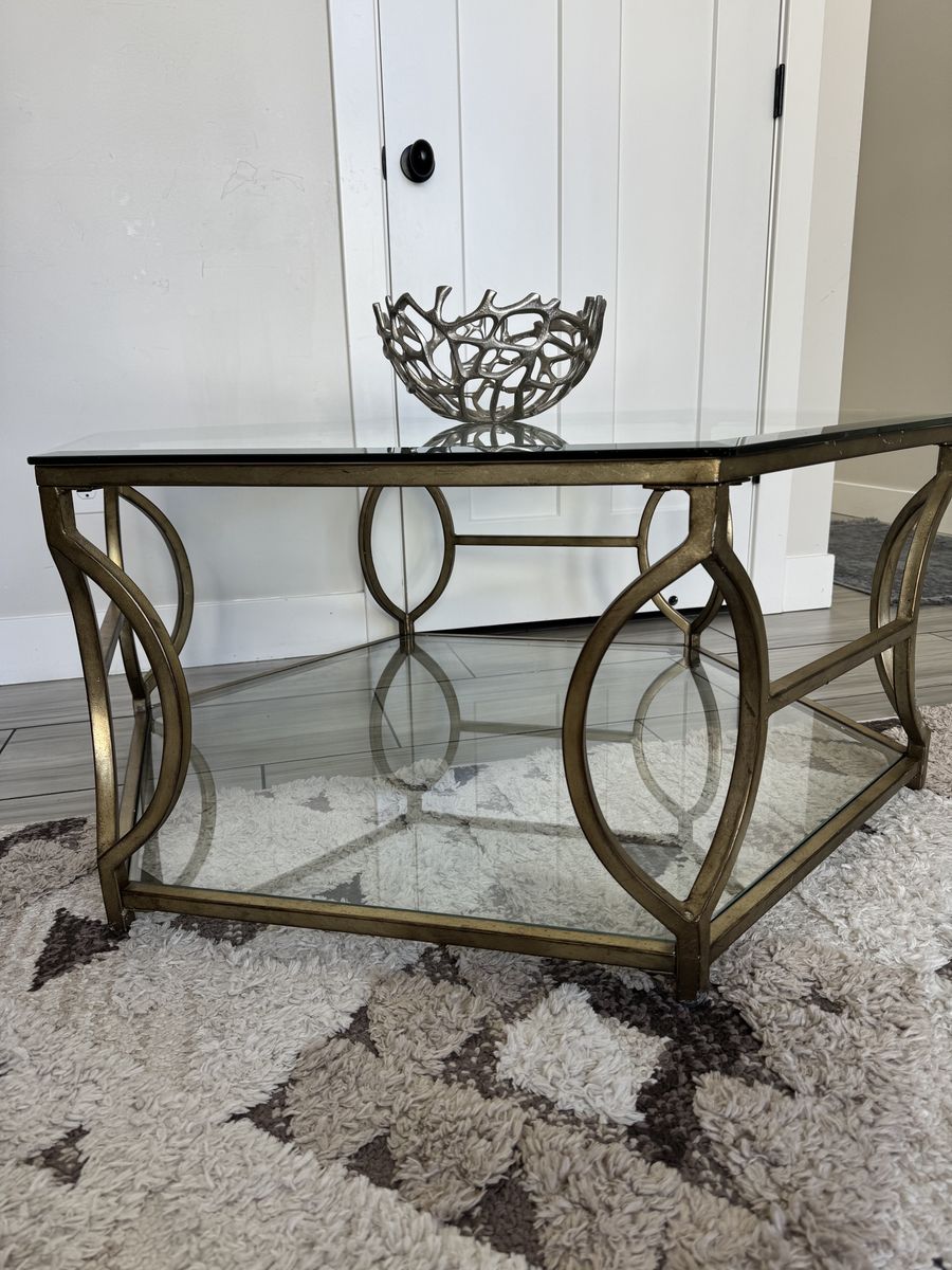 VenmoThis is a Z Gallerie Brooke Hexagon Glass Coffee Table featuring a metal frame with a soft champagne finish