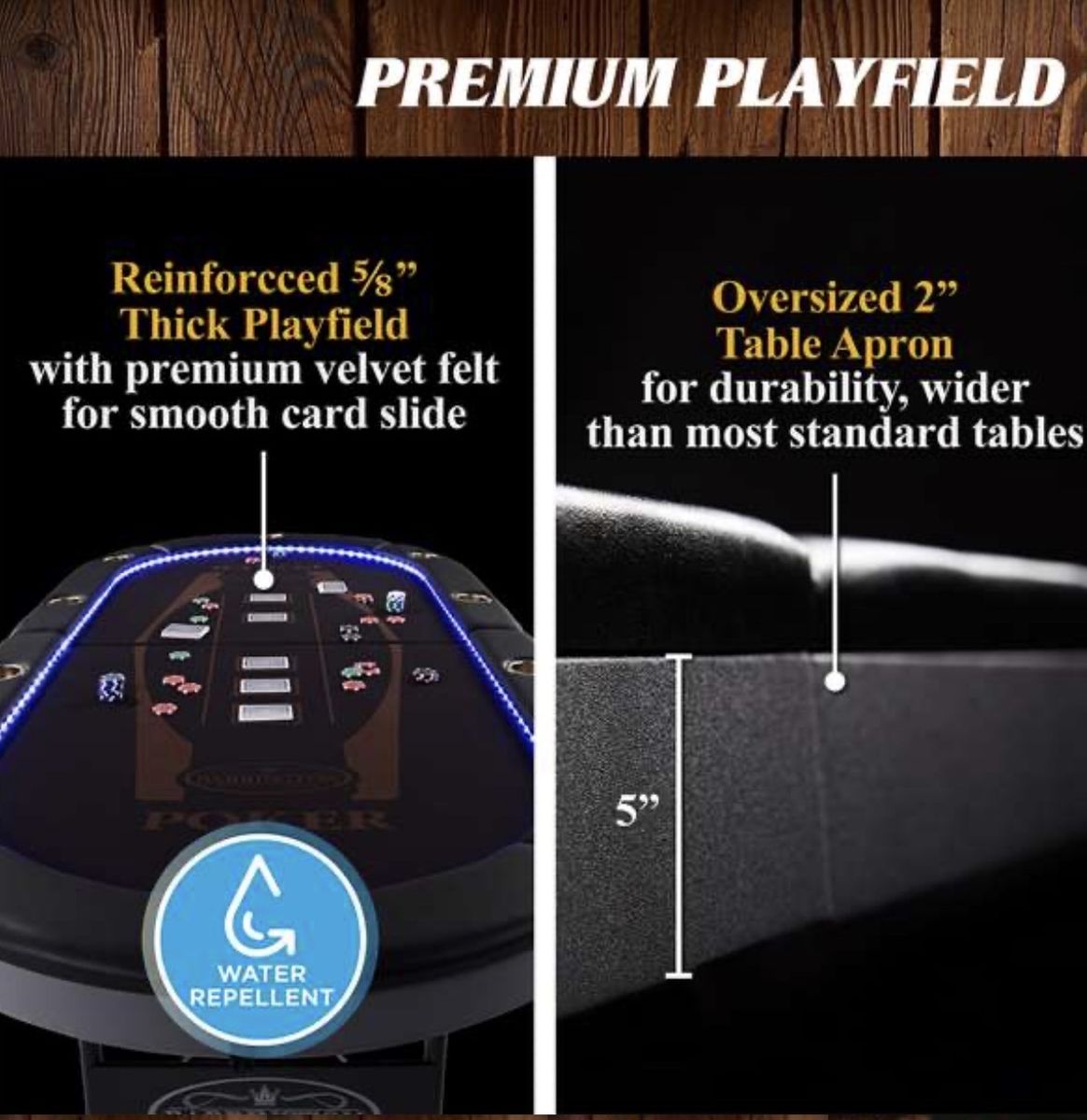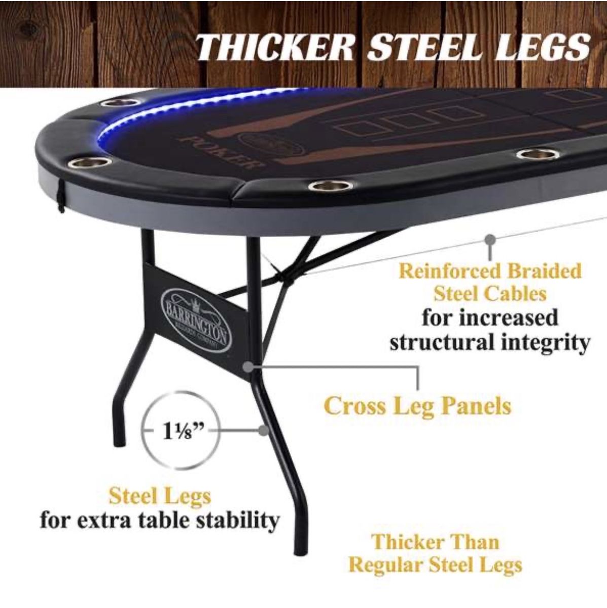 • Seating for 10 players with cushioned armrests • In‑laid LED lights for atmosphere and fun night‑time play • Built‑in steel cup holders around the table • Firm felt play surface for smooth card play • Foldable design — stores easily under beds or in closets • Heavy‑duty steel legs and reinforced surface for stability • Great for Texas Hold ’em, Blackjack, or game nights with friends
