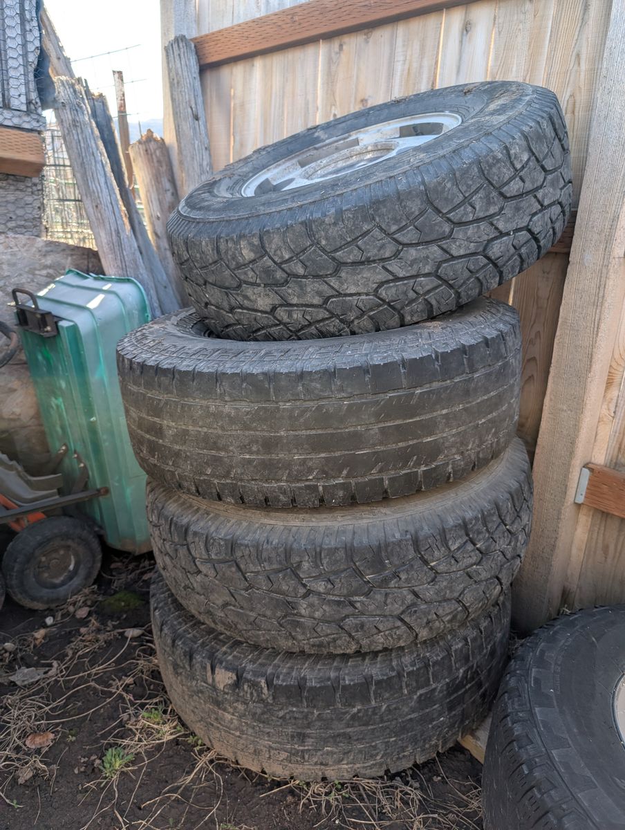 Off 1997 k1500. 6x5.5 or 6x139.7 lug pattern. 2 tires have better tread than the other 2, might be okay during the summer but gonna need new ones soon. I have the centercaps somewhere. I don't need them, shoot me and offer. OBO