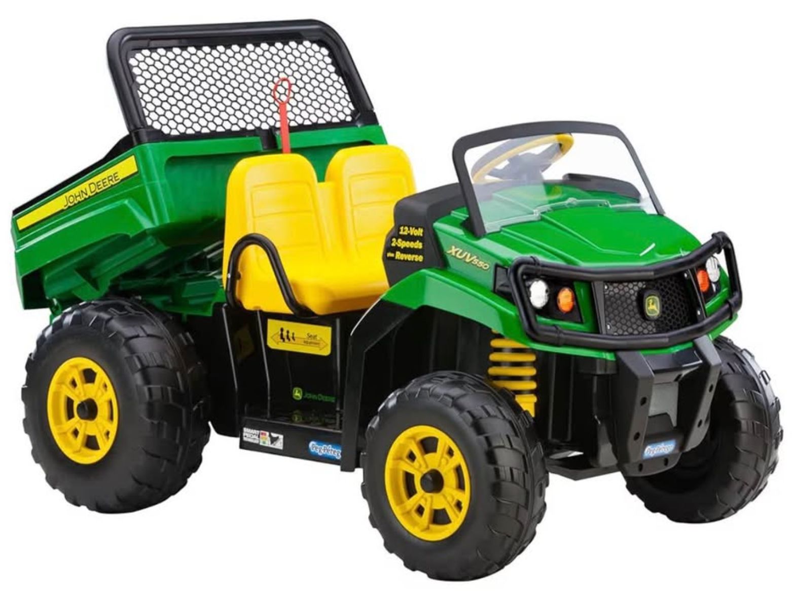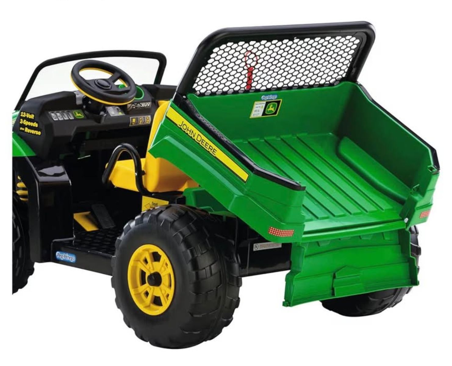 VenmoPerfect for little helpers! This Peg Perego John Deere Gator XUV hauls toys, leaves, and more—and fits two riders at once. Features a realistic design with a working dump bed and tailgate, plus automatic brakes for safety.