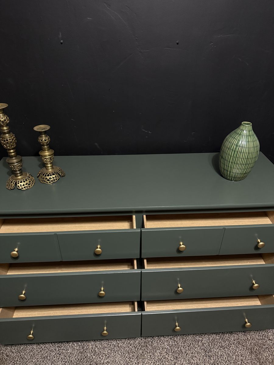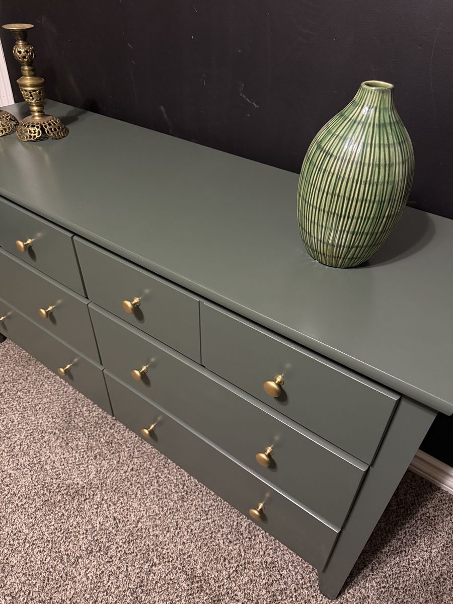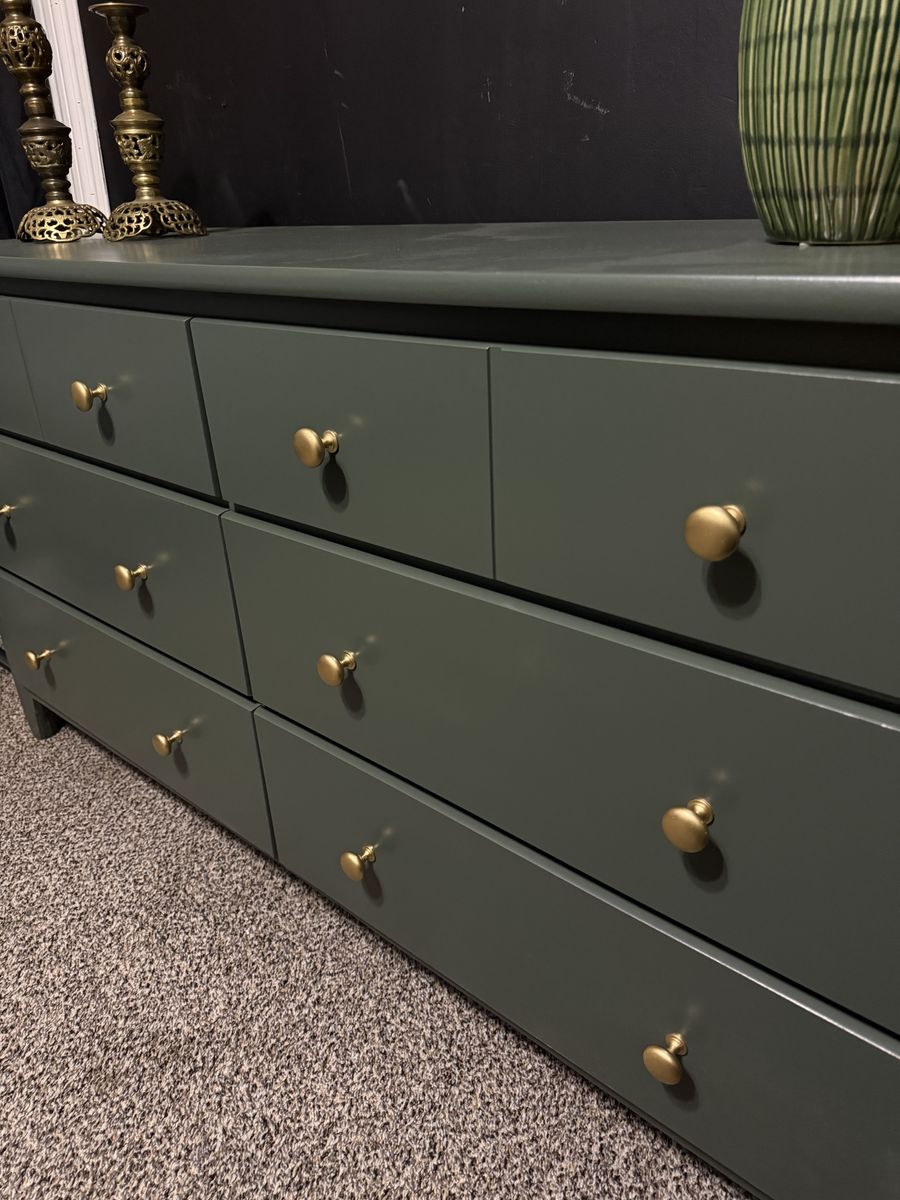VenmoLong dresser refinished in a dark green with gold knobs. Dresser has 6 perfectly functional drawers. Drawers run on original tracks.