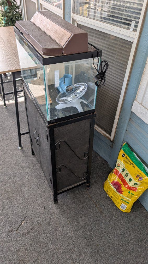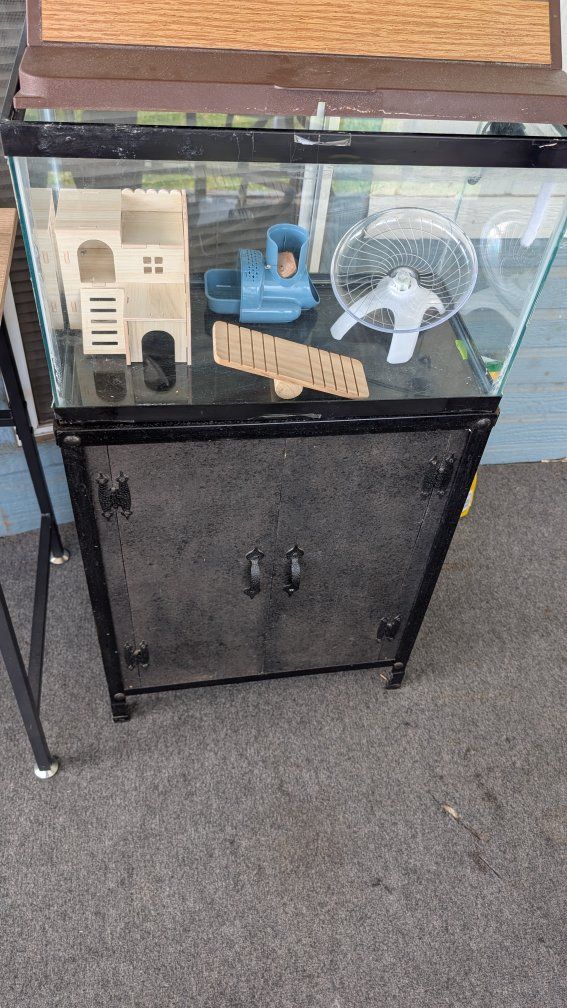 hamster cage and all kinds of goodies inside. able to have aquarium type lamp light on top. very nice setup with a stand is strong made o good metal and wood I'm sure you will be impressed with it's construction.. to keep your supplies in..only $25.00 385-460-3658