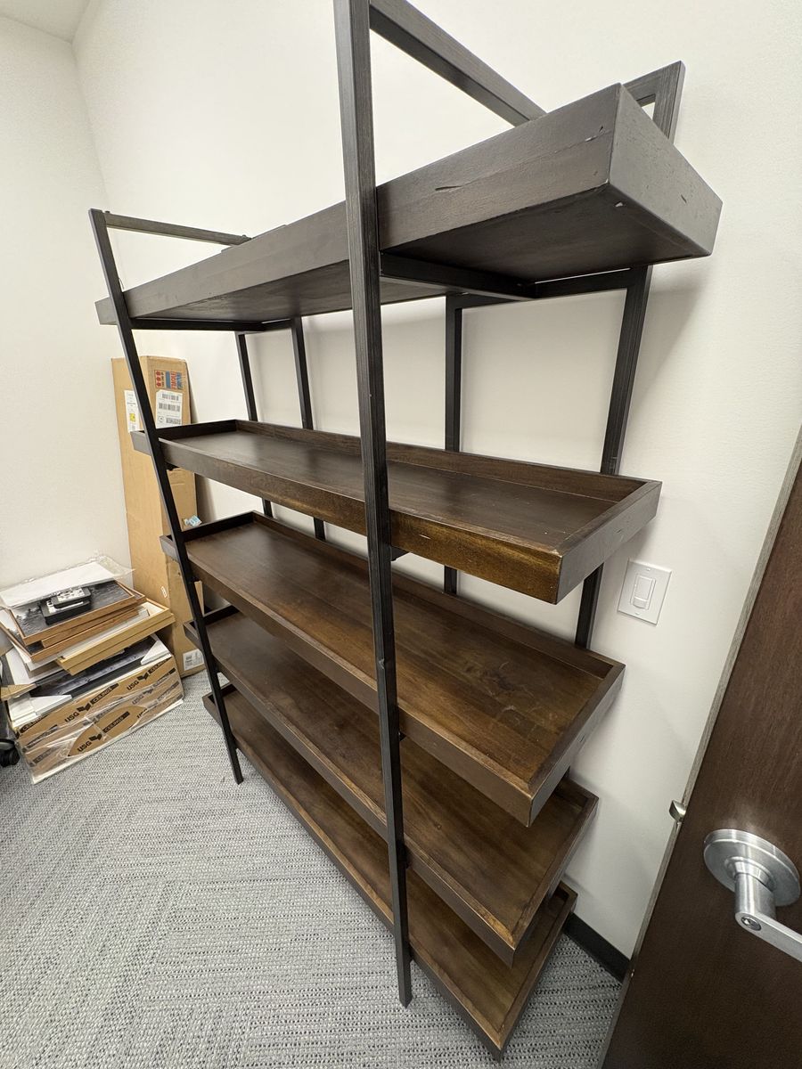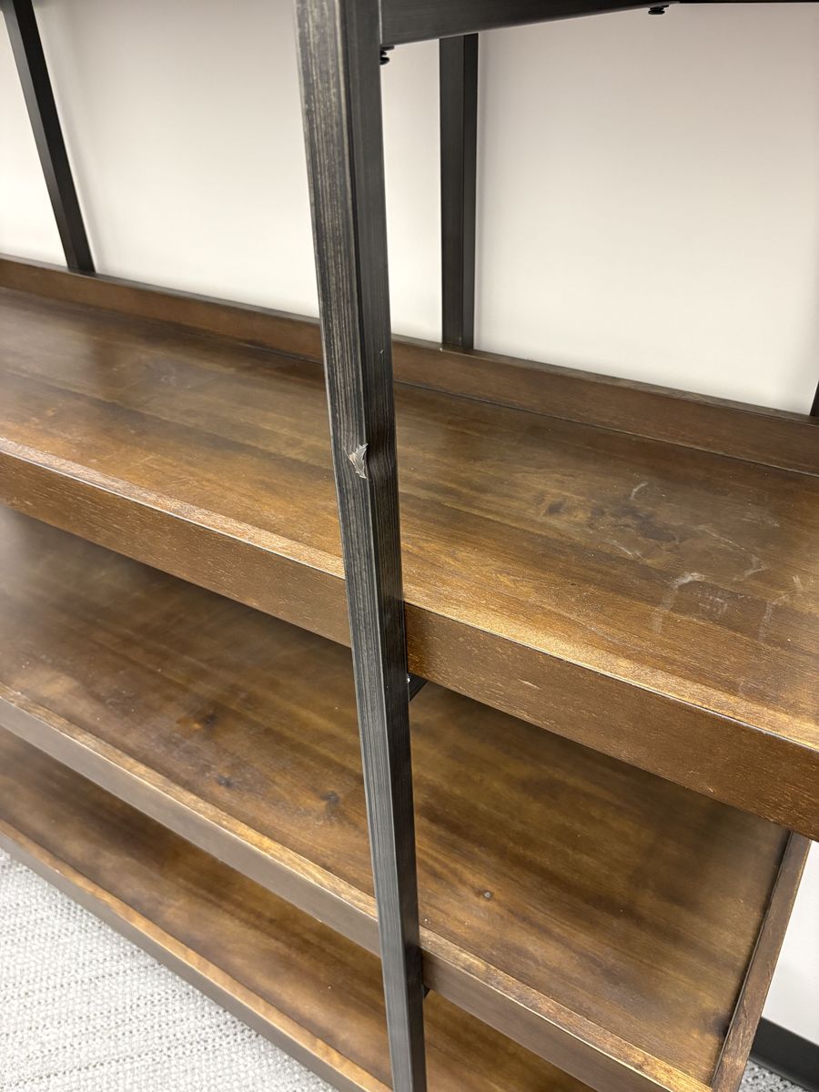 VenmoModern industrial-style bookshelf with a sturdy black metal frame and rich wood shelves. Great for a living room, office, or bedroom—adds a clean, upscale look while offering plenty of storage.