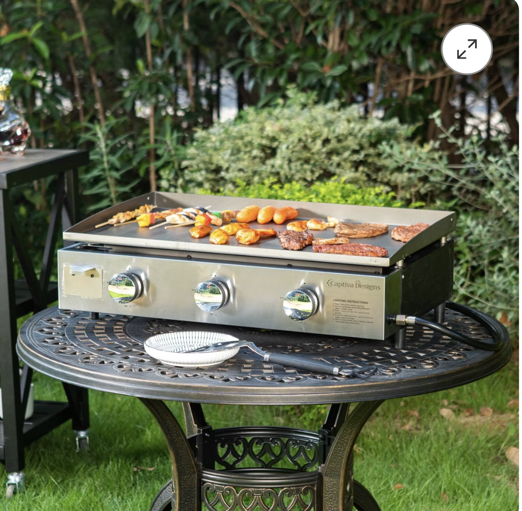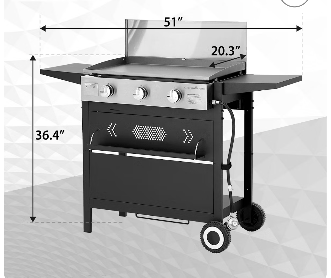 [CAPTIVA DESIGNS] Elevate your outdoor cooking with our versatile 3-Burner Portable Propane Gas Griddle. Its sleek black design allows for dual use as a portable tabletop griddle or a freestanding unit with a detachable cart. Powered by three burners delivering 33,000 BTU, this griddle ensures precise temperature control with its durable stainless steel panel.