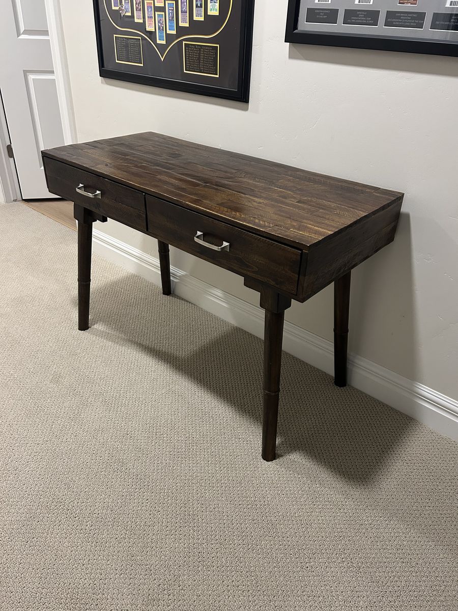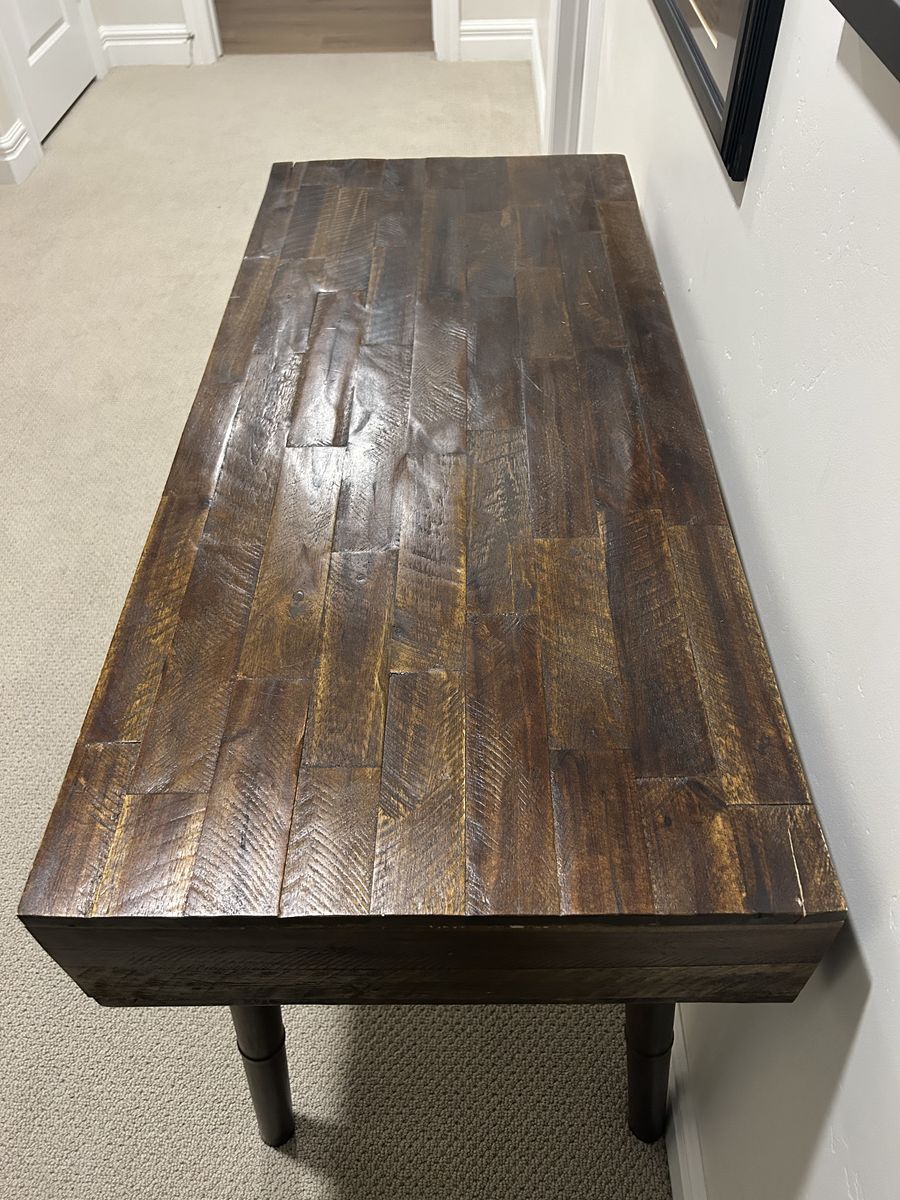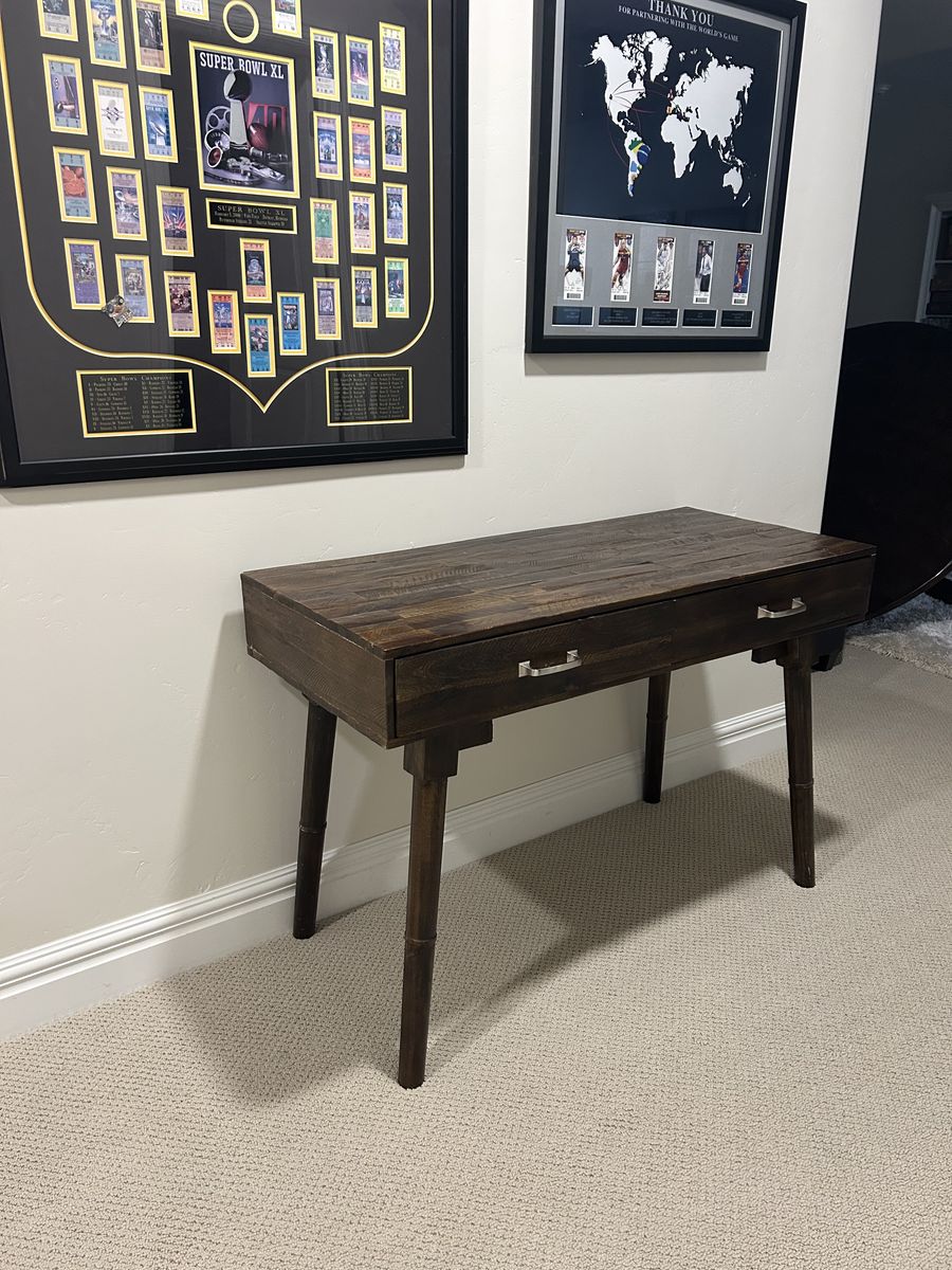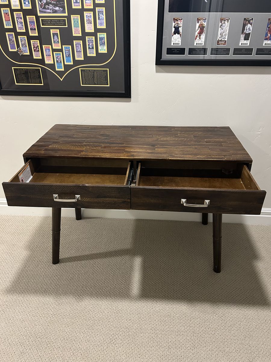 ApplePayReclaimed wood writers desk. Normal wear which blends nicely being made out of reclaimed wood. Solid desk. Dimension: 44” Wide x 29 1/2” Height x 19 1/2” Deep (21” Deep inc, drawer handles).
