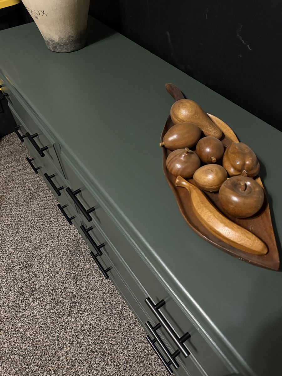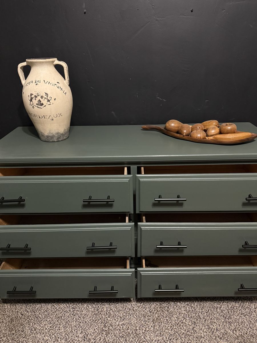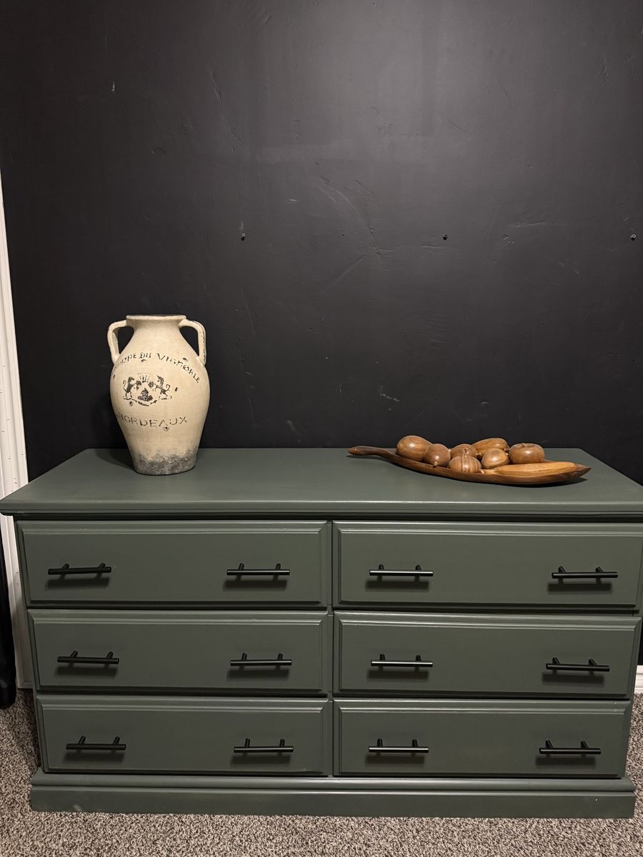 VenmoSolid wood dresser refinished in dark green with matte black pulls. Dresser has 6 drawers thats run on original wooden center track.
