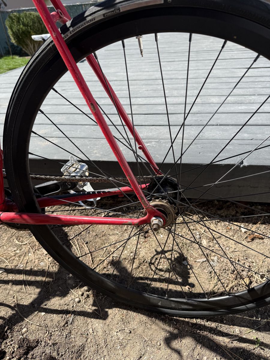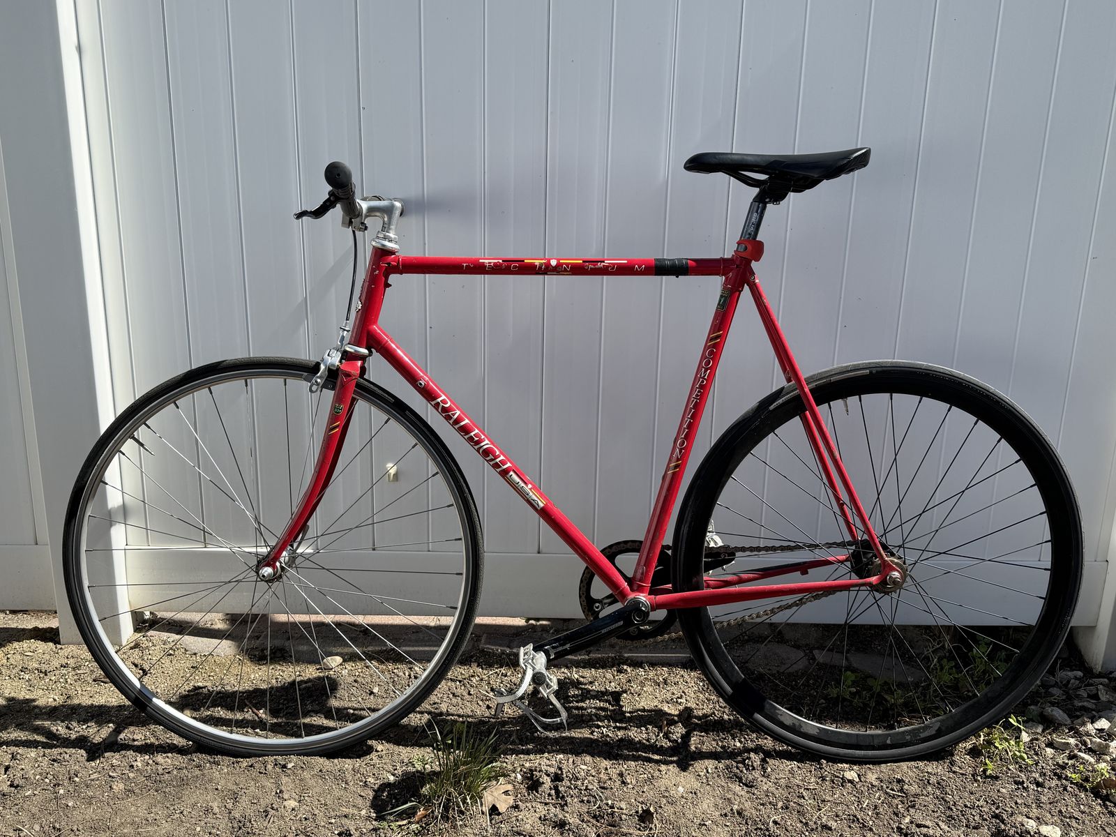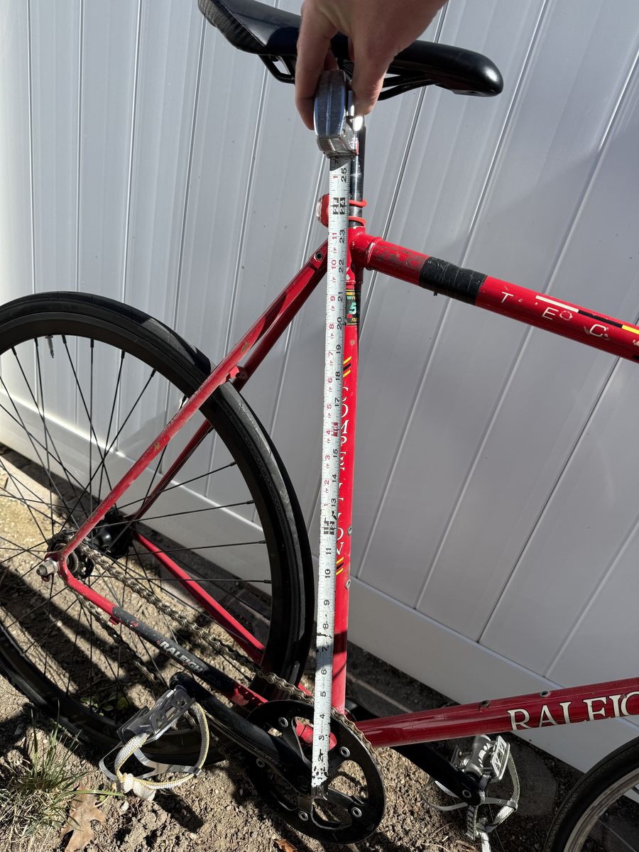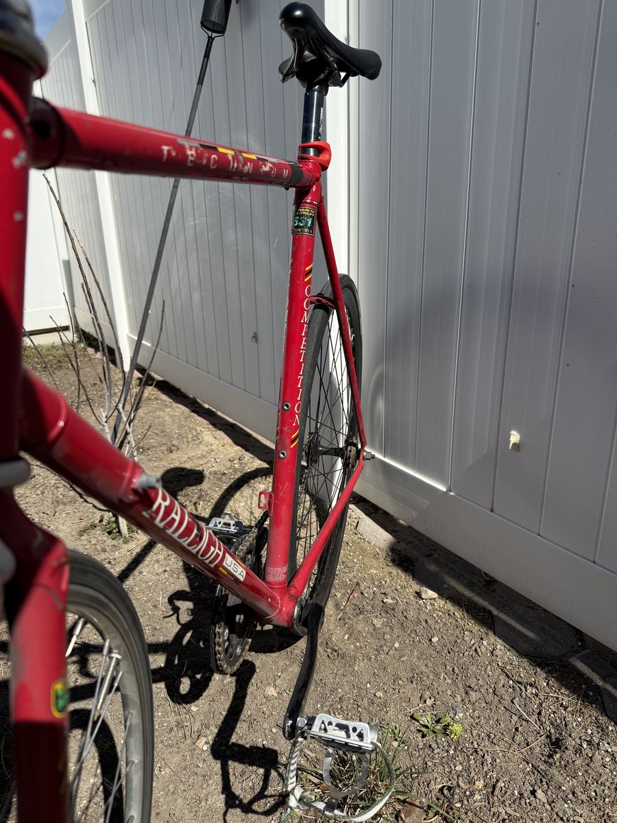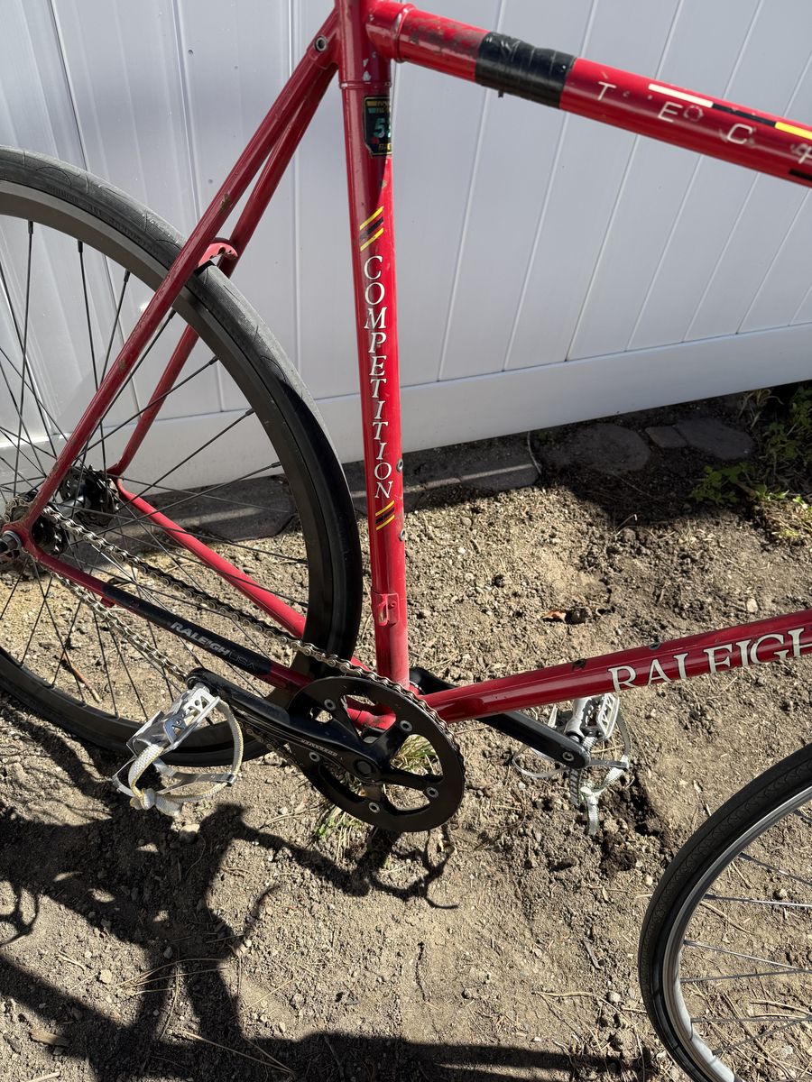 VenmoRaleigh Technium Competition 531 55cm CC Bicycle Frame USA Shimano 600 series hub Custom cages on pedals Rolls smoothly, ready to ride, fix gear with optional freewheel back hub. See photos for measurements of frame. I just haven’t had the need to ride this after the rebuild I did 2 years ago. $315 obo