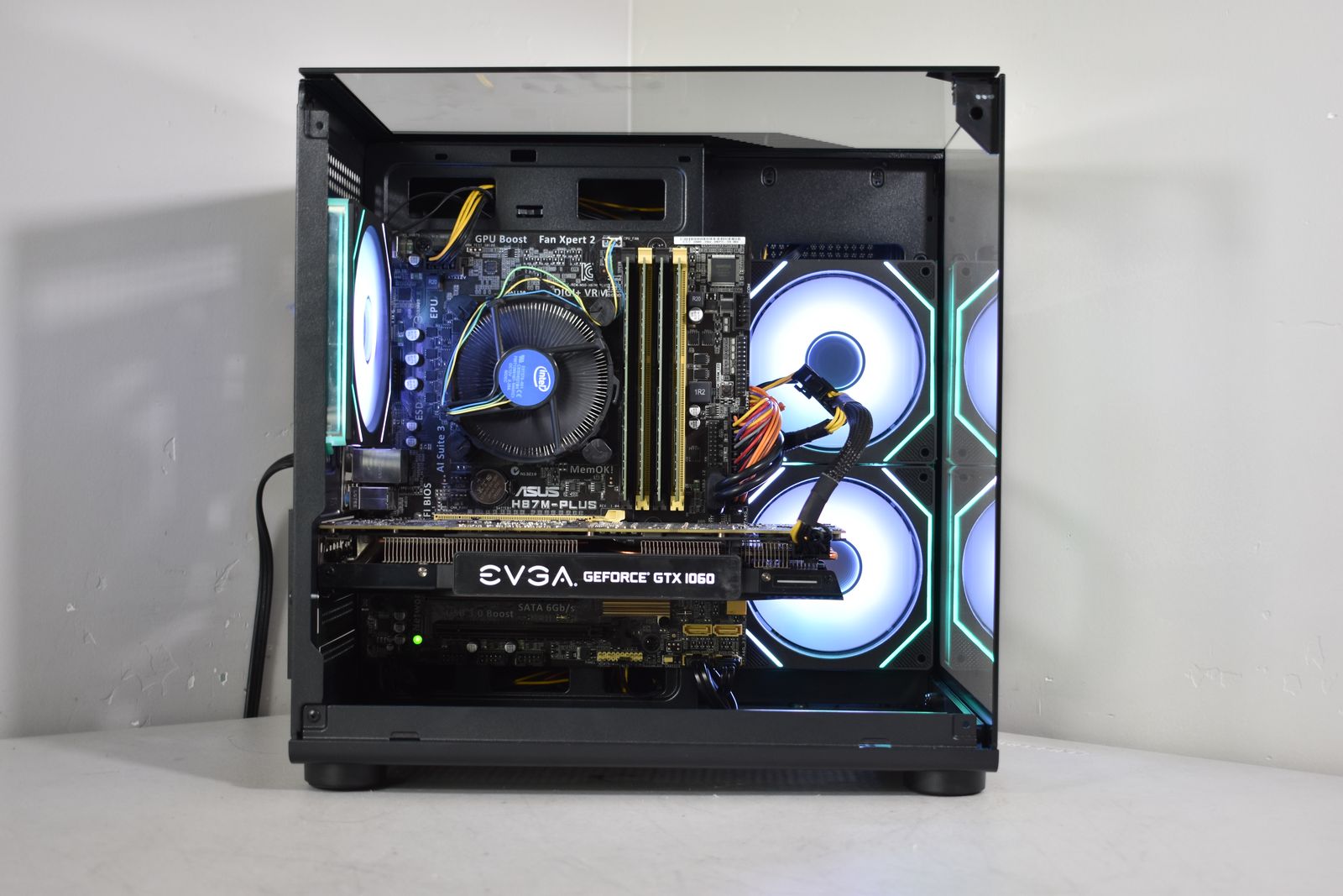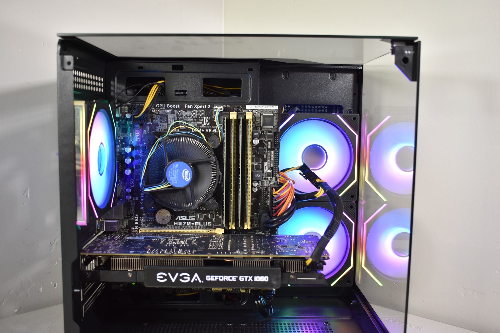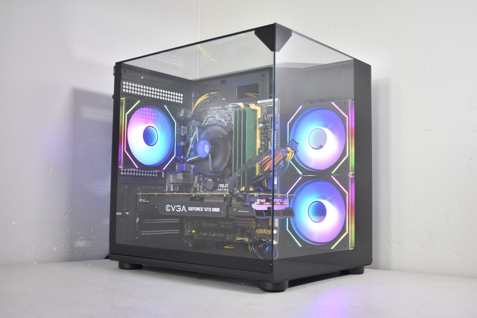 Case: DIYPC ARGB Tempered Glass Case! This case comes with 3x ARGB Fans. All ARGB is synced and controlled with a button on the top of the case with many many different lighting modes! .