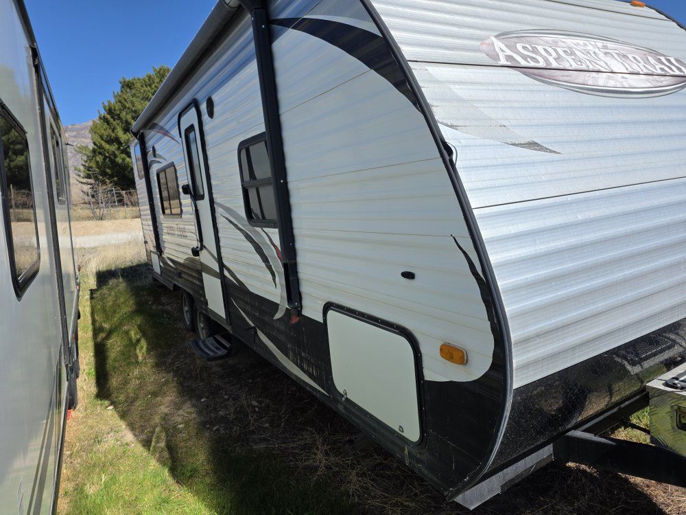 VenmoThe Aspen Trail 2710BH is a popular, lightweight, non-slideout travel trailer 27'8" designed for families, typically sleeping 6–8 people with double-over-double bunks. It features a private master bedroom, a dinette/sofa combination, and a full-width rear bathroom. It is often praised as a budget-friendly, towable option for large SUVs or trucks. Powered tongue jack, Powered awning, New queen sized memory foam mattress. 2-7 gallon propane tanks, 2 deep cycle batteries. 2710BH: Dry Weight: 4,700–4,800 lbs Length: 28' 7" Sleeping Capacity: Up to 8 or 10 Slideouts: 0 Holding Tanks: 52 gal Fresh / 42 gal Gray / 42 gal Black Common Features: Bunkhouse Layout: Double-sized bunks at the rear. Kitchen/Living: Three-burner stove, oven, microwave, double-door refrigerator, and jackknife sofa. Exterior: Pass-through storage, power awning with LED lights, and an enclosed underbelly. Construction: Aluminum siding, wood frame, and a walkable roof