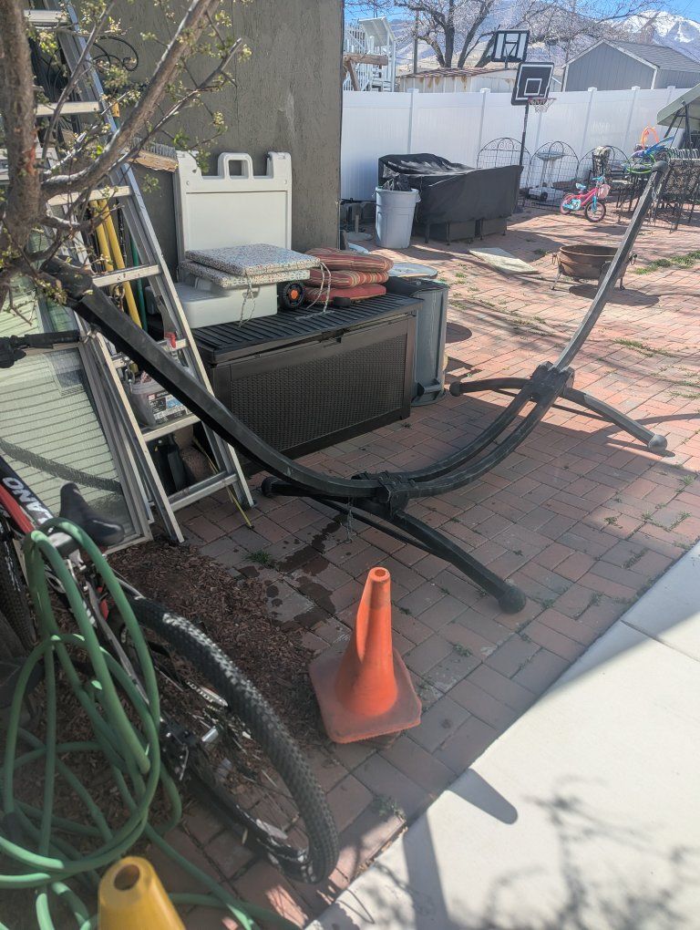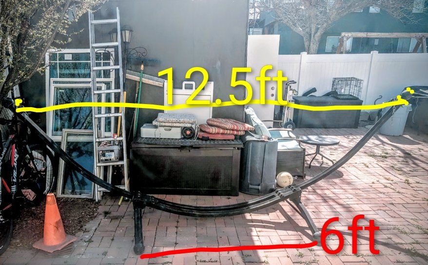 VenmoHammock frame, strong, sturdy, and heavy-duty. One piece. Does not disassemble. You will need a long bed truck or trailer to transport it. It measures 6 feet long between the base of the legs and 12.5 feet long between the top tips