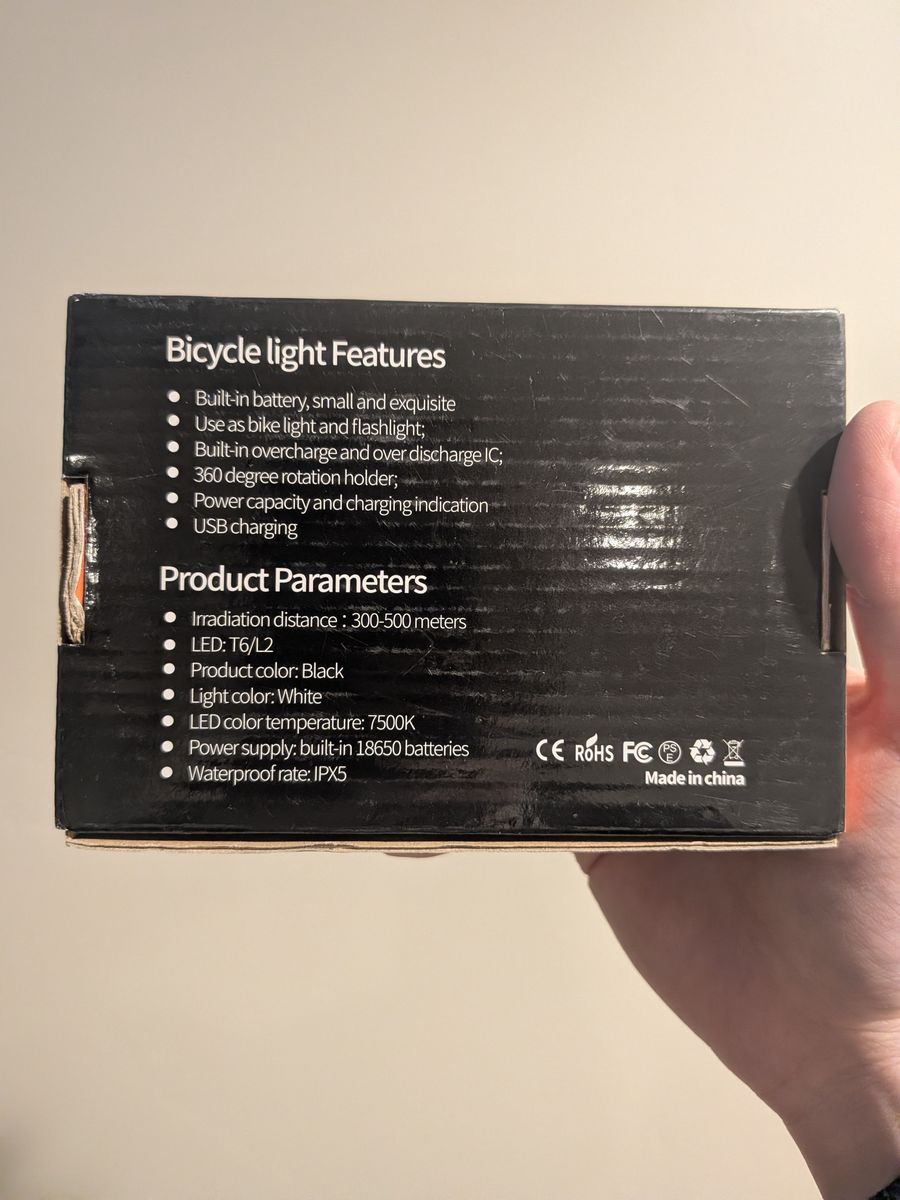 CashAppGeneric USB rechargeable bike light, IPX5 waterproof. Brand new. Bright enough for commuting or trail riding at dusk. Five bucks, hard to beat.