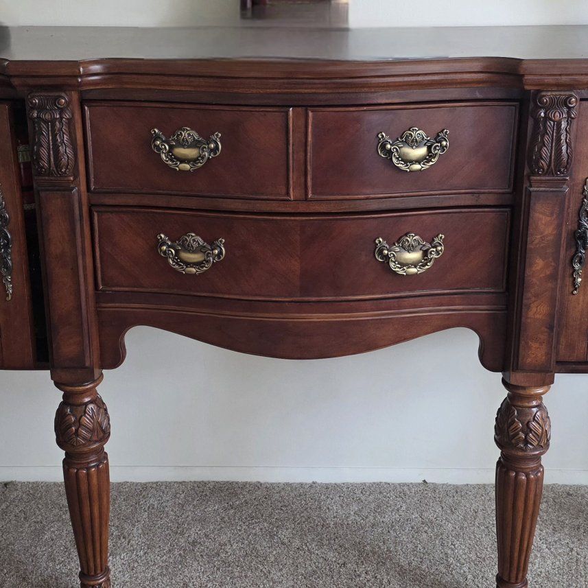 VenmoDark wood, ornate carvery, 2 side doors and 2 drawers. top drawer slots for silverware.