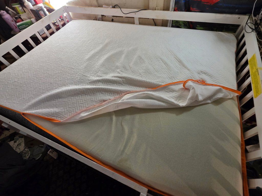 PayPalFull size, 10 inch memory foam mattress, small coffee spill on edge. Cover is removable and washer friendly. Used four months, excellent condition. no kids or pets have been on it.
