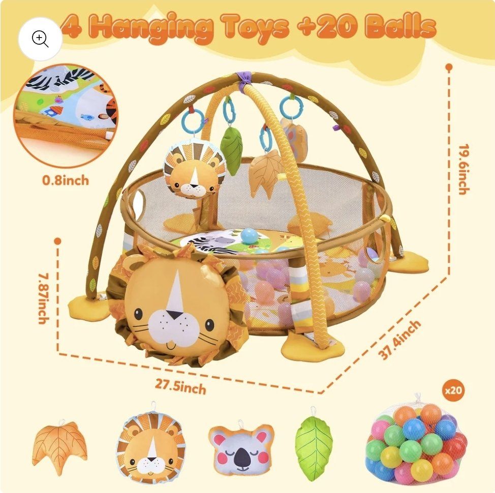 Measurements 27.5 x 19.5 x 37.5 in Includes 1x play mat / 1 x overhead arch / 4 x hanging toys / 4 x fixed rings / 20 x ocean balls