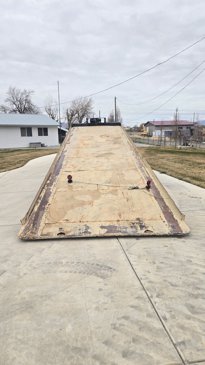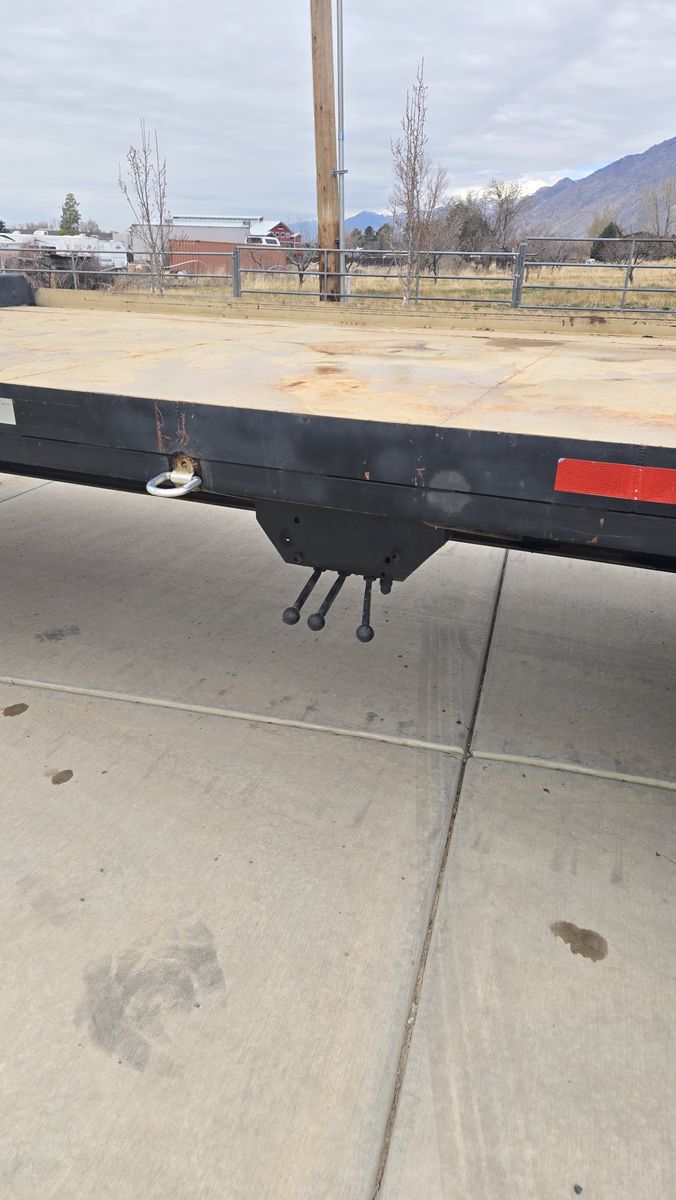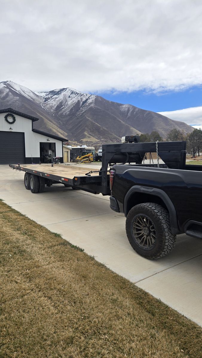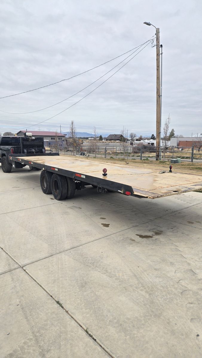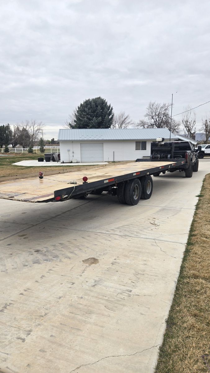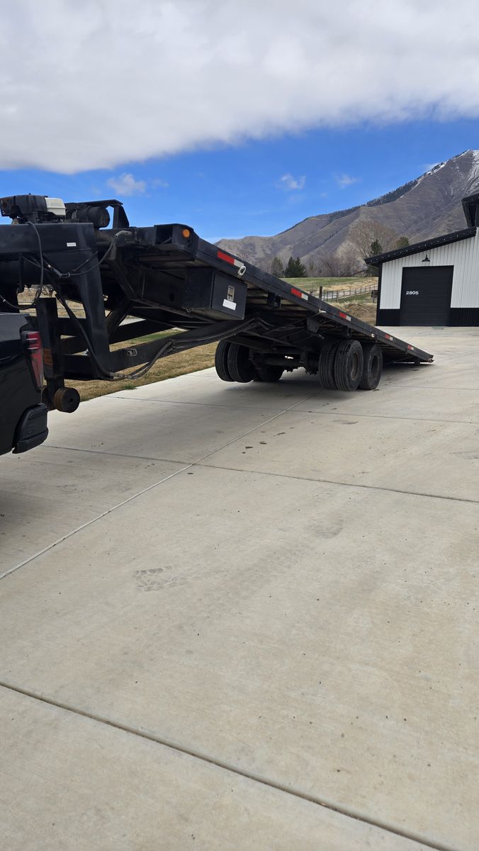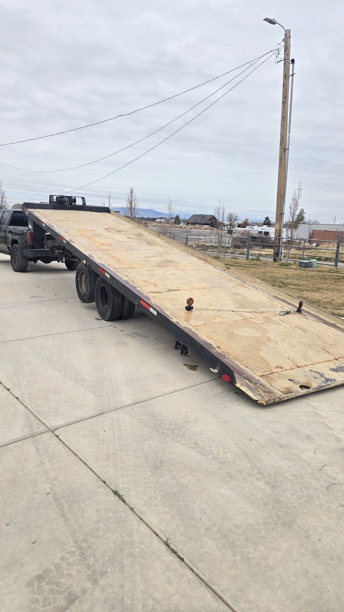 2001 full tilt and slide flat bed gooseneck trailer. 7' X 31' deck. Sliding axles,, trailer weighs 7,200 lbs. Hydraulic winch with synthetic rope. Heavy duty axles, 8 fairly new tires.