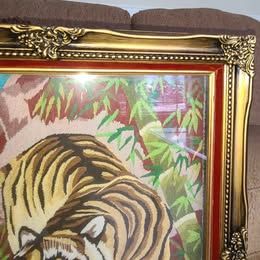 Vintage Needlepoint Tiger Framed Under Glass. This piece is fantastic and very unique. This was sent home from Taiwan in early 1970's. Beautifully framed and mounted under glass, frame shows wear otherwise this is in good condition. This one is done very well, and does not have a cheap look to it's design - You will have a hard time finding another piece like this for the price. This is vintage hand made art.
